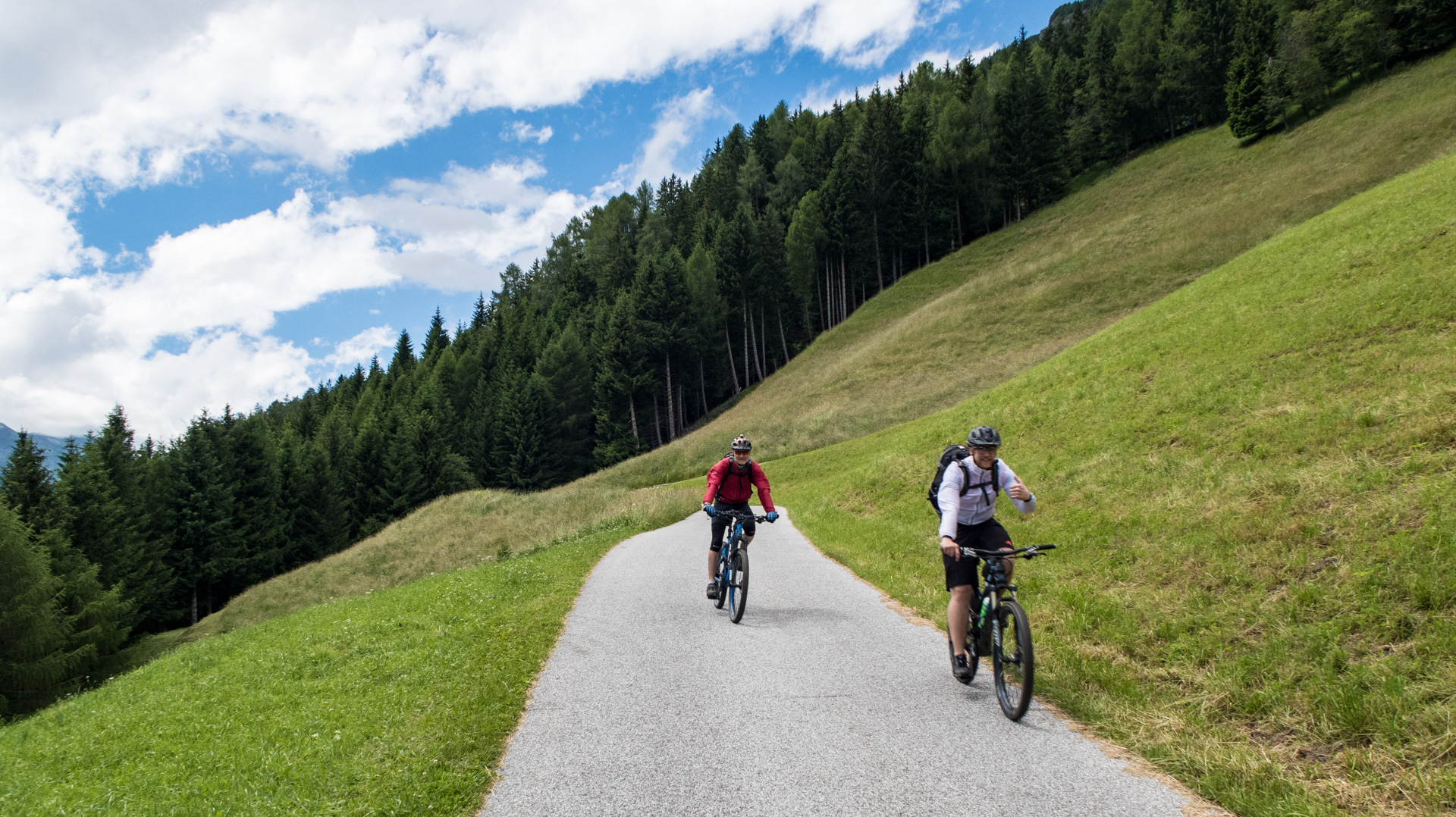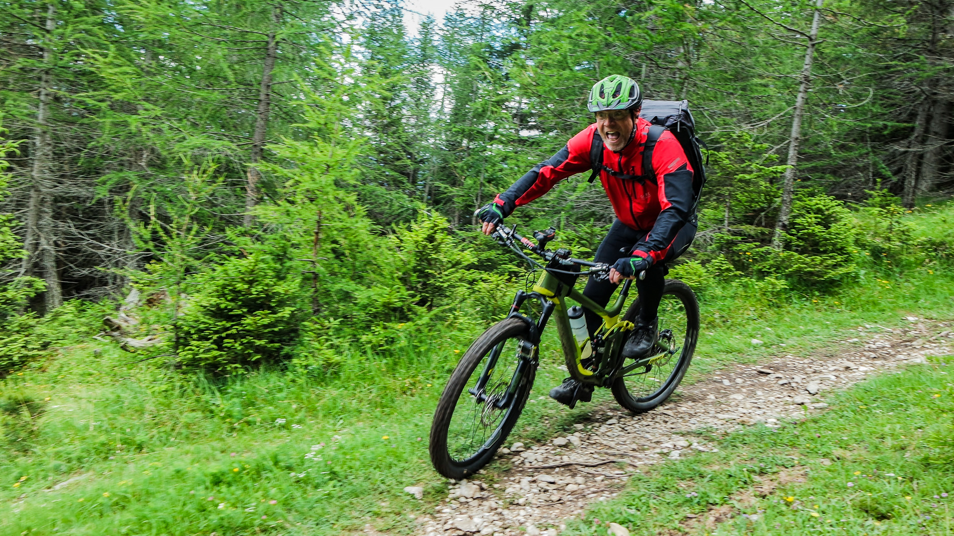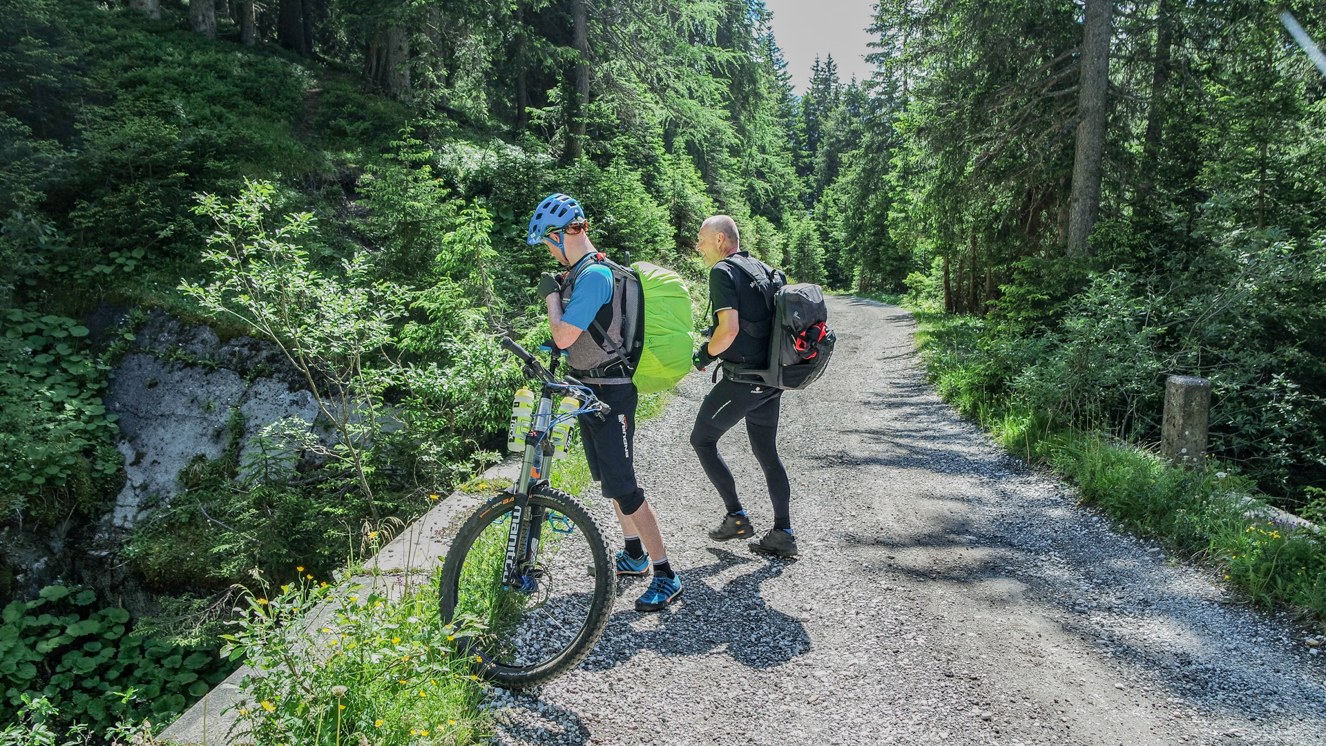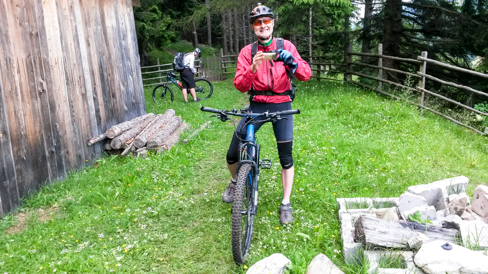Dieses Jahr fahren wir nicht den Schotterweg hinunter, sondern laut Internetrecherchen soll hier ein toller Trail nach unten führen. Und was soll ich sagen, es war traumhaft. Durch Wiesen und Wälder schlängelt sich der Pfad immer bergab und immer Fahrbar. Super!