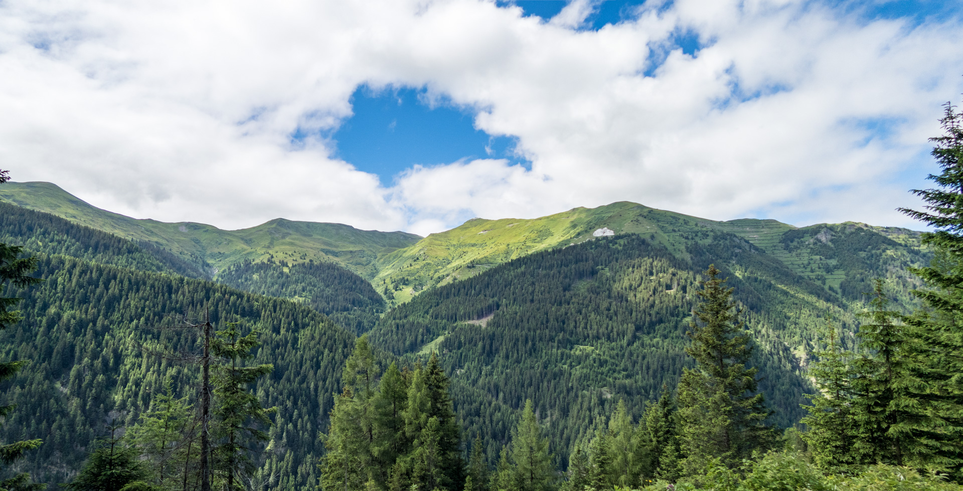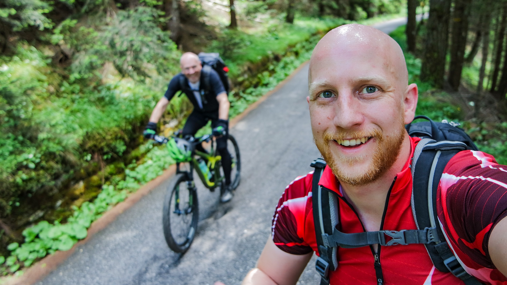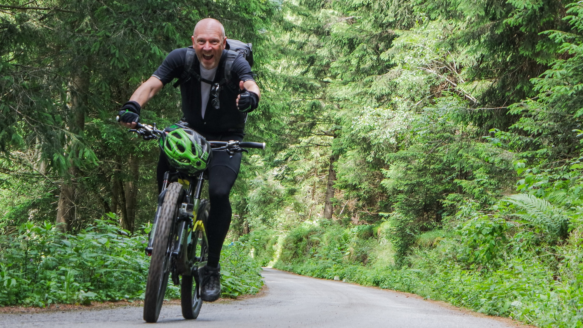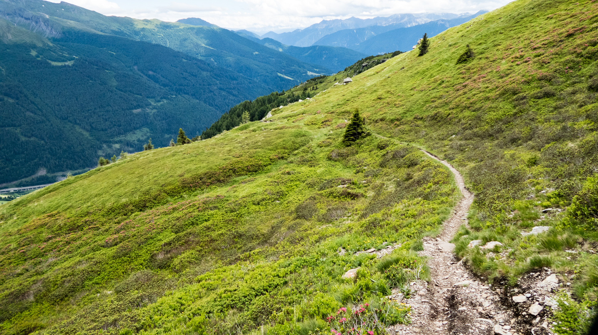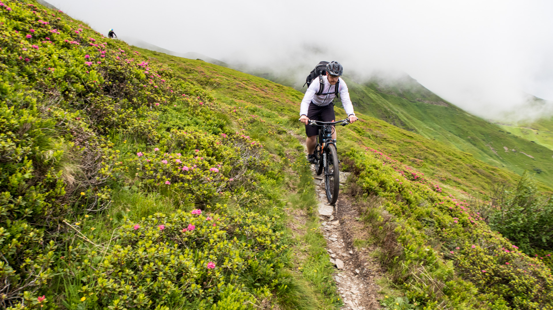 Dieses Jahr fahren wir nicht den Schotterweg hinunter, sondern laut Internetrecherchen soll hier ein toller Trail nach unten führen. Und was soll ich sagen, es war traumhaft. Durch Wiesen und Wälder schlängelt sich der Pfad immer bergab und immer Fahrbar. Super!