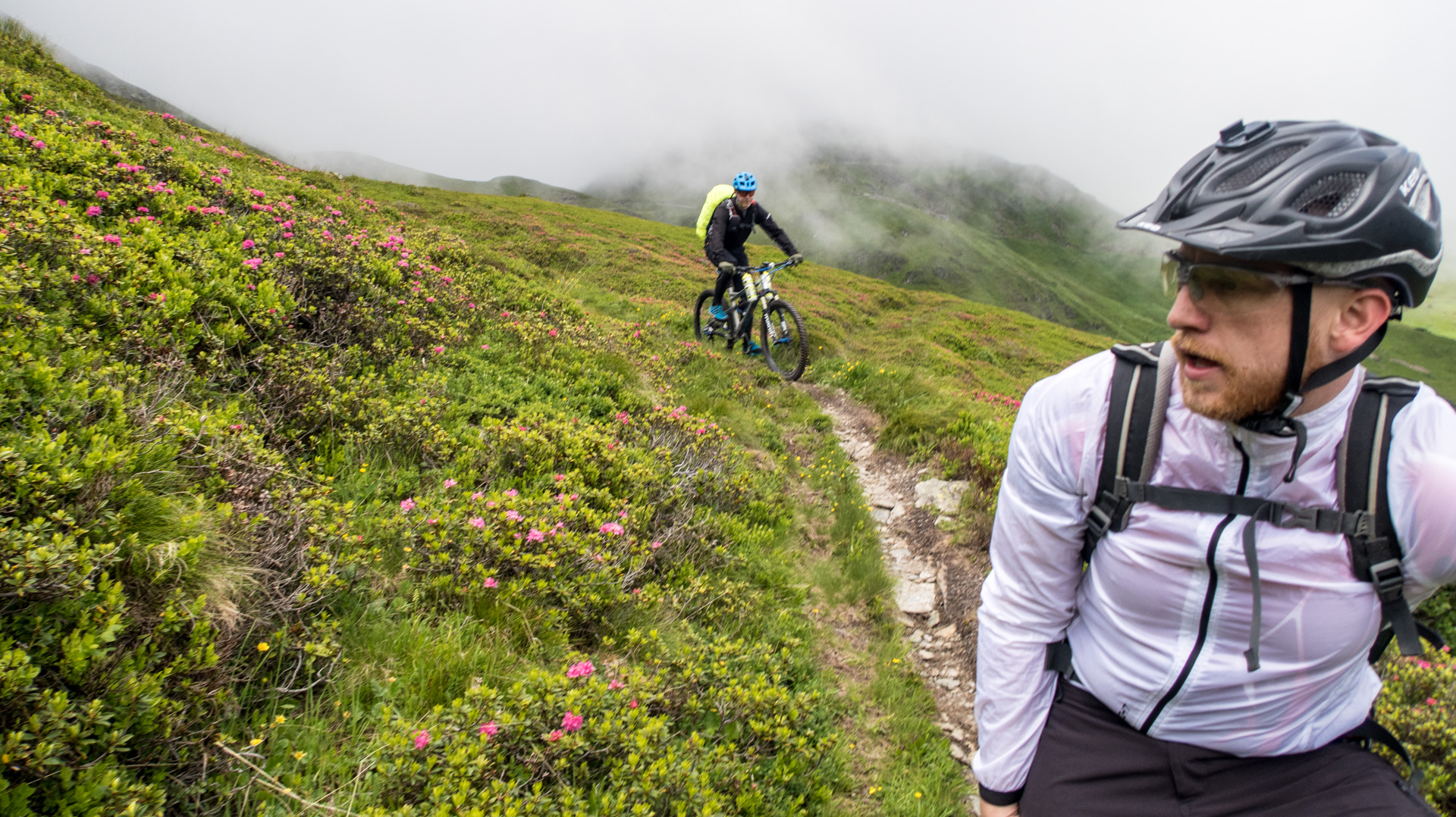 Teilweise steile Passagen, die uns zum Laufen zwingen, aber auch mein gesundheitlicher Zustand erlaubt es mir noch nicht, zu 100% zu fahren. Aber ab & zu Schieben ist ja auch nicht schlimm. Erste Sonnenstrahlen treffen wärmend auf uns, der Nebel löst sich langsam auf und dadurch wird das Panorama immer besser. Alles in allem ist diese Passage viel angenehmer als das sehr steile Schiebestück, das wir 2010 nehmen mussten. Es macht Spaß, ist natürlich auch anstrengend, aber die tolle Umgebung und das Erreichen des Gipfels lässt alles vergessen.