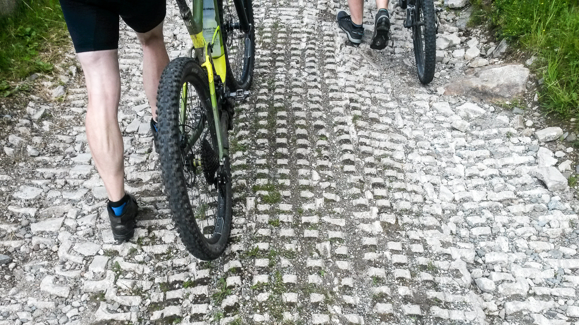 In Nalles finden wir doch tatsächlich einen „Ghost Bikeshop“, vielleicht eine gute Gelegenheit, die verlorene Schraube und Bremsbeläge kaufen zu können. Bremsbeläge ja, Schraube leider nicht, die ist zu speziell und pro Rahmentyp anders. Aber dank einer Behelfskonstruktion mit Kabelbinder haben wir die Schwinge so gut fixiert, dass das Ganze bis zum Gardasee gehalten hat. Nebenan finden wir noch einen kleinen Lebensmittelmarkt. Wasserflaschen & ein kühles Eis helfen uns weiter, denn es wird am späten Nachmittag noch mal schwer.