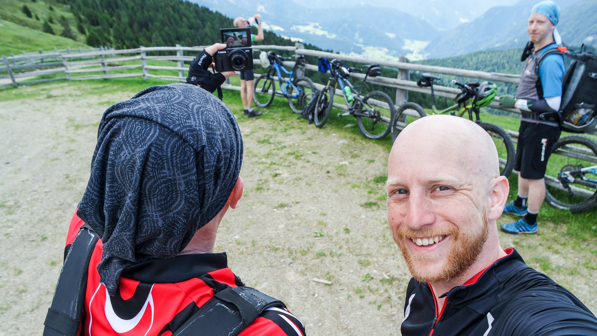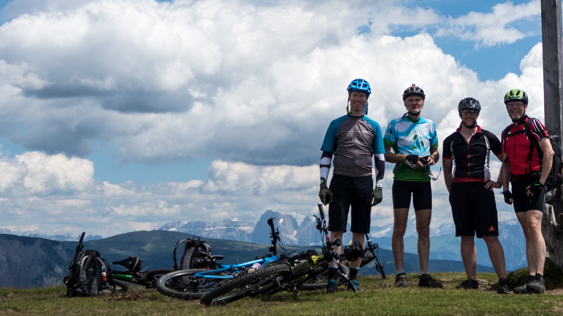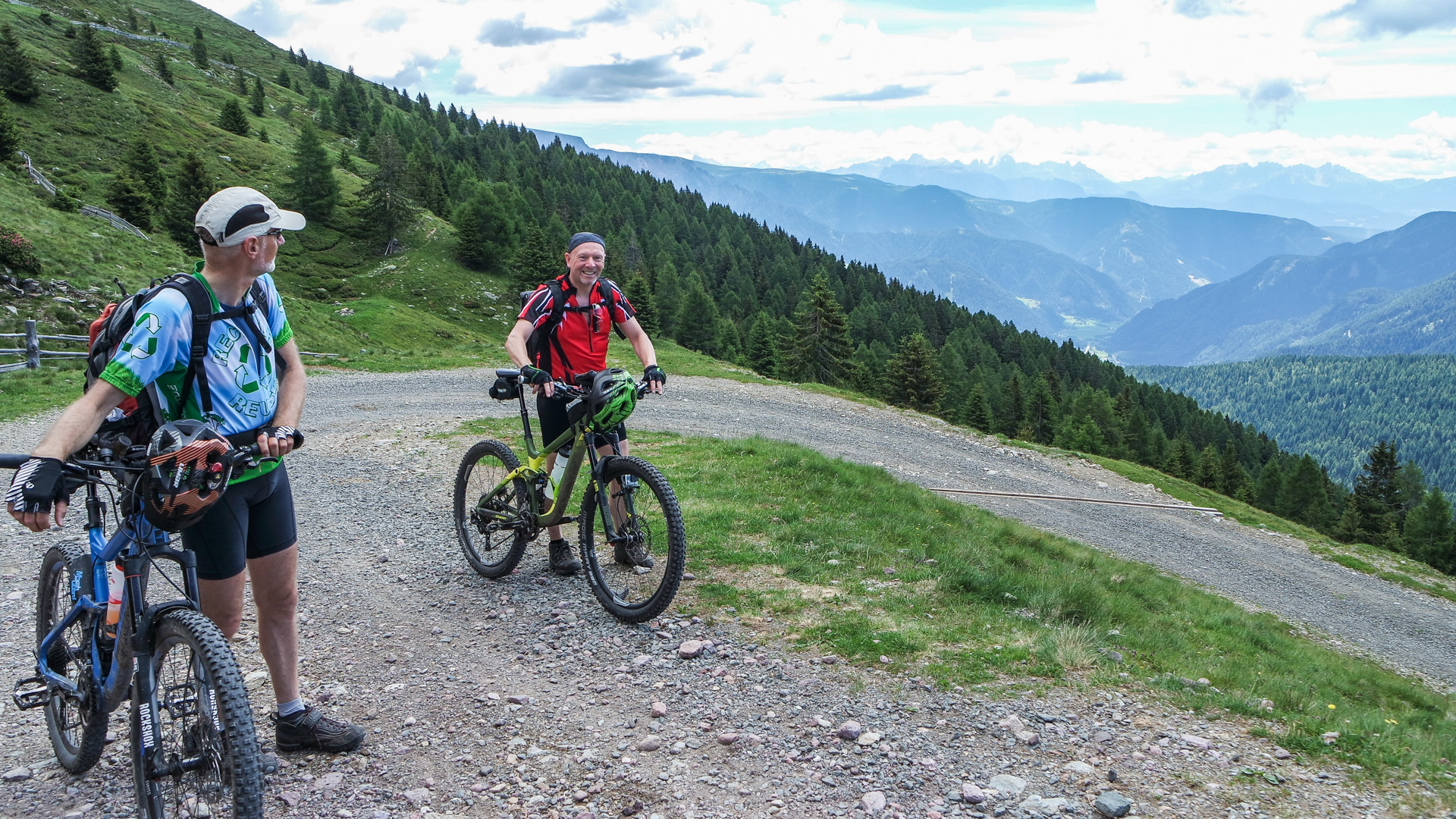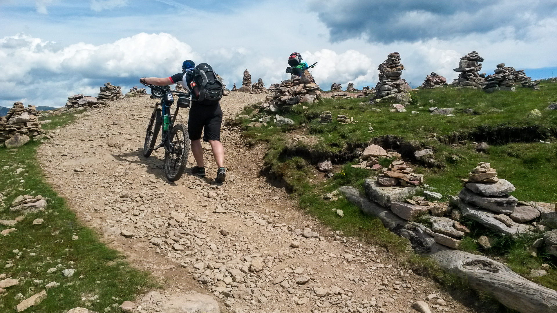 Fotos, ein Eintrag ins Gipfelbuch und dann geht es auch schon wieder weiter. Es geht bergab – und wie – coole Trails, teilweise sehr ausgesetzt, aber fast immer noch fahrbar. Dann wieder schnelle Schotterpassagen, Flowtrails und ruppiges Gestein. Das hat Spaß gemacht, war zwar auch anstrengend aber echt toll. 10 km und 880 Meter tiefer kommen wir in Mölten raus.
