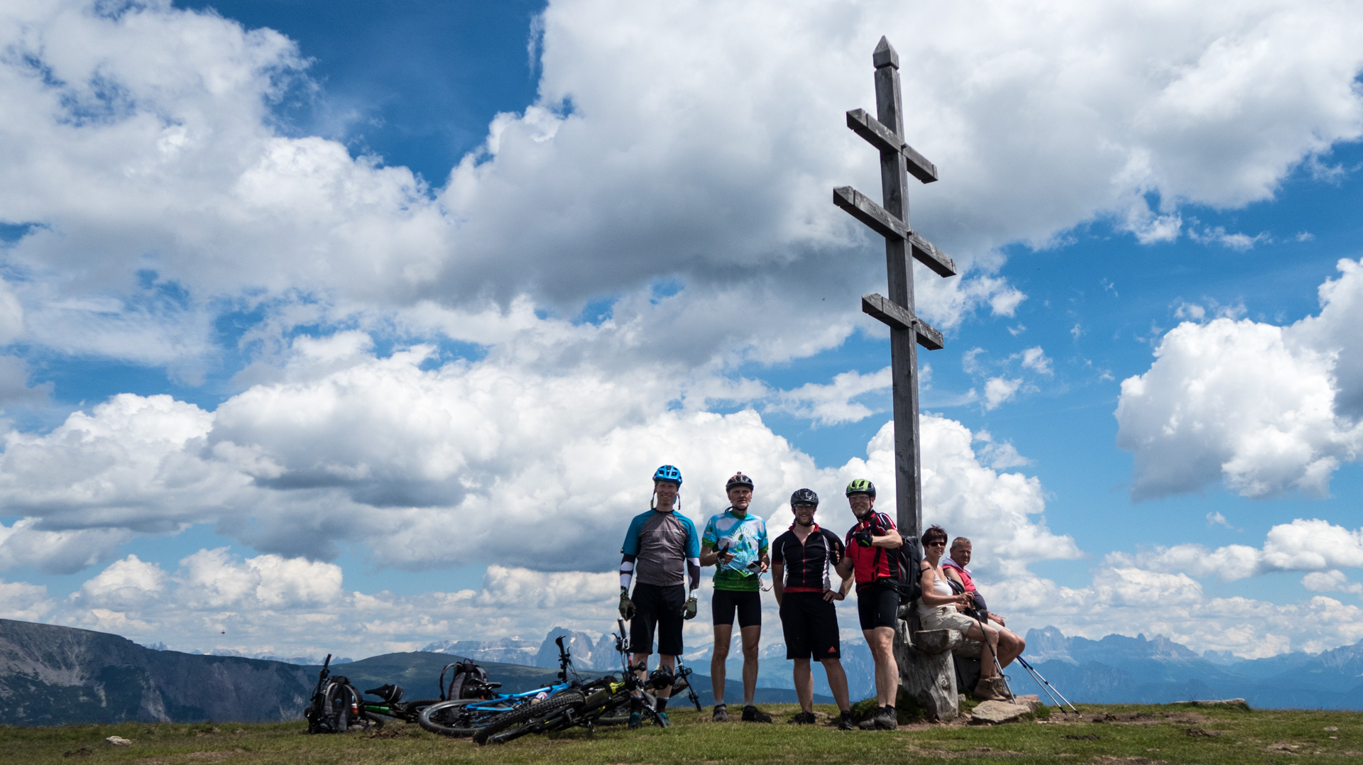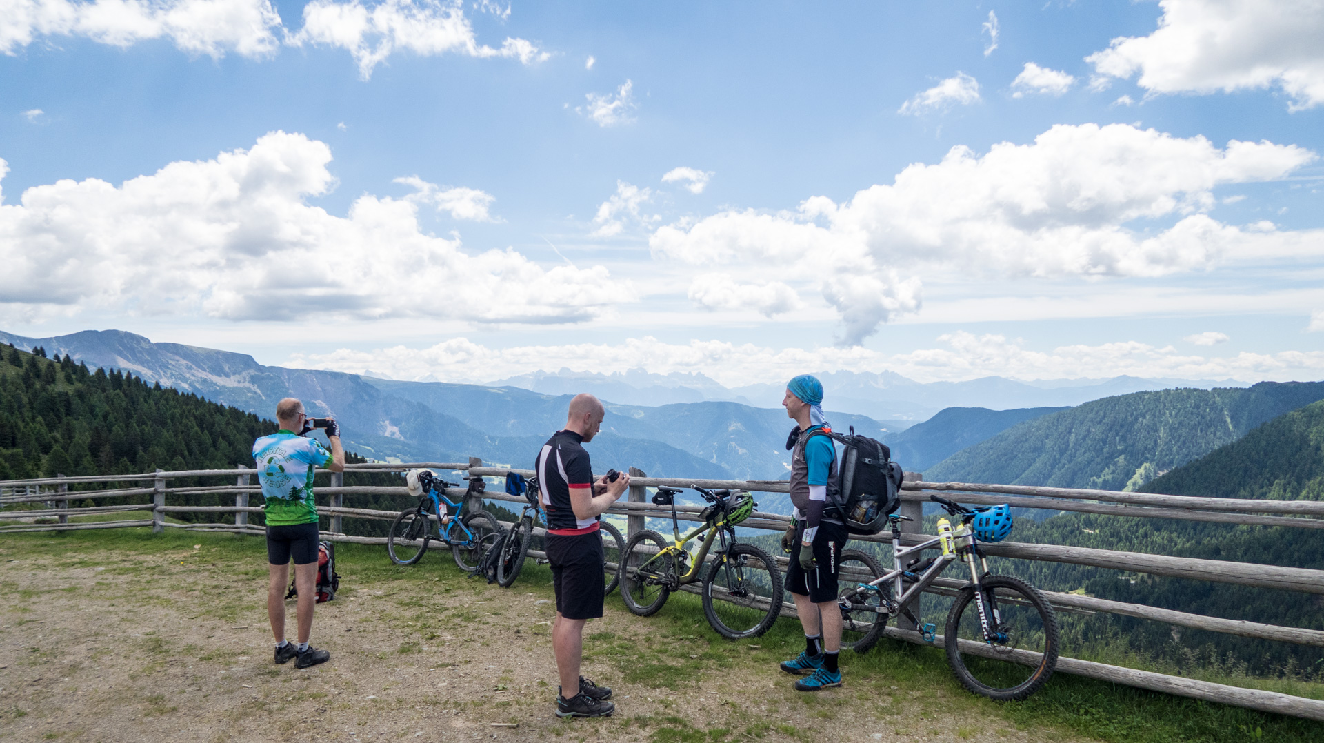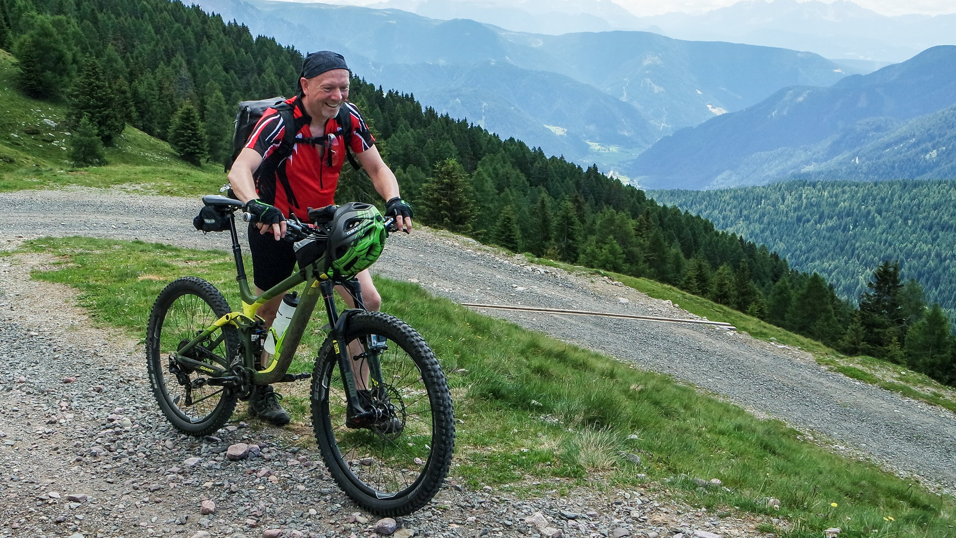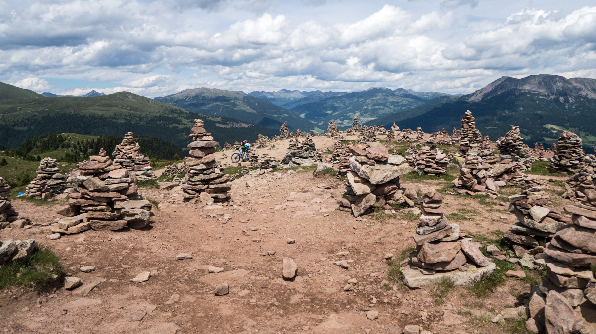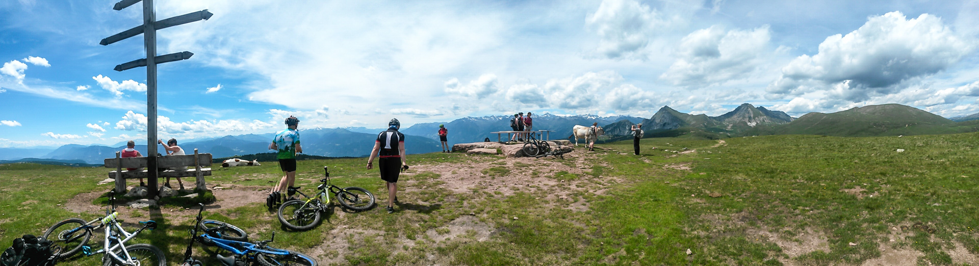 Fotos, ein Eintrag ins Gipfelbuch und dann geht es auch schon wieder weiter. Es geht bergab – und wie – coole Trails, teilweise sehr ausgesetzt, aber fast immer noch fahrbar. Dann wieder schnelle Schotterpassagen, Flowtrails und ruppiges Gestein. Das hat Spaß gemacht, war zwar auch anstrengend aber echt toll. 10 km und 880 Meter tiefer kommen wir in Mölten raus.