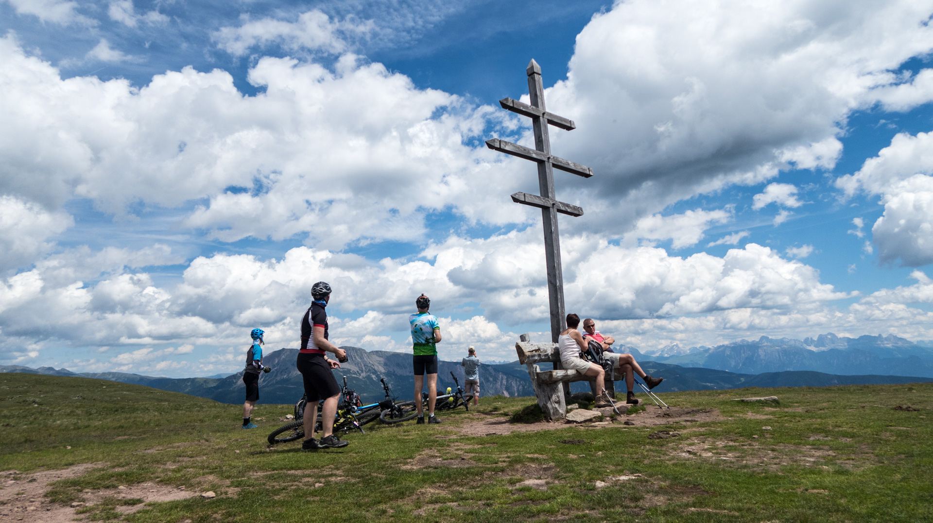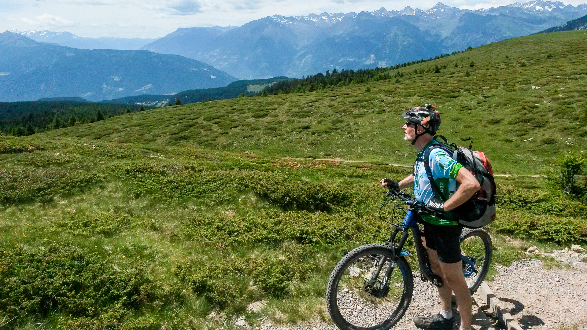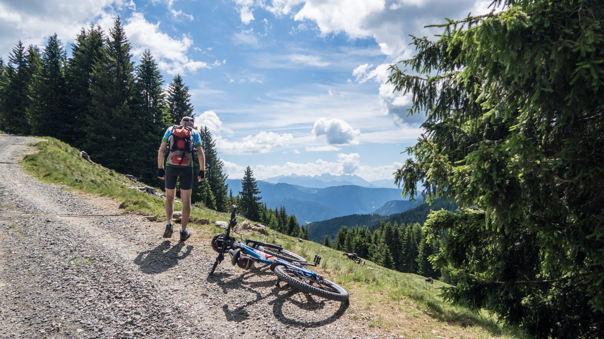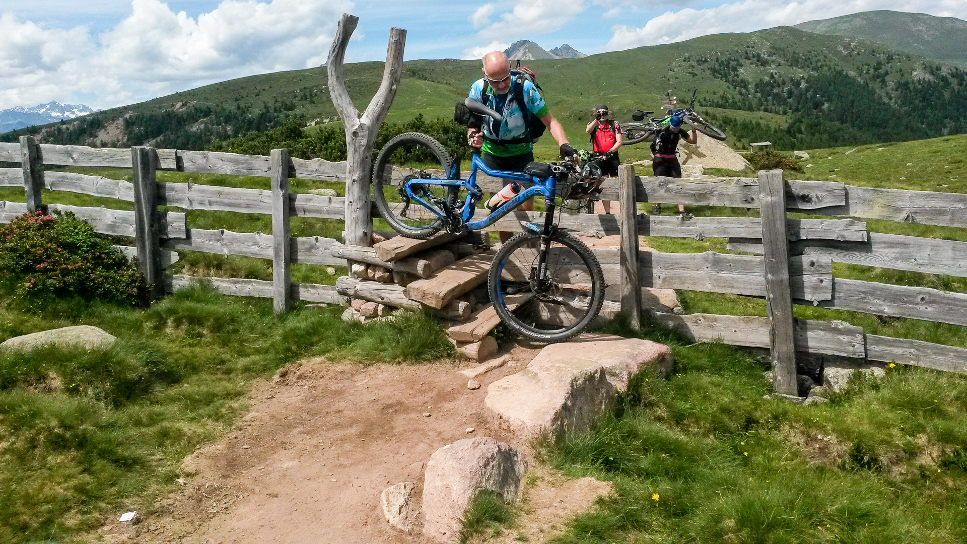Fotos, ein Eintrag ins Gipfelbuch und dann geht es auch schon wieder weiter. Es geht bergab – und wie – coole Trails, teilweise sehr ausgesetzt, aber fast immer noch fahrbar. Dann wieder schnelle Schotterpassagen, Flowtrails und ruppiges Gestein. Das hat Spaß gemacht, war zwar auch anstrengend aber echt toll. 10 km und 880 Meter tiefer kommen wir in Mölten raus.
