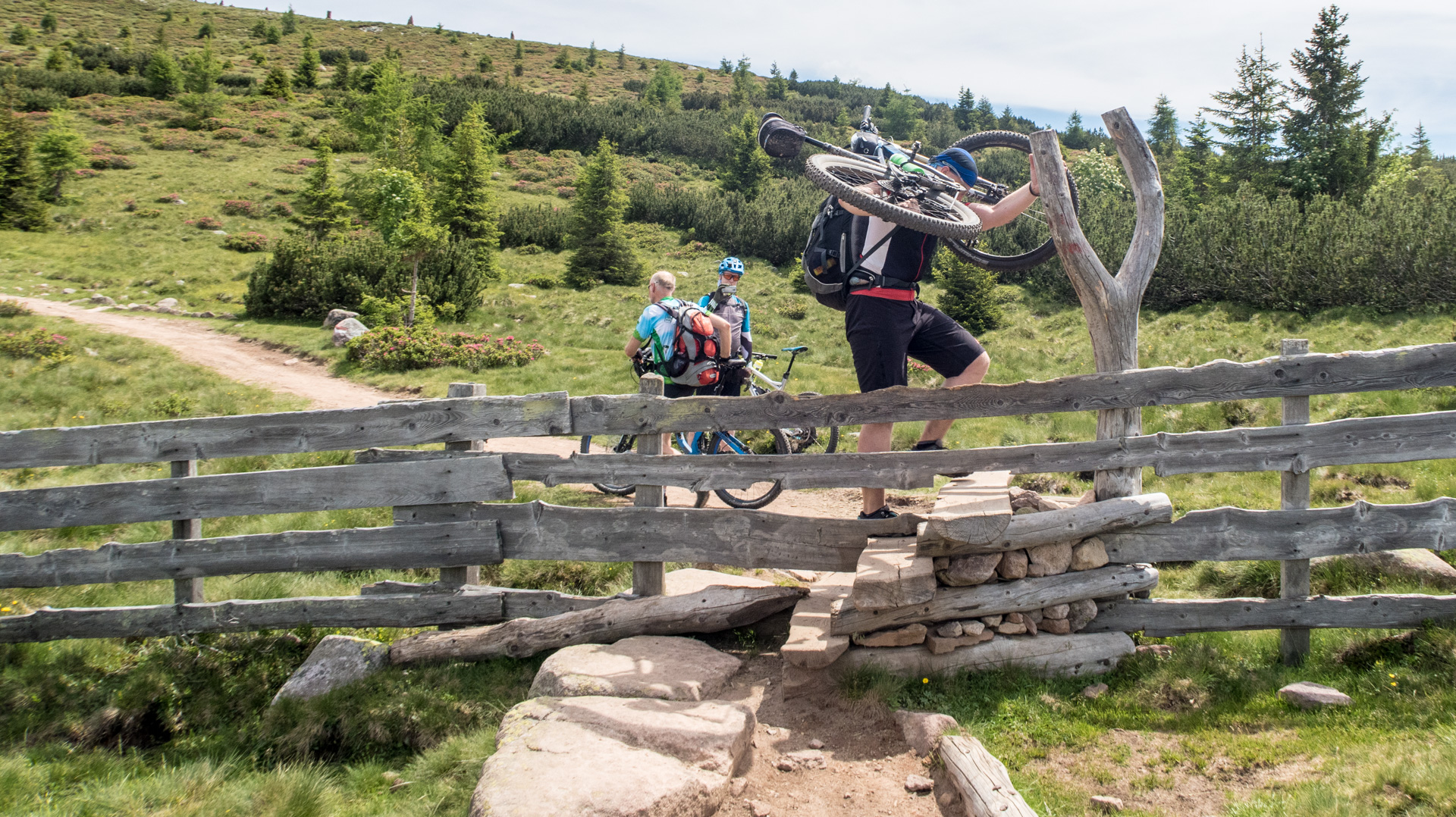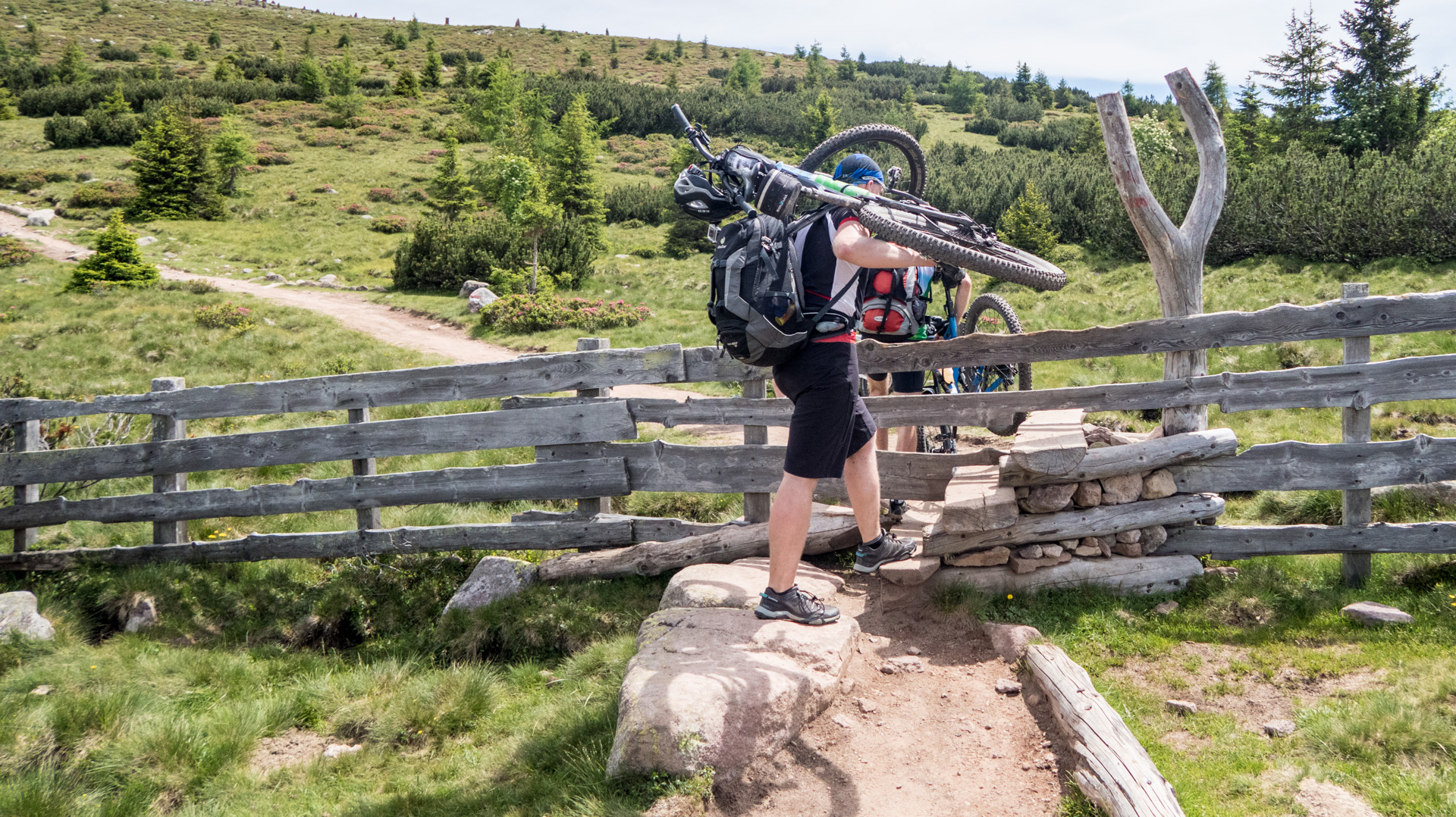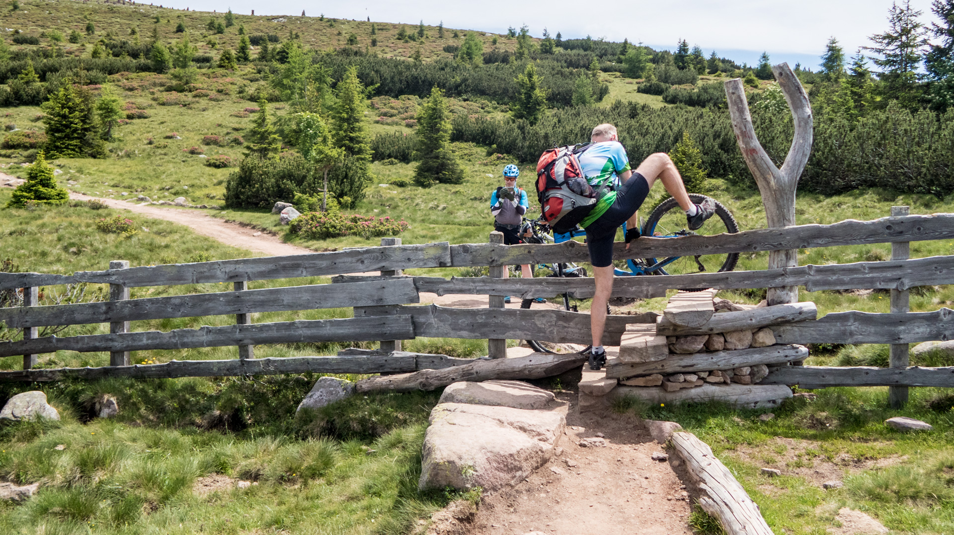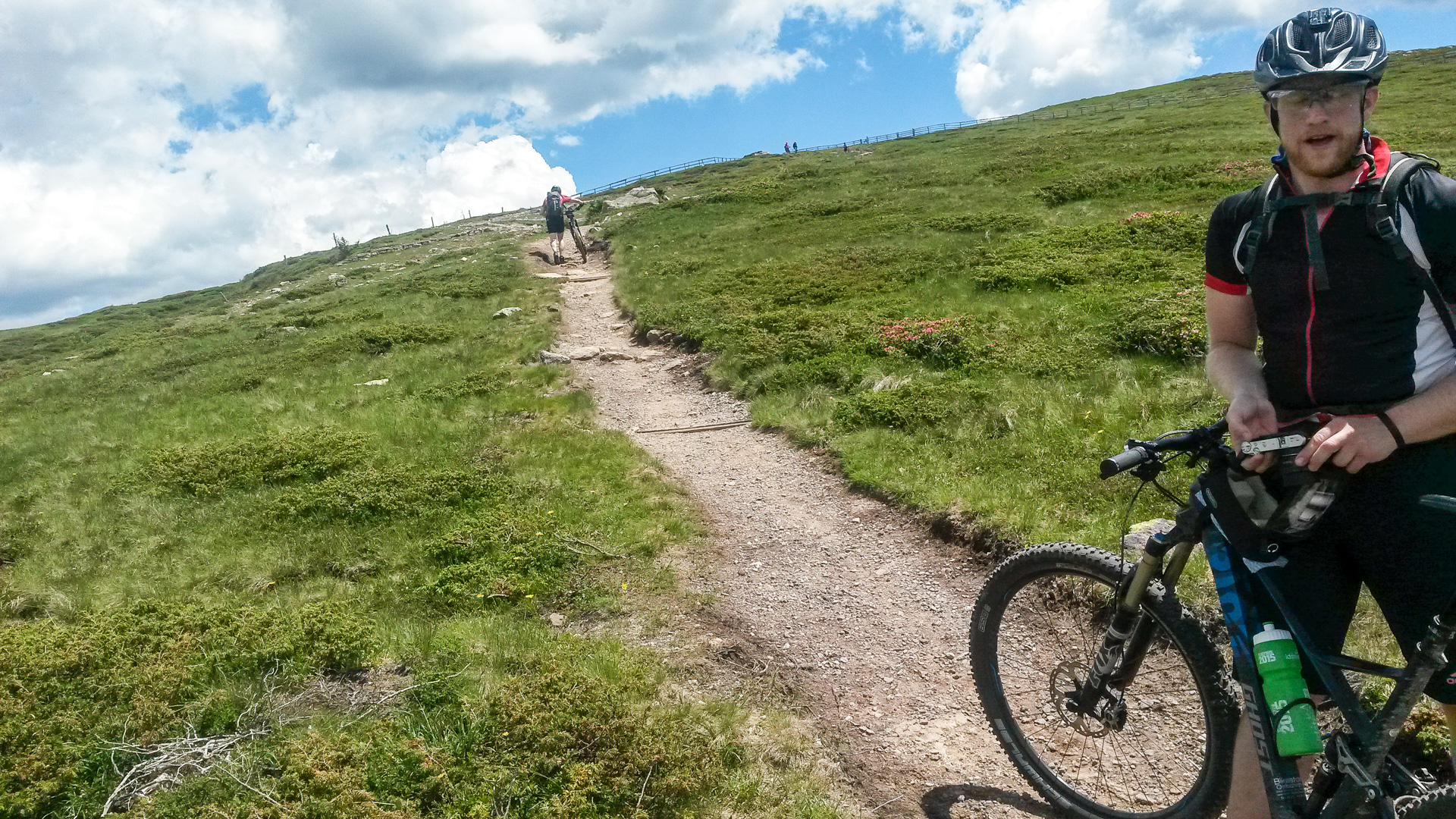 Fotos, ein Eintrag ins Gipfelbuch und dann geht es auch schon wieder weiter. Es geht bergab – und wie – coole Trails, teilweise sehr ausgesetzt, aber fast immer noch fahrbar. Dann wieder schnelle Schotterpassagen, Flowtrails und ruppiges Gestein. Das hat Spaß gemacht, war zwar auch anstrengend aber echt toll. 10 km und 880 Meter tiefer kommen wir in Mölten raus.