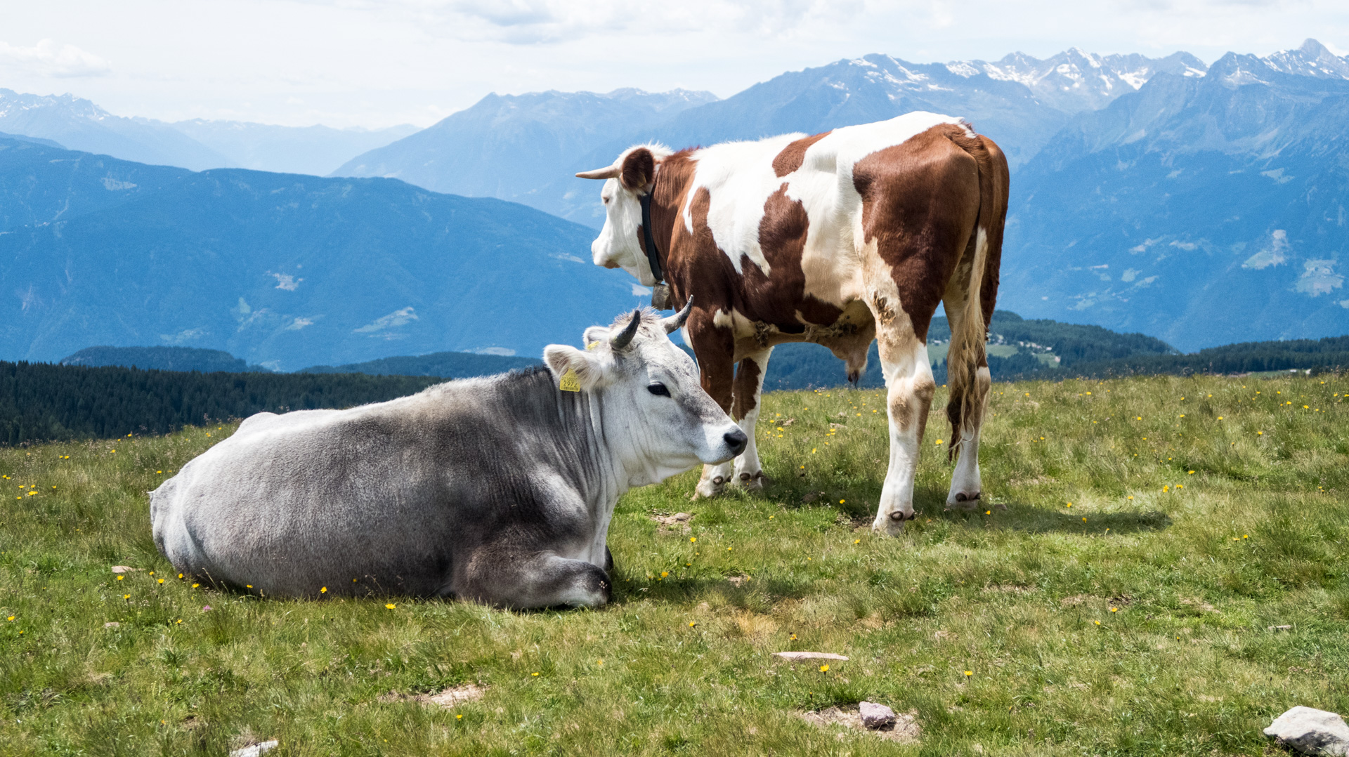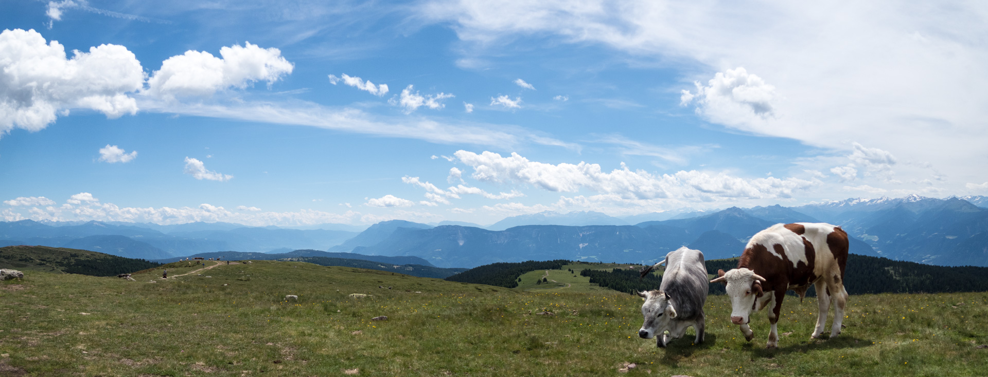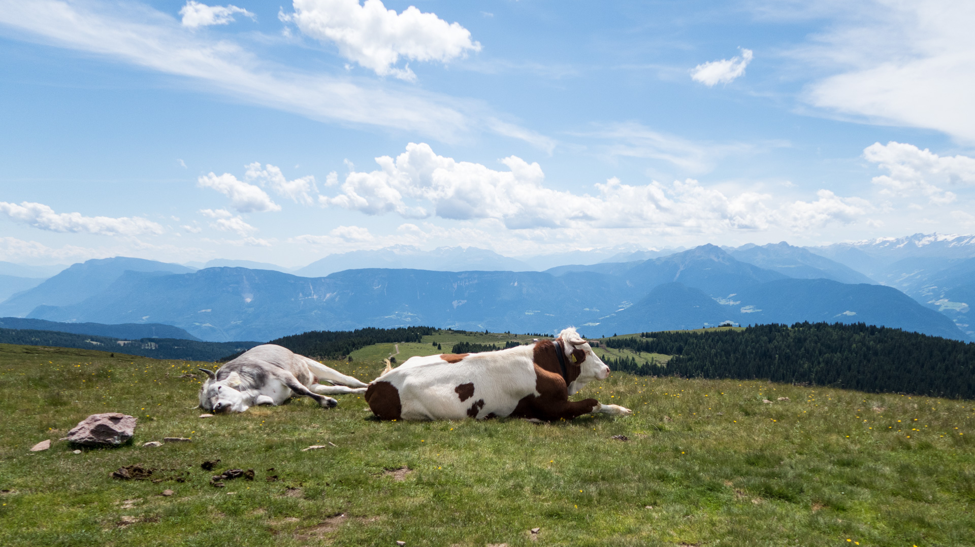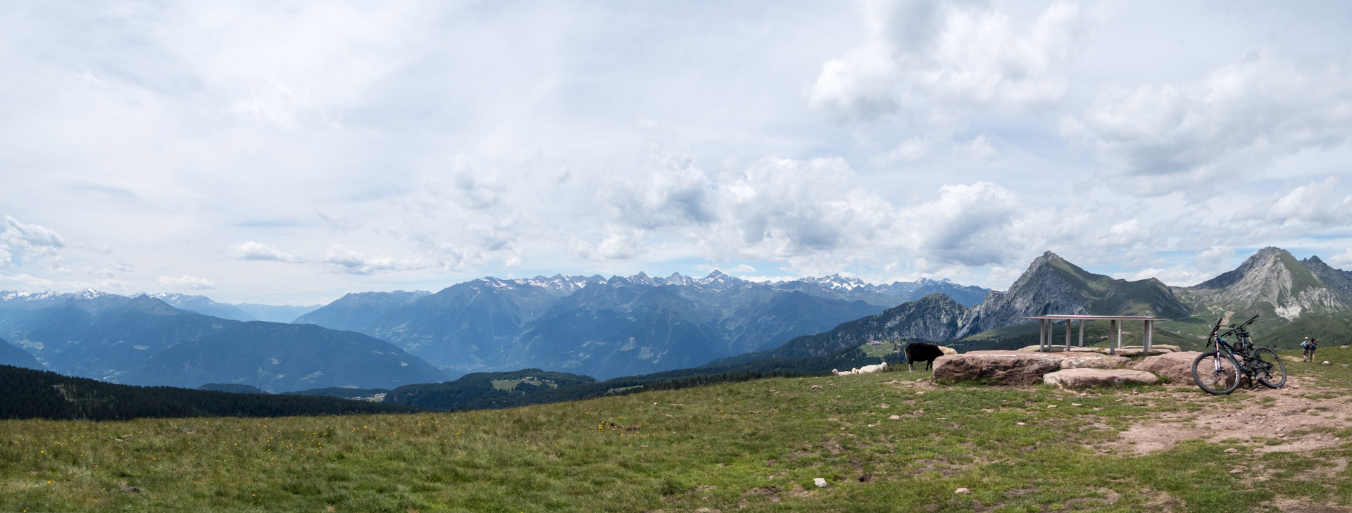 Das Auener Jöchl ist 4 km und 180 hm entfernt, das meiste müssen wir auf dem auf einem Pfad hinauf scheiben. Wow – hier oben hat man eine 360 Grad Rundumsicht. Man will gar nicht mehr weg, saugt nur noch tolle Bilder in den Kopf und in die Kamera. Es ist alles so friedlich, die Kühe sonnen sich, ein paar Wanderer genießen die Aussicht.