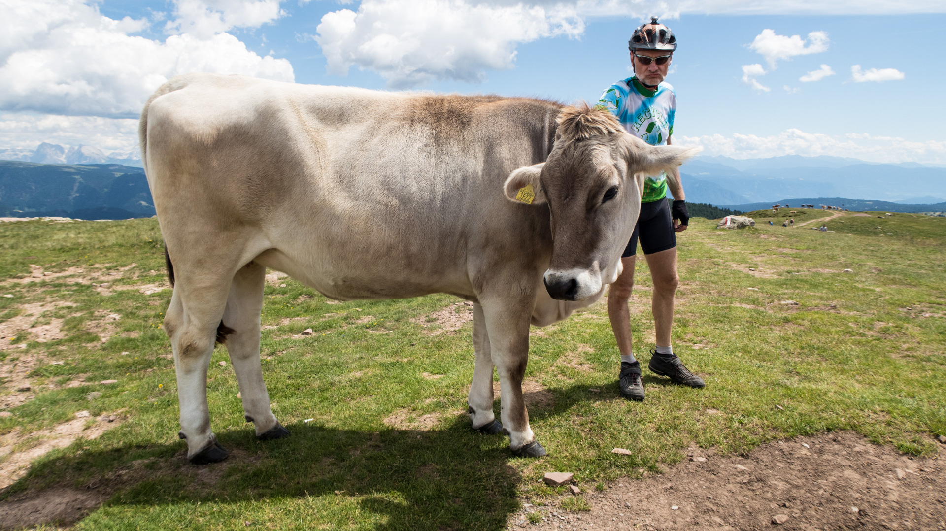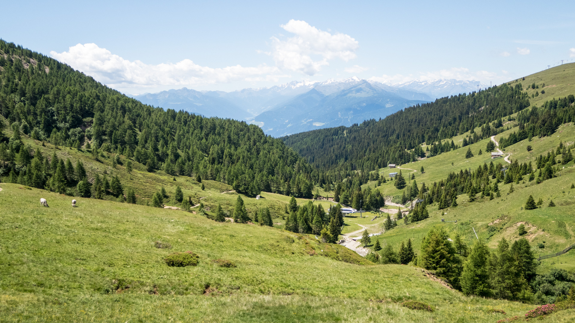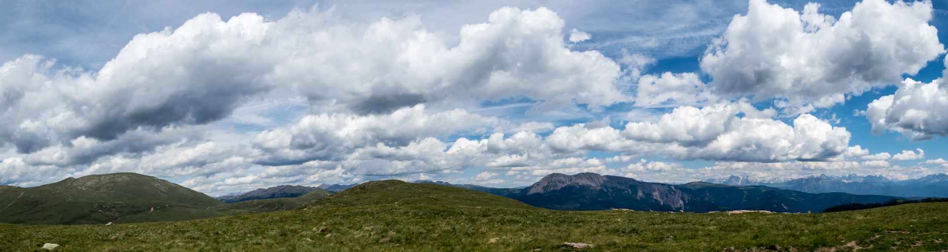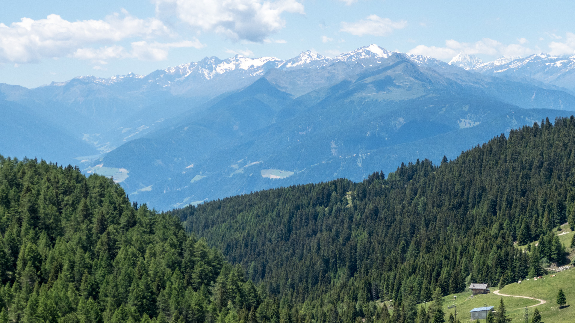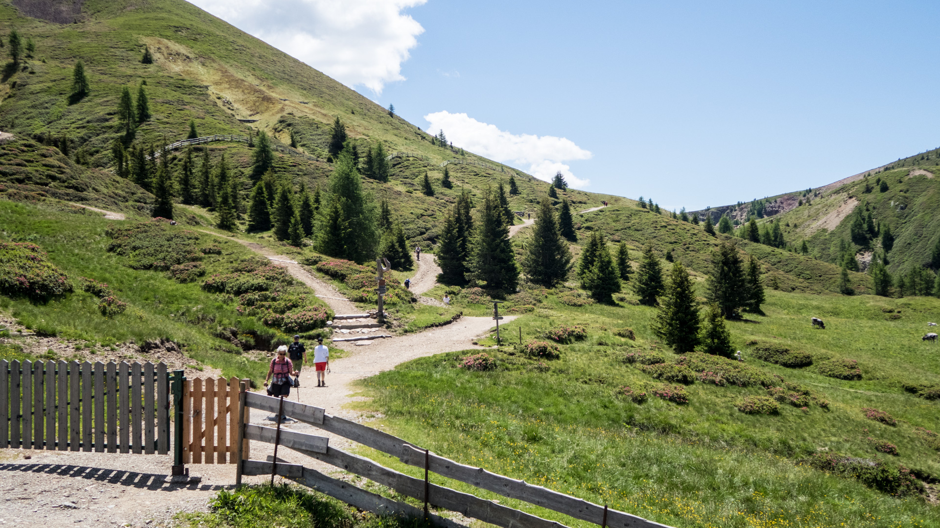 Das Auener Jöchl ist 4 km und 180 hm entfernt, das meiste müssen wir auf dem auf einem Pfad hinauf scheiben. Wow – hier oben hat man eine 360 Grad Rundumsicht. Man will gar nicht mehr weg, saugt nur noch tolle Bilder in den Kopf und in die Kamera. Es ist alles so friedlich, die Kühe sonnen sich, ein paar Wanderer genießen die Aussicht.