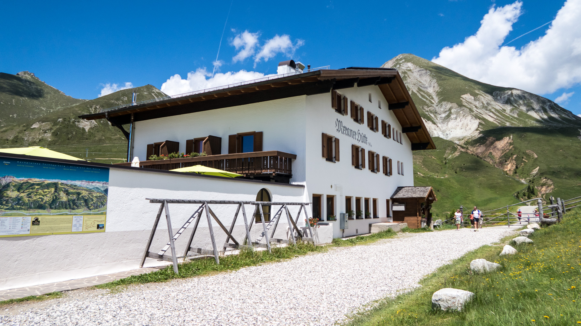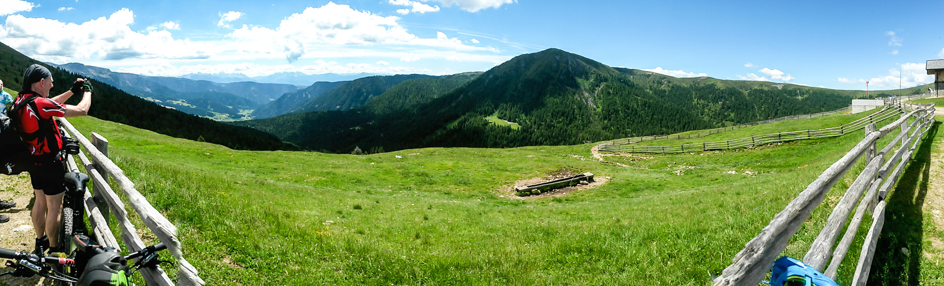 An der Öttenbacher Alm machen wir Pause mit Fotostopp, Essen & Trinken wollen wir hier noch nicht. Dafür wollen wir die Meraner Hütte nutzen. Also die letzen 500 hm hoch treten und es erstreckt sich ein tolles Panorama ins Vinschgau. Zur Hütte rollen wir ein paar hundert Meter hinunter und genießen die Pause. Das erste was mir auffällt: Gleich am Eingang gibt es eine Ladestation für E-Bikes. Dieser Trend ist wohl nicht mehr aufzuhalten. Zwei obligatorische Weizenbier und eine guten Suppe später machen wir uns wieder los.