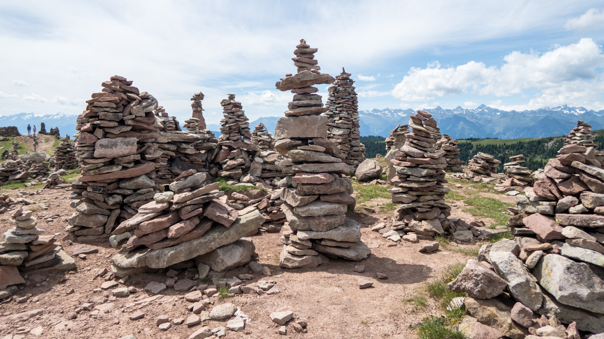 Auf dem Gipfelplateu des Schöneck im Sarntal erwarten den Wanderer über 100 sehenswerte Gestalten. Aus Steinplatten sind sie aufgetürmt die „Stoanernen Mandln“. Seit einem halben Jahrtausend stehen sie rund ums Kreuz und bewachen die „Große Reisch“. Mannshoh warten sie auf und lassen sich bewundern. Gerichtsprotokolle aus dem frühen Jahr 1540 besagen, daß zwischen den Steinfiguren Hexentänze und Teufelsfeiern veranstaltet wurden. Ob man dem Glauben schenken will, sei einem selbst überlassen. Die mystische Atmosphäre und der geheimnisvolle Zauber hier oben trägt einiges zu der fantastischen Aussicht bei. Ein lohnenswertes Ausflugsziel sind sie allemal, die Stoanernen Mandln!