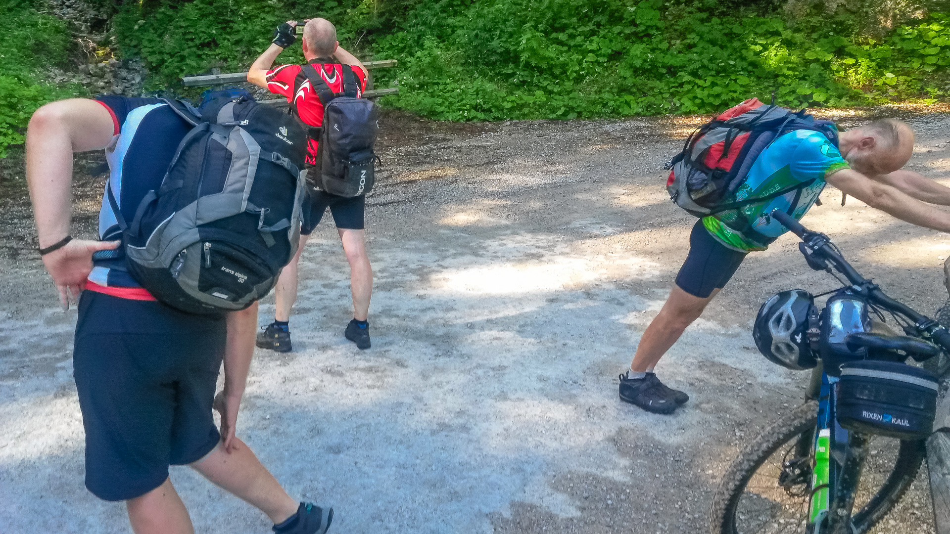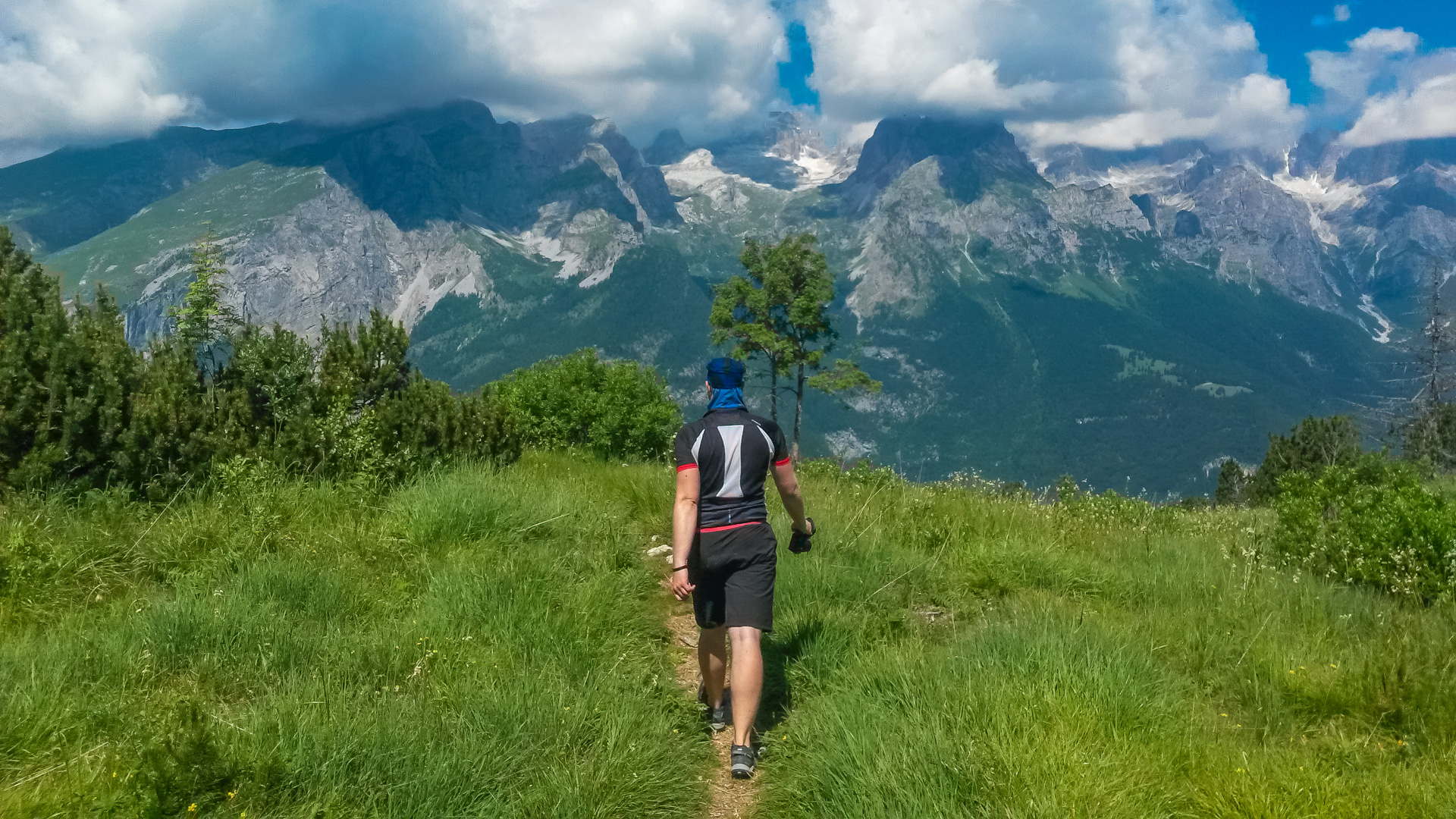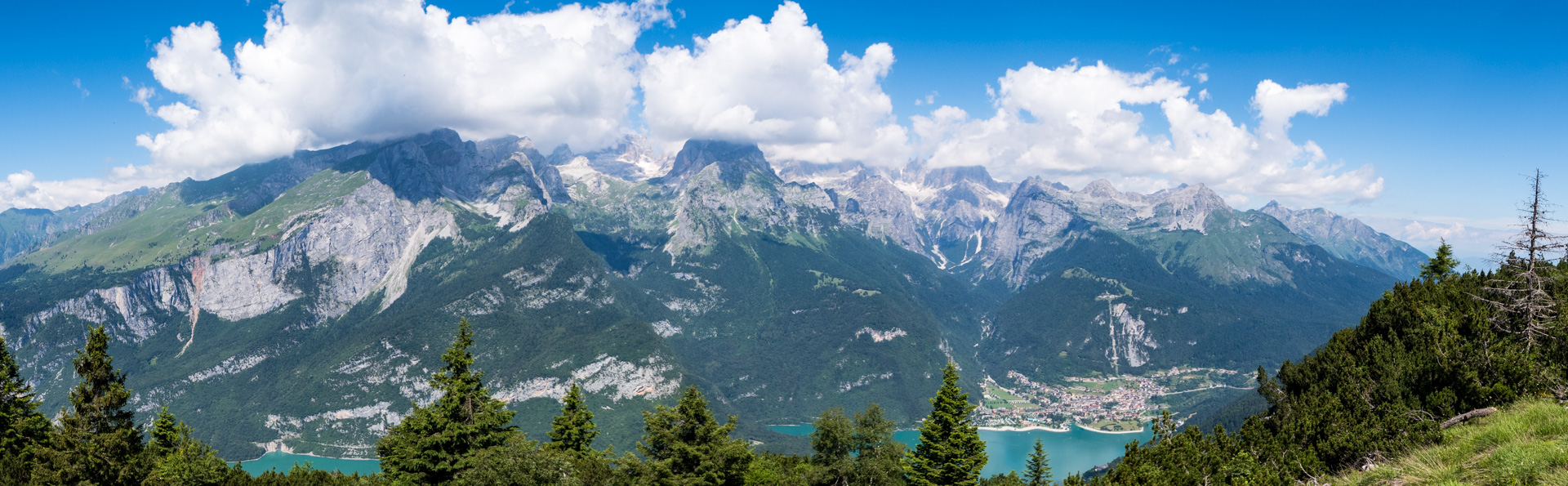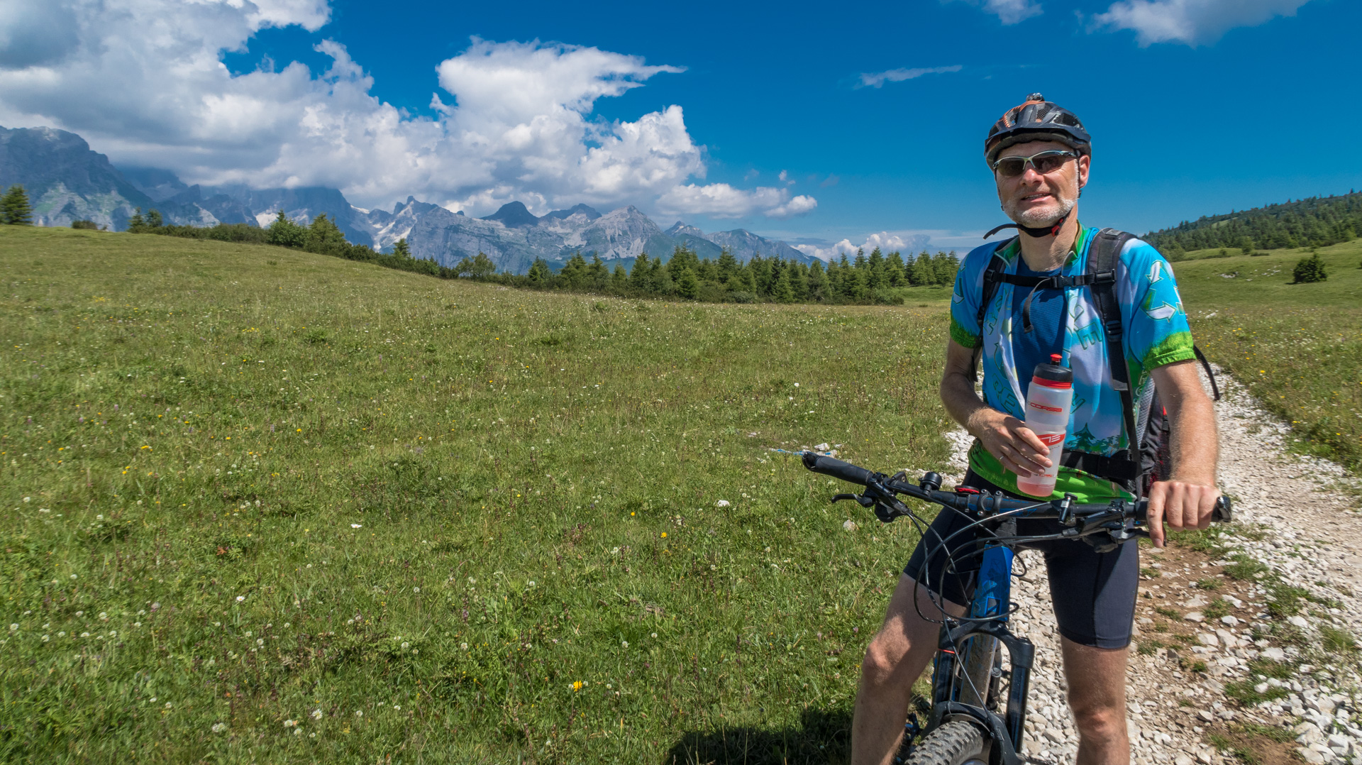 Heute fahren wie doppel so viele Meter runter wie hoch – hat auch was. Nach ausgiebigem Frühstück geht es los. Die Schwinge an Thomas Bike hält immer noch, alles wird gut! Der Passo San Giovanni liegt auf 1.750 Meter, das bedeutet, wir müssen jetzt 860 Meter auf 12 km fahren. Feiner Schotter, schön zu fahren, aber man merkt doch schon die 7 Biketage, die wir hinter uns haben. Es zieht sich dann doch ganz schön, wir lassen uns aber nicht unter kriegen und treten im kleinsten Gang dem Gipfel entgegen. Ein kleiner Wiesentrail, den wir teilweise hoch laufen müssen, dann sind wir oben. Die Aussicht ist grandios. Wir schauen genau auf den Lago di Molvone tief unten im Tal. Der Campanile Basso, insbesondere im deutschen Sprachraum auch oft Guglia di Brenta genannt, ist eine steil aufragende Felsspitze des zentralen Brenta-Massivs und liegt genau gegenüber von uns.