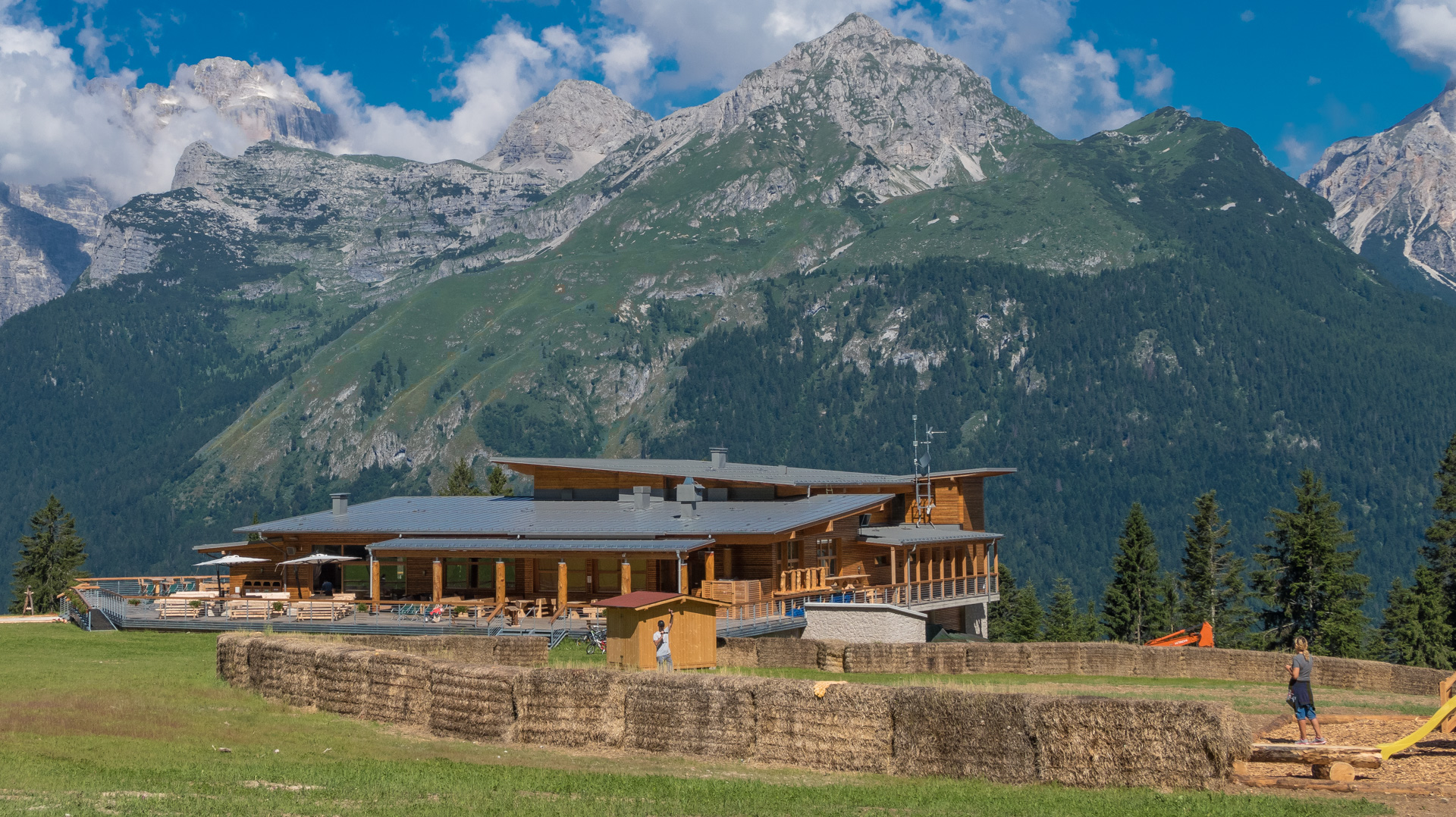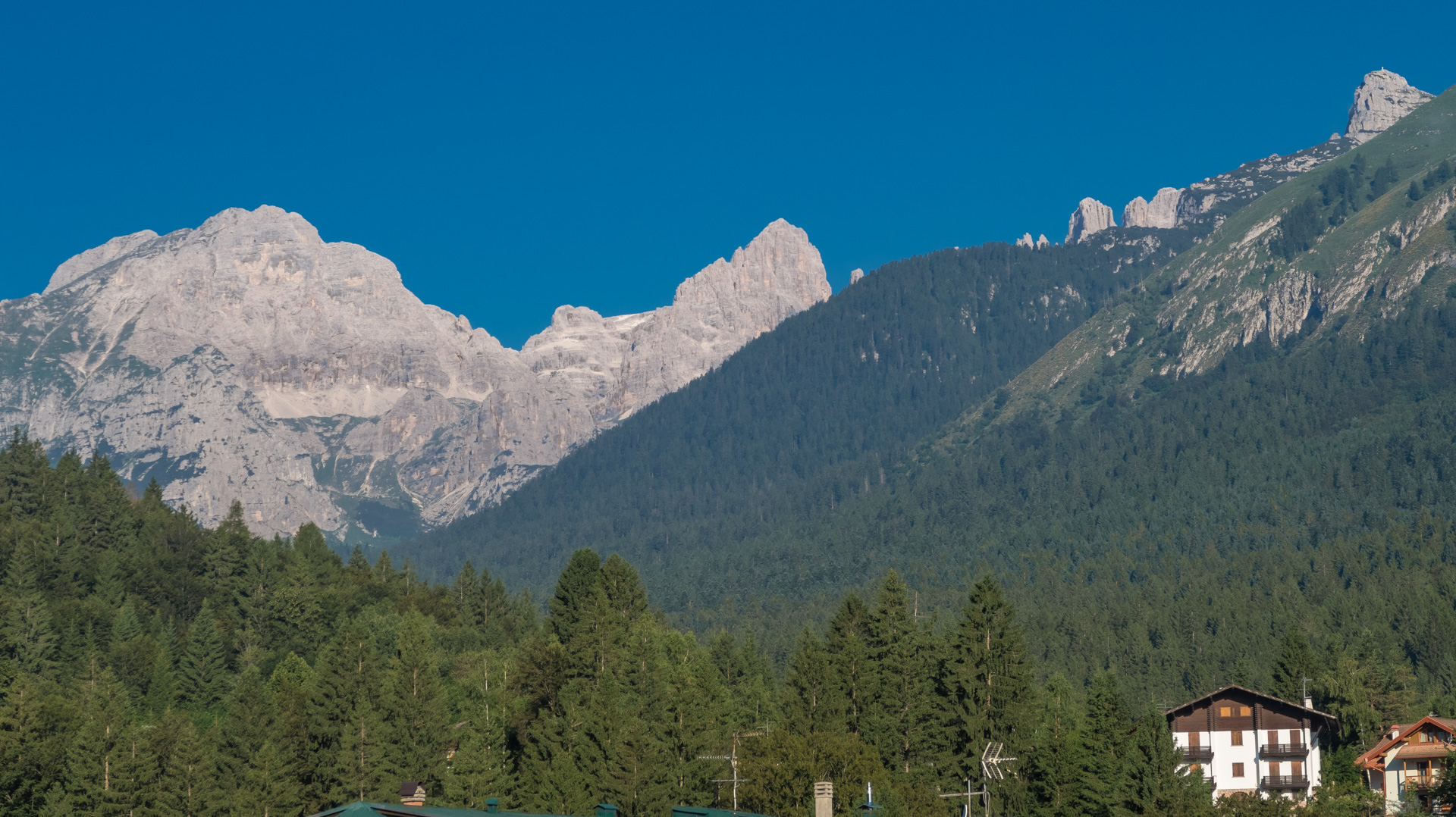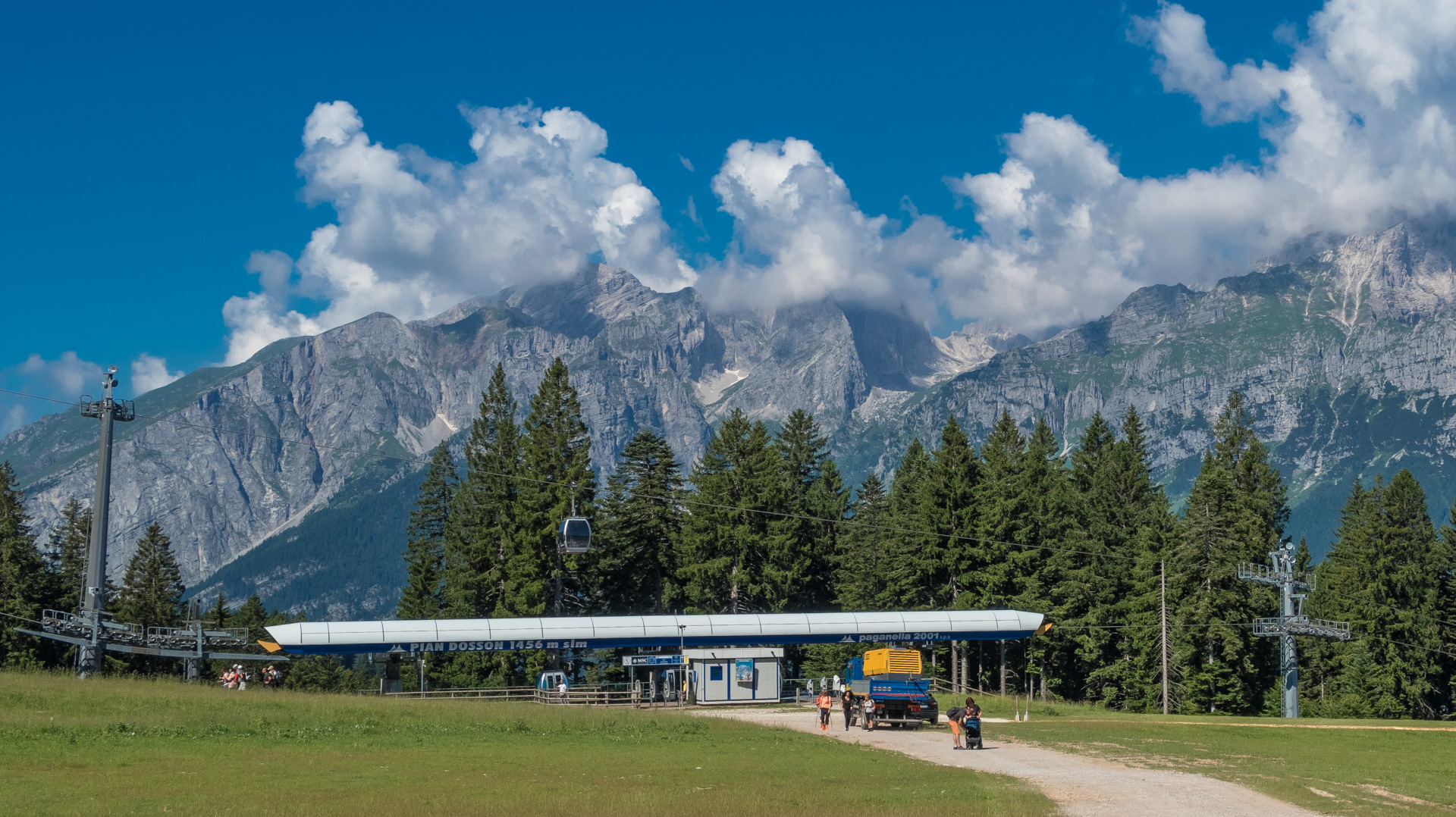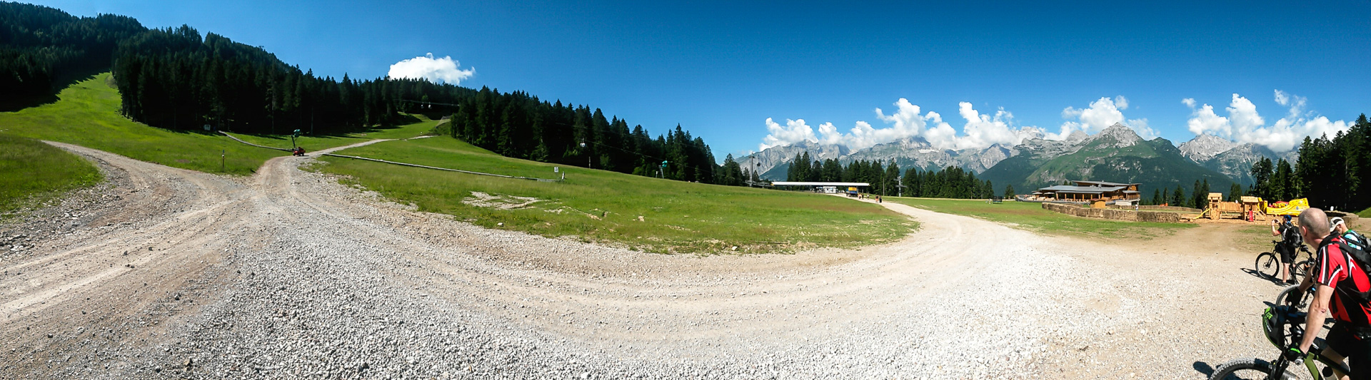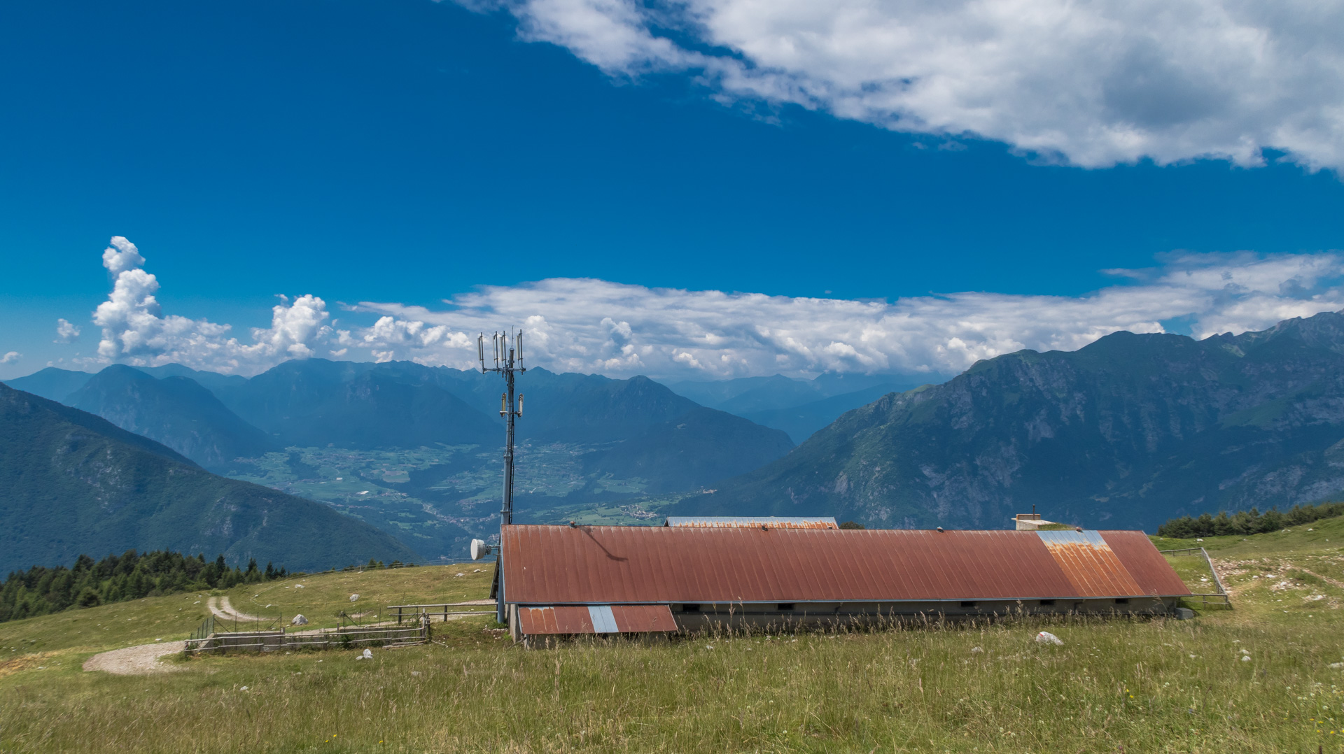 Heute fahren wie doppel so viele Meter runter wie hoch – hat auch was. Nach ausgiebigem Frühstück geht es los. Die Schwinge an Thomas Bike hält immer noch, alles wird gut! Der Passo San Giovanni liegt auf 1.750 Meter, das bedeutet, wir müssen jetzt 860 Meter auf 12 km fahren. Feiner Schotter, schön zu fahren, aber man merkt doch schon die 7 Biketage, die wir hinter uns haben. Es zieht sich dann doch ganz schön, wir lassen uns aber nicht unter kriegen und treten im kleinsten Gang dem Gipfel entgegen. Ein kleiner Wiesentrail, den wir teilweise hoch laufen müssen, dann sind wir oben. Die Aussicht ist grandios. Wir schauen genau auf den Lago di Molvone tief unten im Tal. Der Campanile Basso, insbesondere im deutschen Sprachraum auch oft Guglia di Brenta genannt, ist eine steil aufragende Felsspitze des zentralen Brenta-Massivs und liegt genau gegenüber von uns.