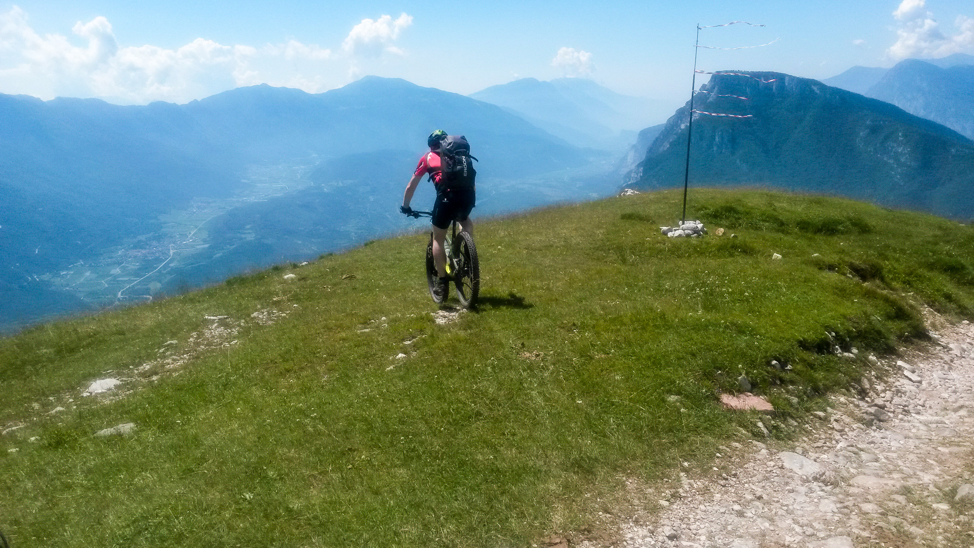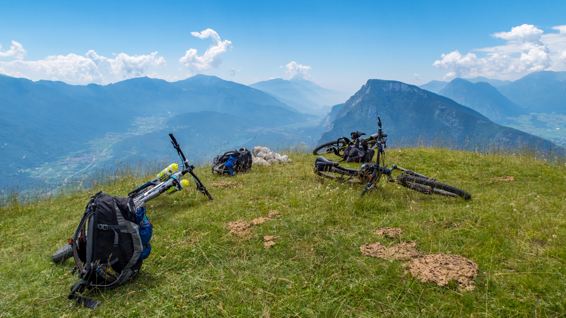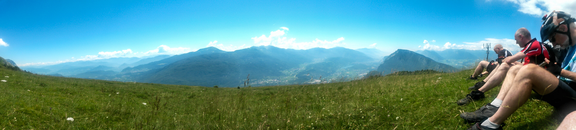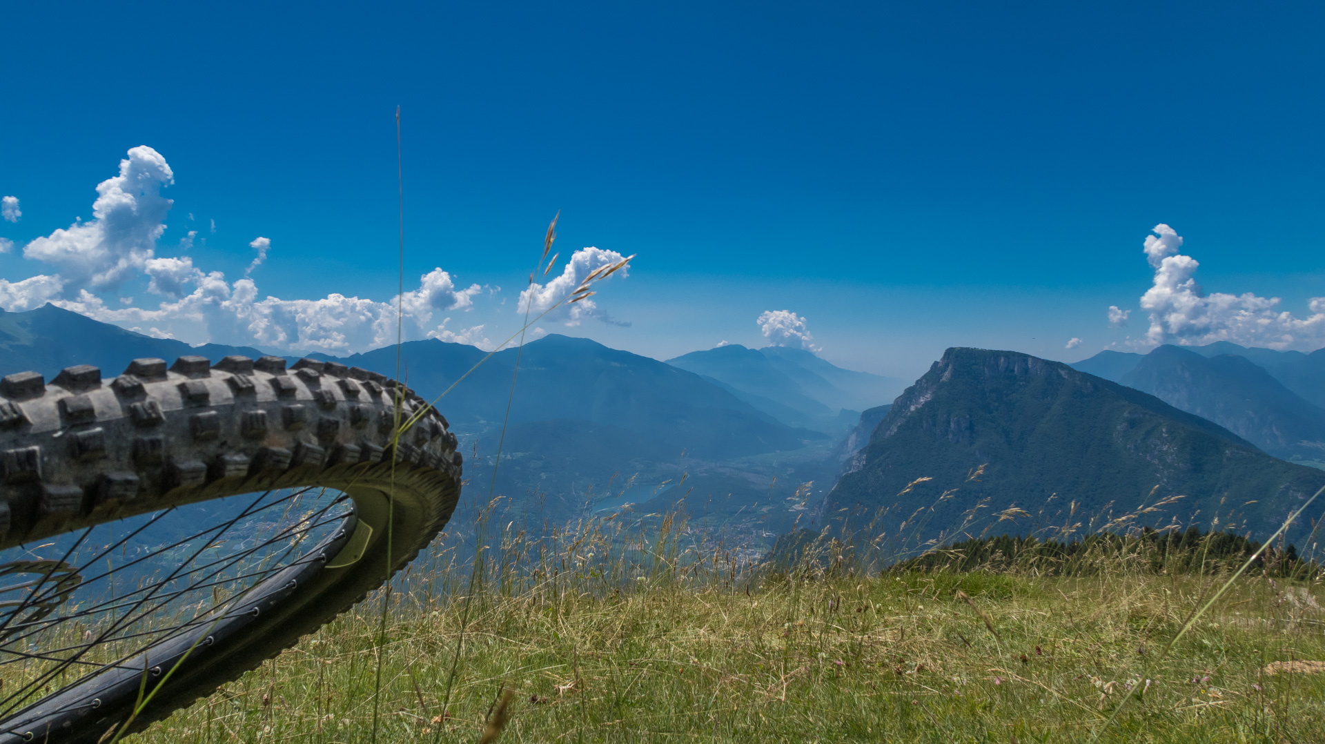 Einige Fotos später geht es endlich abwärts, teils auf tollen Wiesentrails, teils auf sehr feinen Schotterwegen, herrlich und angenehm zu fahren. Wir verlieren immer mehr an Höhe, der Duft des Gardasees ist schon zu spüren. Wir haben einen tollen Blick in die Eben, der Flow hat uns gepackt. wir legen uns kurzer Hand auf eine Wiese uns genießen den Anblick. Uwe bemerkt einen Platten an seinem Hinterrad, also schnell den Schlauch wechseln und den weiteren Weg hinab genießen.