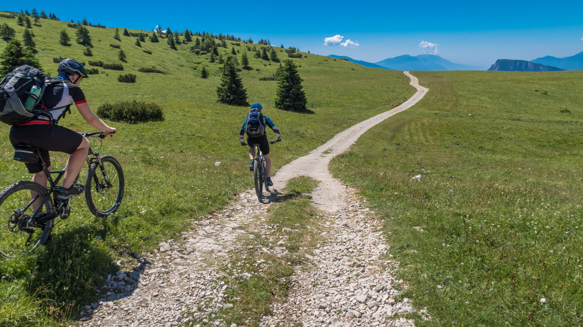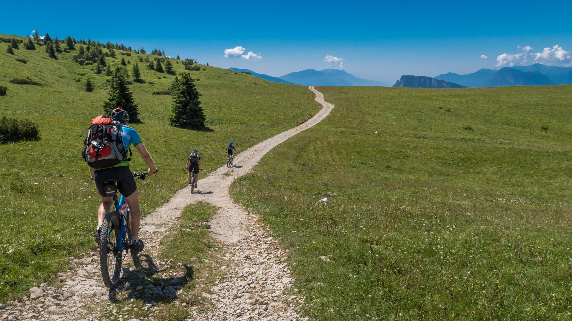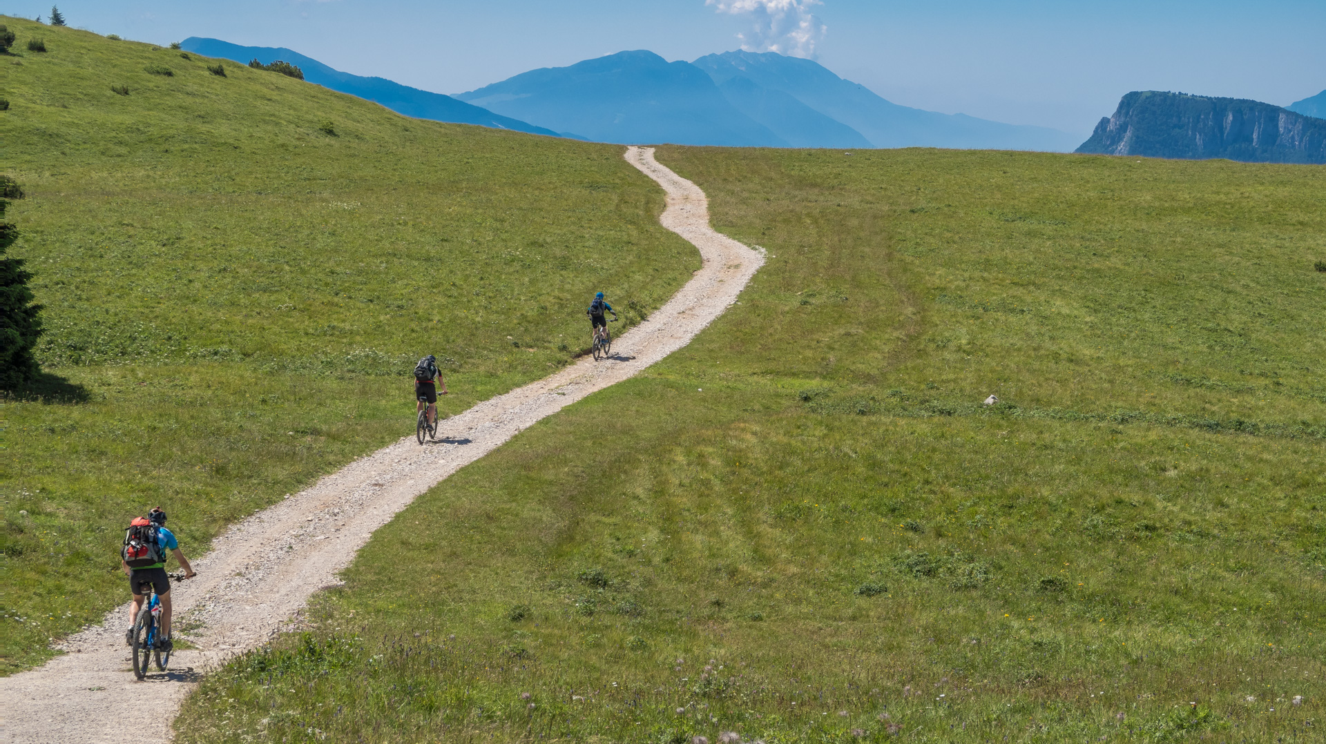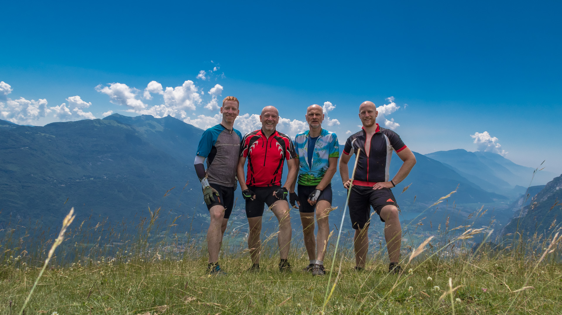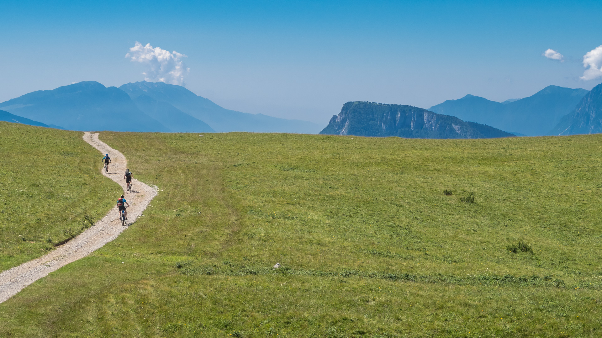 Einige Fotos später geht es endlich abwärts, teils auf tollen Wiesentrails, teils auf sehr feinen Schotterwegen, herrlich und angenehm zu fahren. Wir verlieren immer mehr an Höhe, der Duft des Gardasees ist schon zu spüren. Wir haben einen tollen Blick in die Eben, der Flow hat uns gepackt. wir legen uns kurzer Hand auf eine Wiese uns genießen den Anblick. Uwe bemerkt einen Platten an seinem Hinterrad, also schnell den Schlauch wechseln und den weiteren Weg hinab genießen.