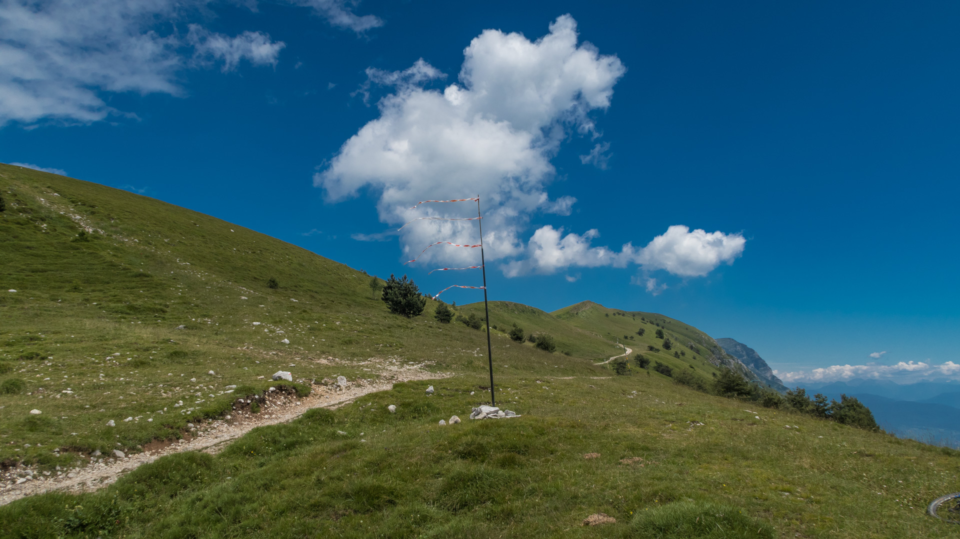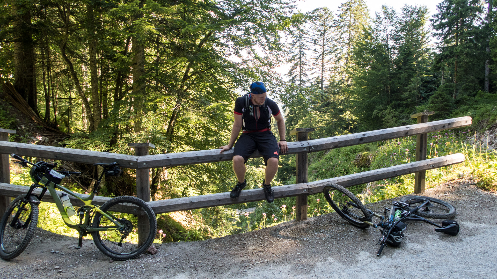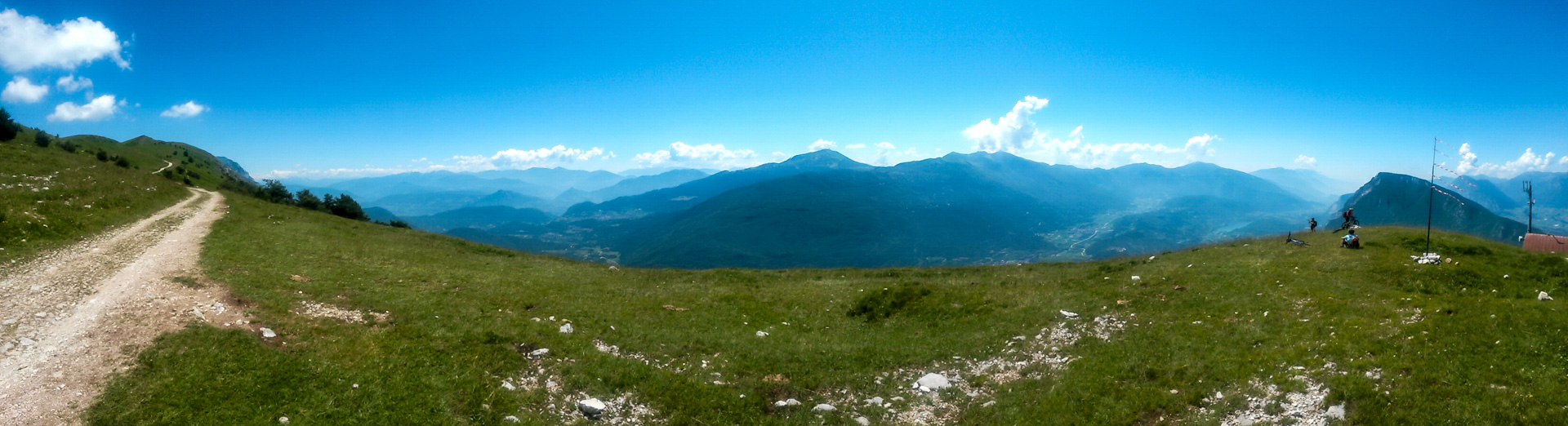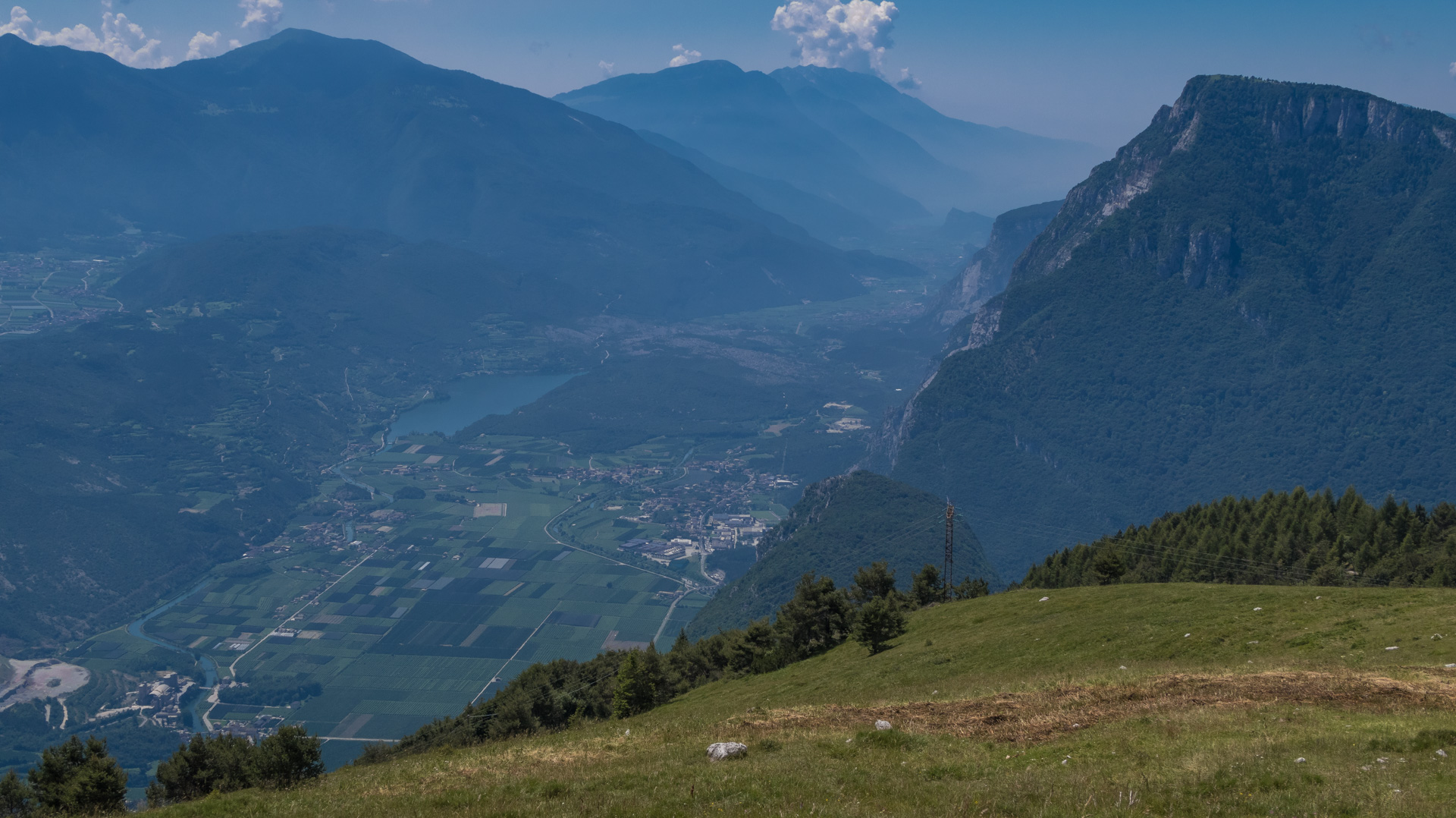 Einige Fotos später geht es endlich abwärts, teils auf tollen Wiesentrails, teils auf sehr feinen Schotterwegen, herrlich und angenehm zu fahren. Wir verlieren immer mehr an Höhe, der Duft des Gardasees ist schon zu spüren. Wir haben einen tollen Blick in die Eben, der Flow hat uns gepackt. wir legen uns kurzer Hand auf eine Wiese uns genießen den Anblick. Uwe bemerkt einen Platten an seinem Hinterrad, also schnell den Schlauch wechseln und den weiteren Weg hinab genießen.