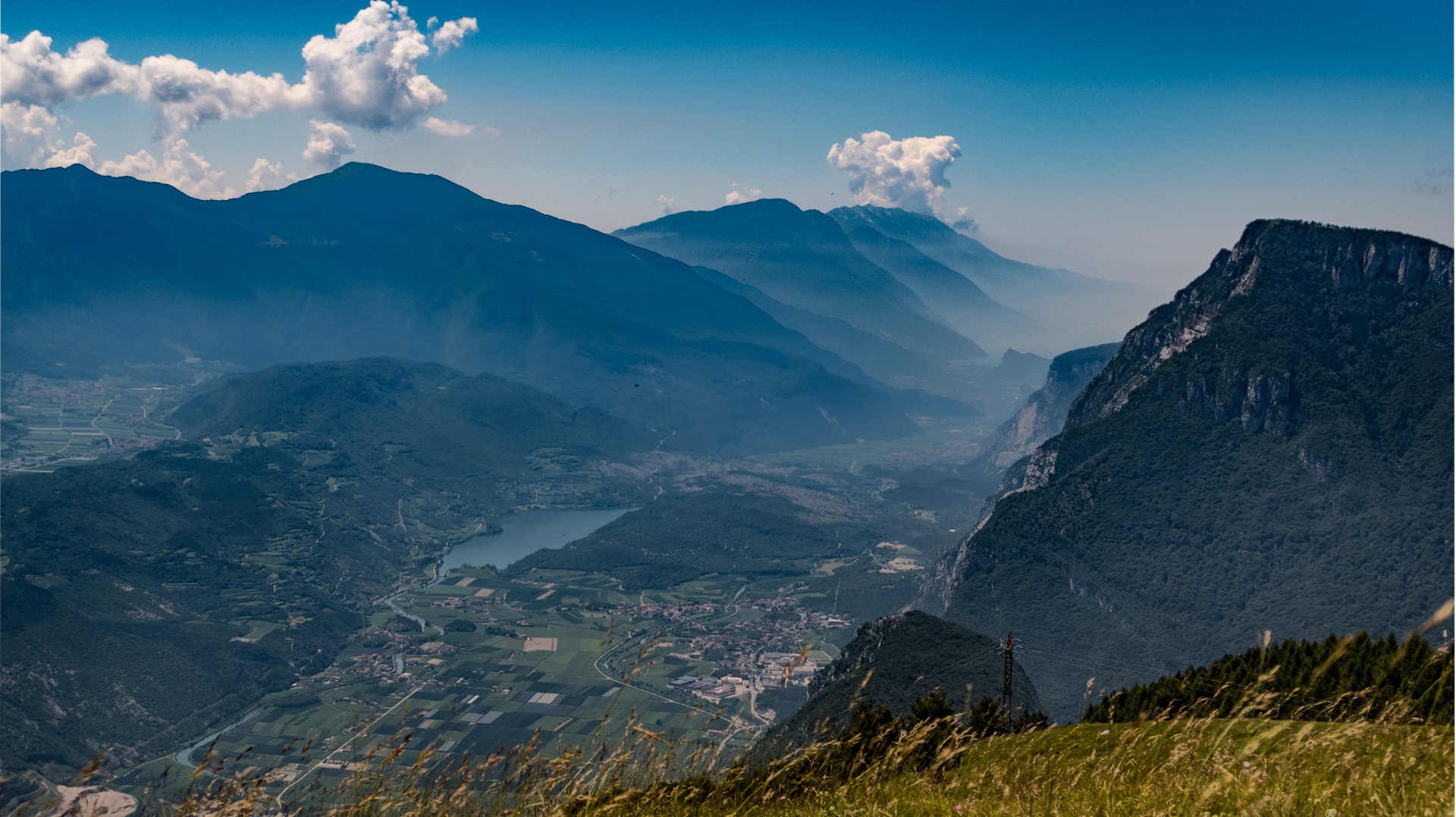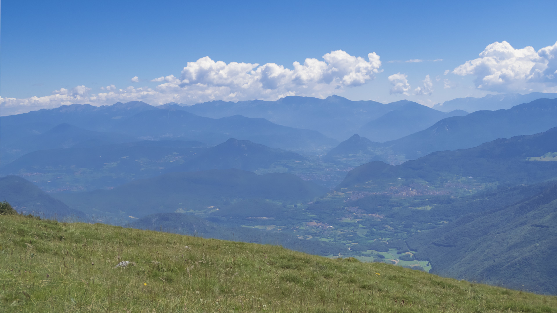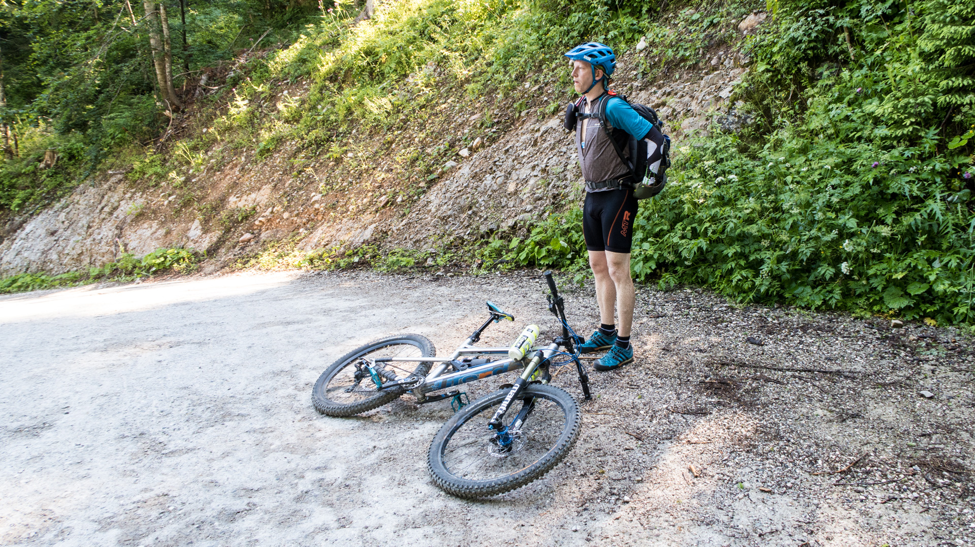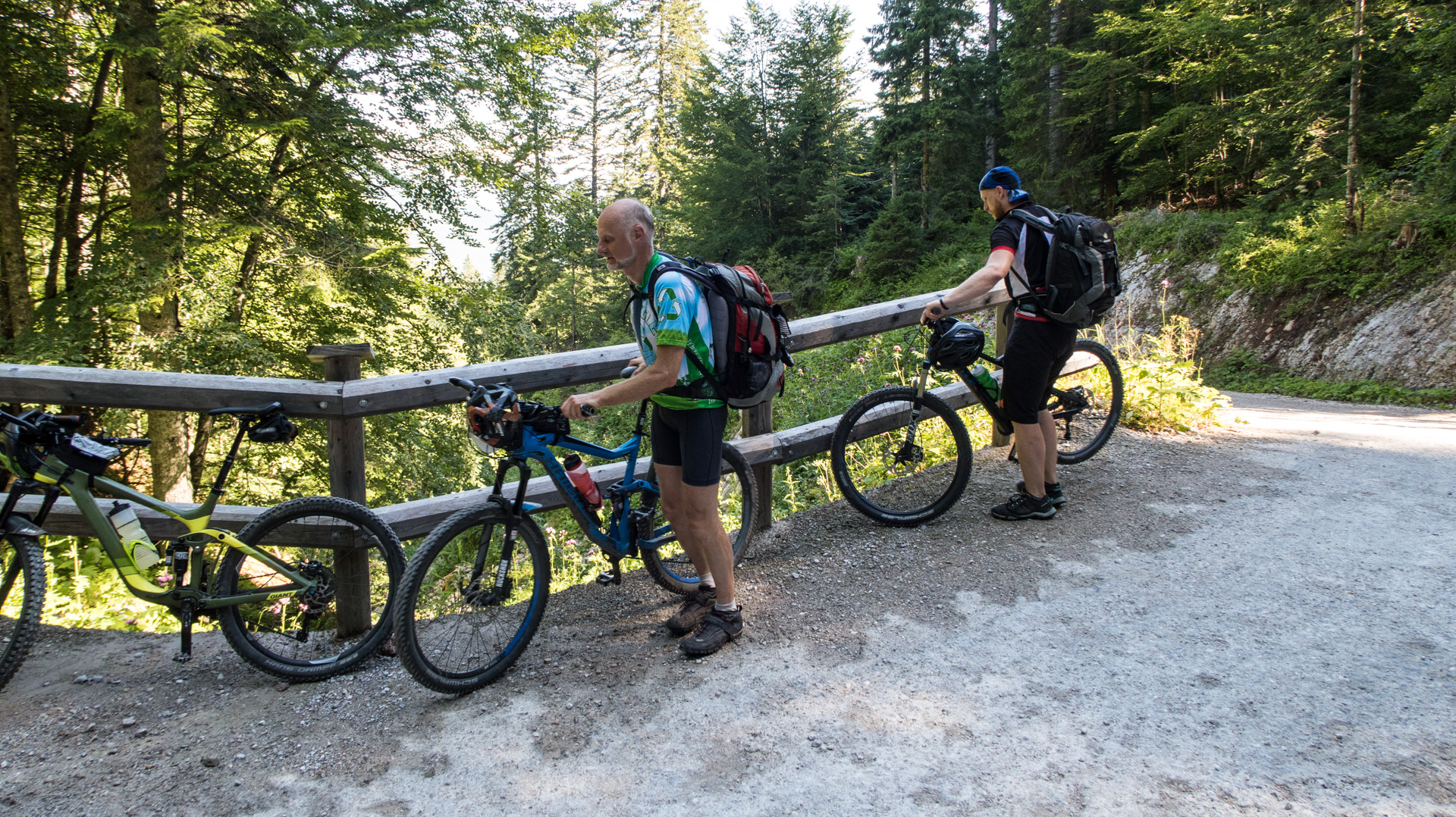 Einige Fotos später geht es endlich abwärts, teils auf tollen Wiesentrails, teils auf sehr feinen Schotterwegen, herrlich und angenehm zu fahren. Wir verlieren immer mehr an Höhe, der Duft des Gardasees ist schon zu spüren. Wir haben einen tollen Blick in die Eben, der Flow hat uns gepackt. wir legen uns kurzer Hand auf eine Wiese uns genießen den Anblick. Uwe bemerkt einen Platten an seinem Hinterrad, also schnell den Schlauch wechseln und den weiteren Weg hinab genießen.