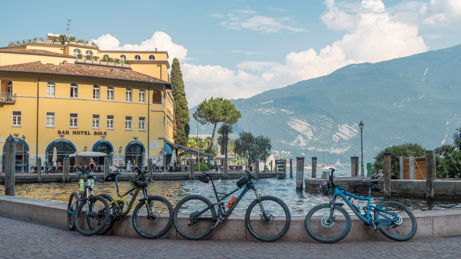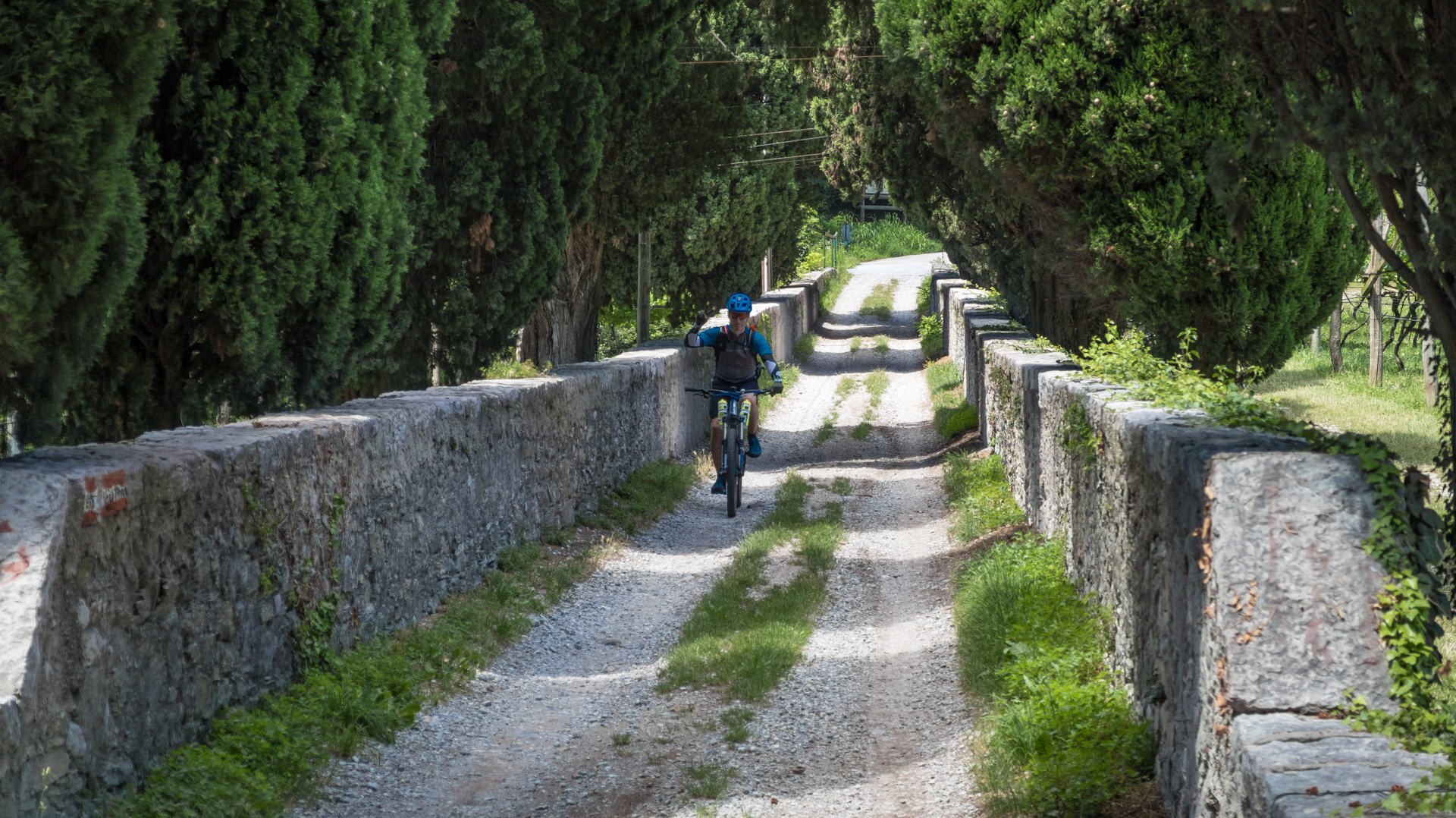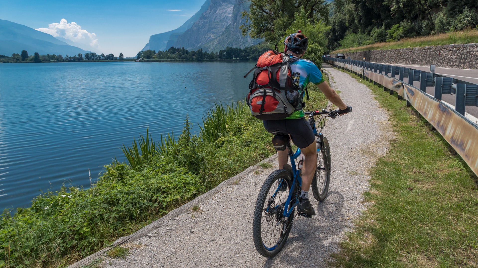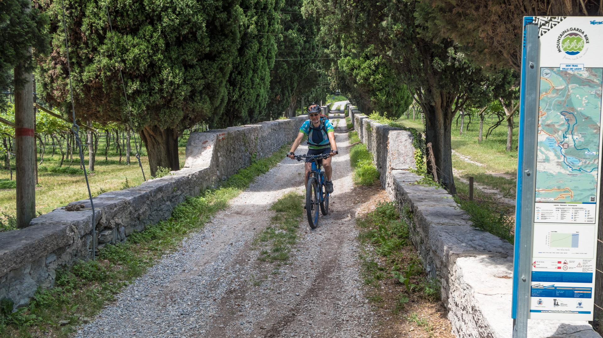 In Ranzo, einem kleinen Bergdorf, machen wir eine kleine Verschnaufpause und lockern unsere Hände aus, die vor lauter Bremsen total verkrampft sind. Dann geht es weiter, diesmal steil bergab. Wirklich steil, denn auf 3 km verlieren wir über 400 Höhenmeter, bedeutet im Schnitt mehr als 13 %! Das ganze schön im Schatten der Bäume, sehr enge Wege es macht einfach tierisch viel Spaß. Die Abfahrt spuckt uns an einer Allee am Lago die Toblino wieder raus. Das waren jetzt auf 14 km 1.300 hm hinab – cool!