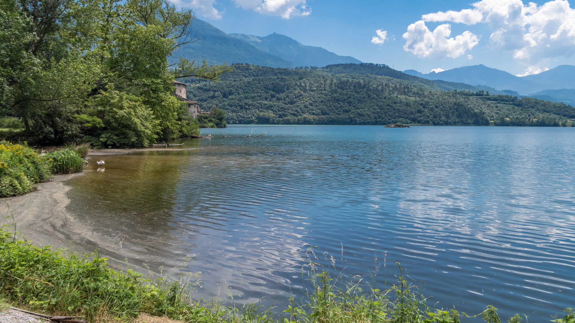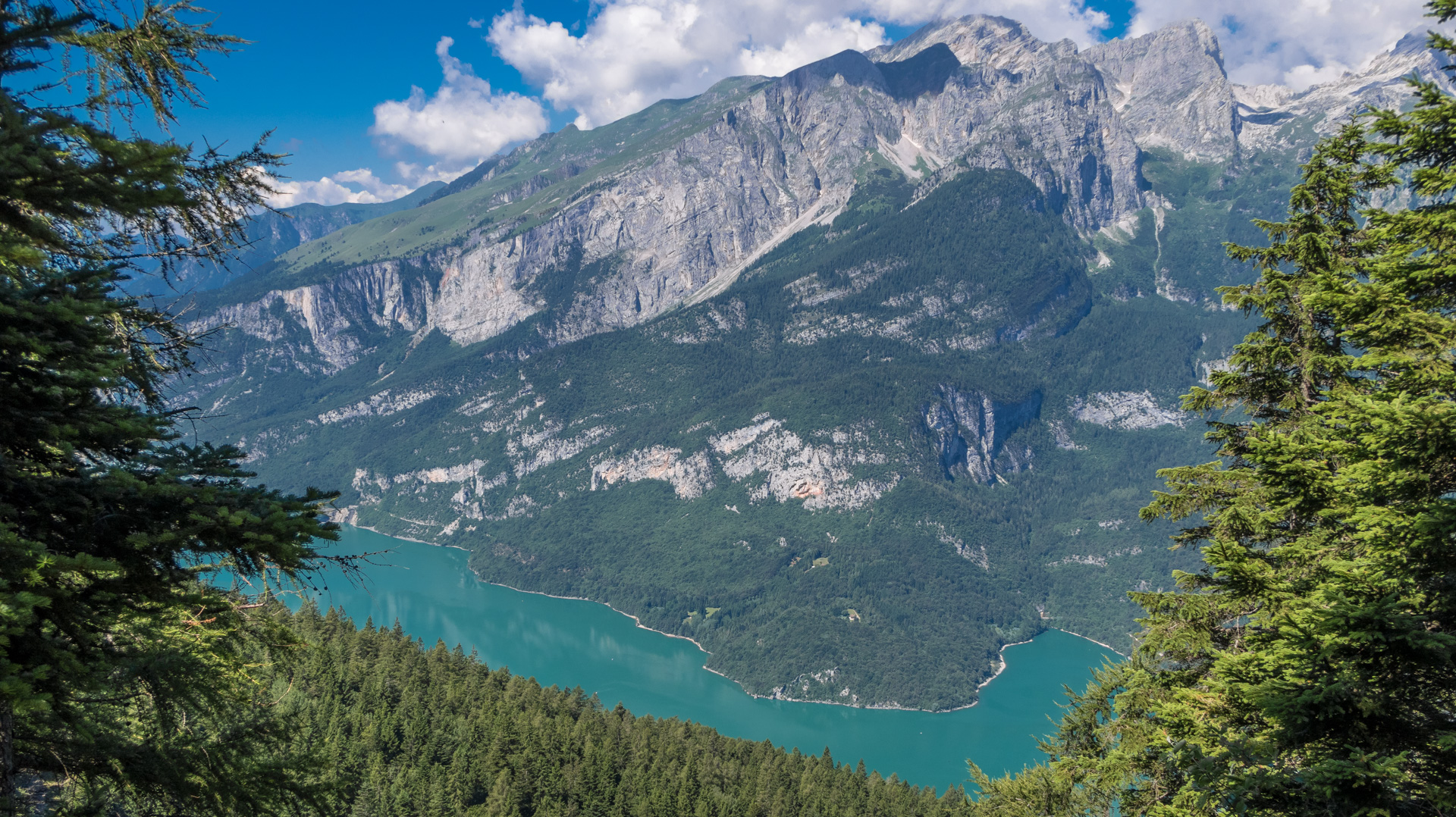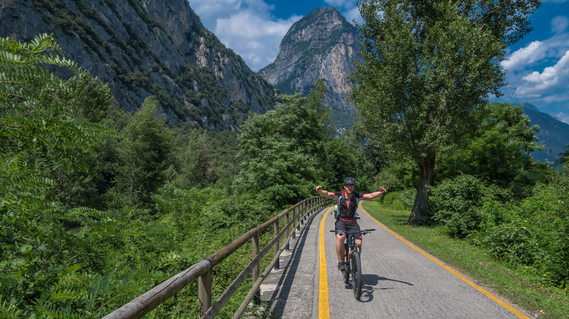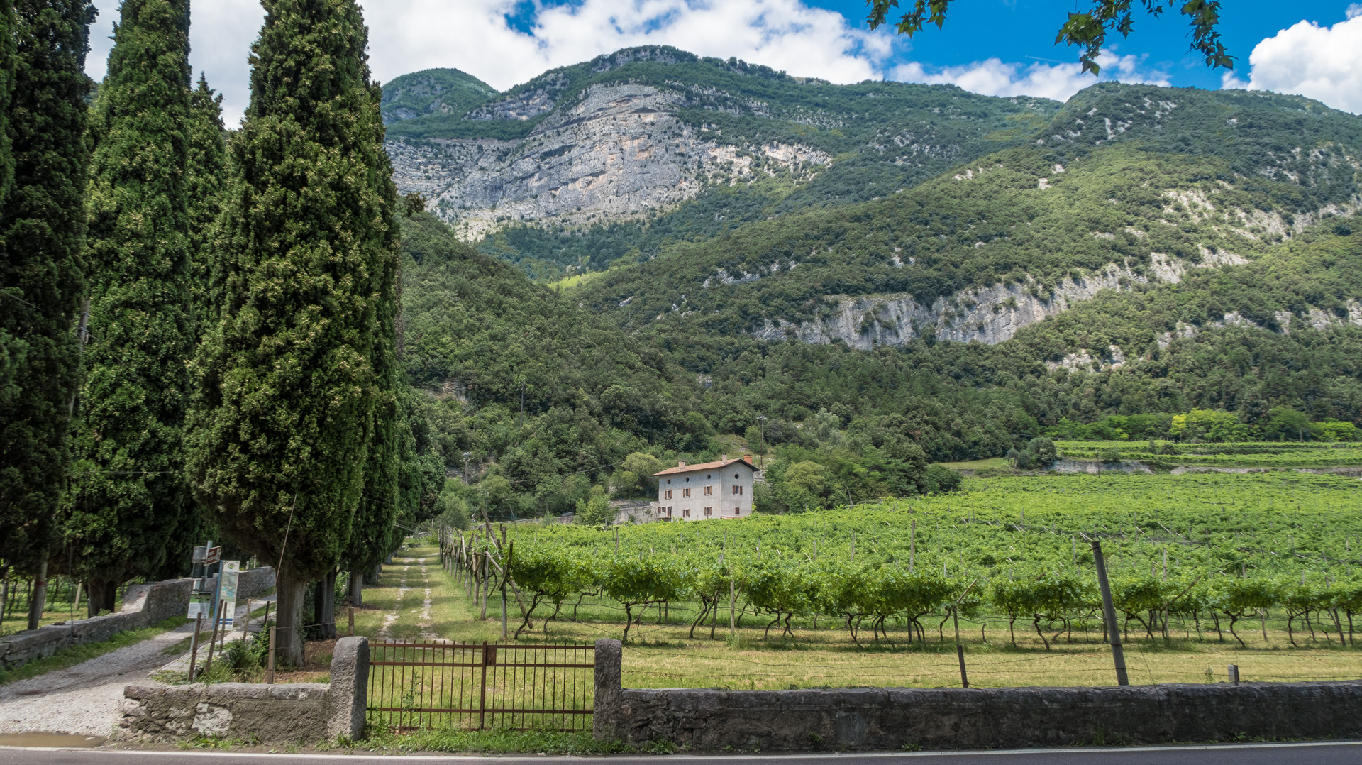 In Ranzo, einem kleinen Bergdorf, machen wir eine kleine Verschnaufpause und lockern unsere Hände aus, die vor lauter Bremsen total verkrampft sind. Dann geht es weiter, diesmal steil bergab. Wirklich steil, denn auf 3 km verlieren wir über 400 Höhenmeter, bedeutet im Schnitt mehr als 13 %! Das ganze schön im Schatten der Bäume, sehr enge Wege es macht einfach tierisch viel Spaß. Die Abfahrt spuckt uns an einer Allee am Lago die Toblino wieder raus. Das waren jetzt auf 14 km 1.300 hm hinab – cool!