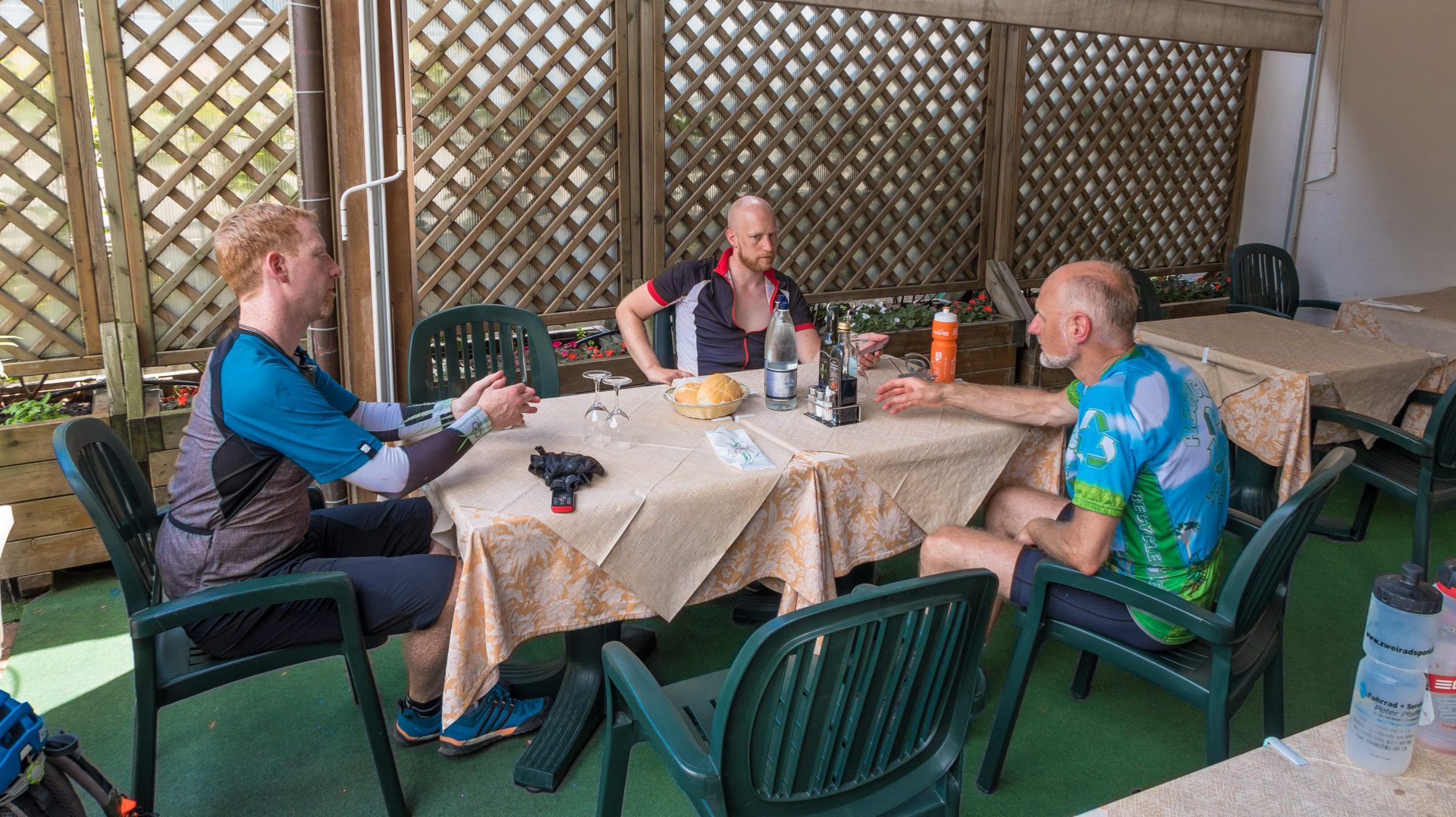In Sarche, in der Pizzeria Al Convento machen wir erst einmal Mittag, dort gitb es nicht nur Italienisch, sondern auch indisch – was für eine Kombination. Egal, Essen hat geschmeckt, wir sind gestärkt für die letzten Kilometer unseres Alpencross. Ein obligatorische Stopp beim Eis Maui in Dro ist selbstverständlich, das hab ich schon immer so gemacht, das werde ich auch immer so machen.