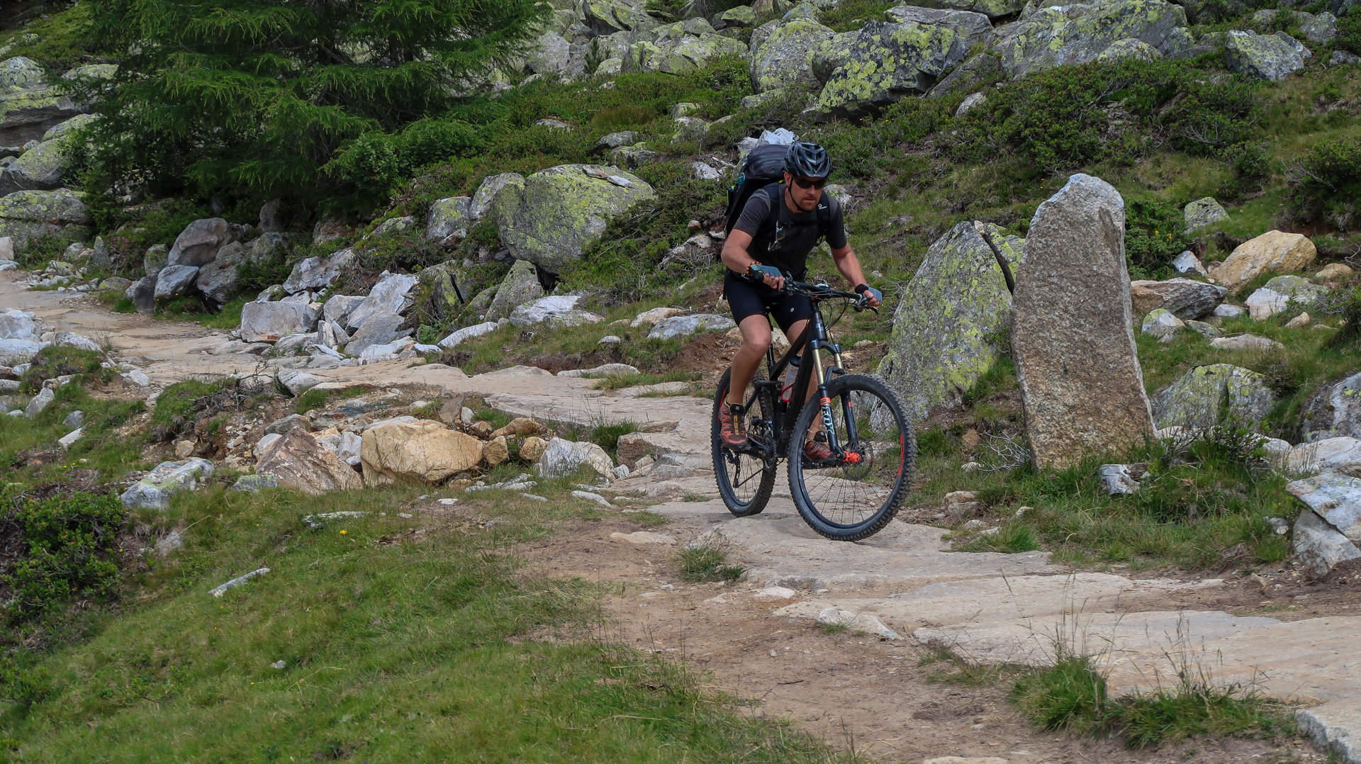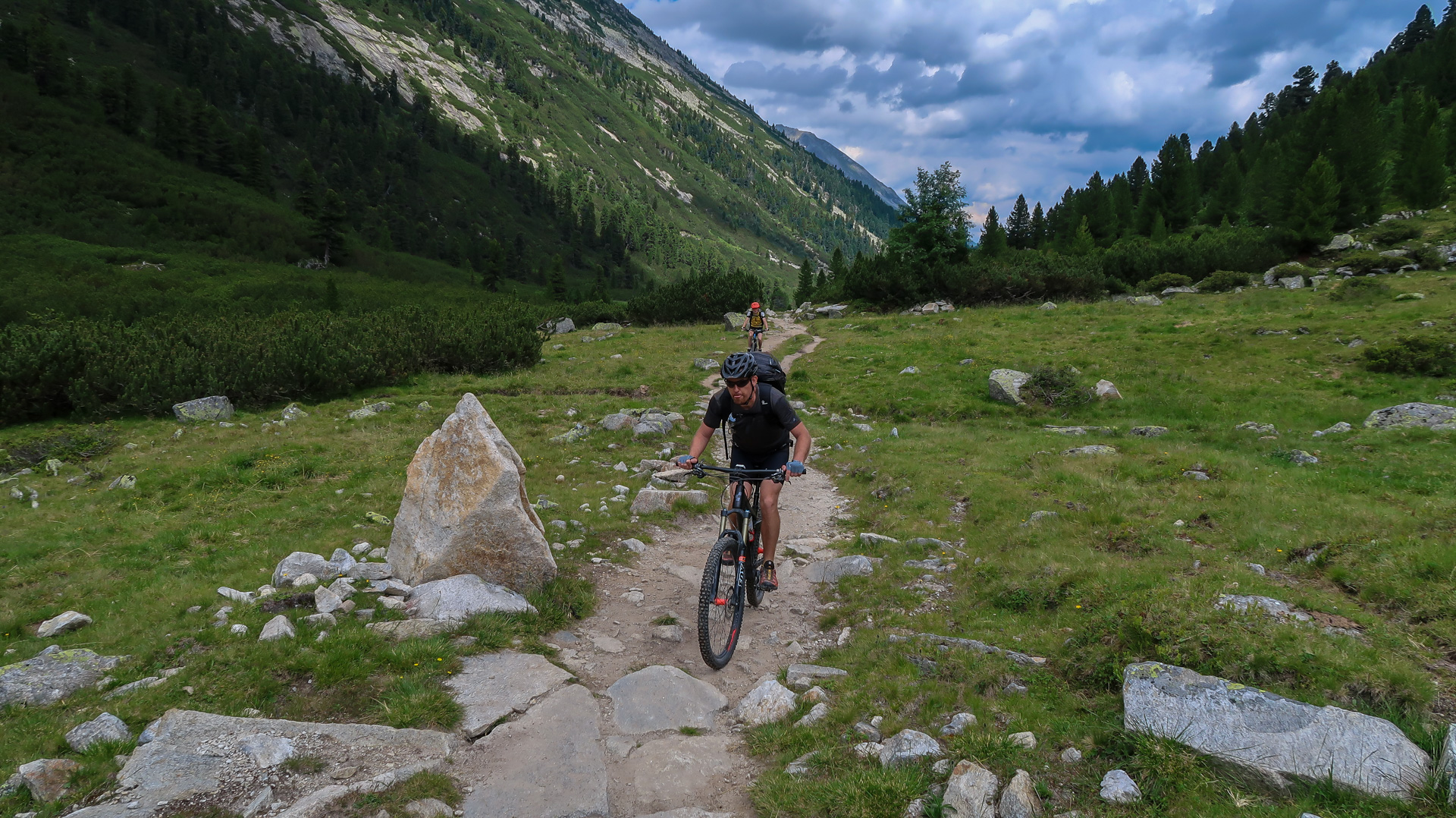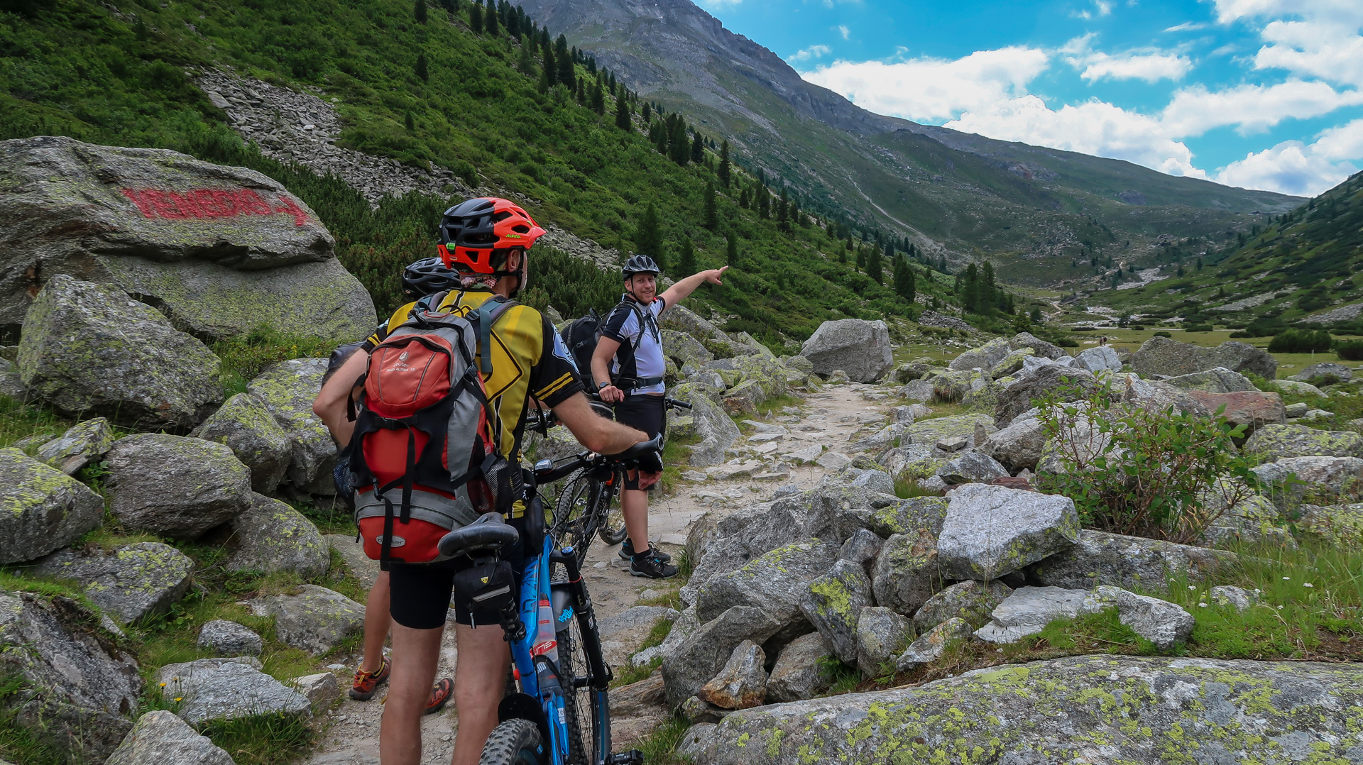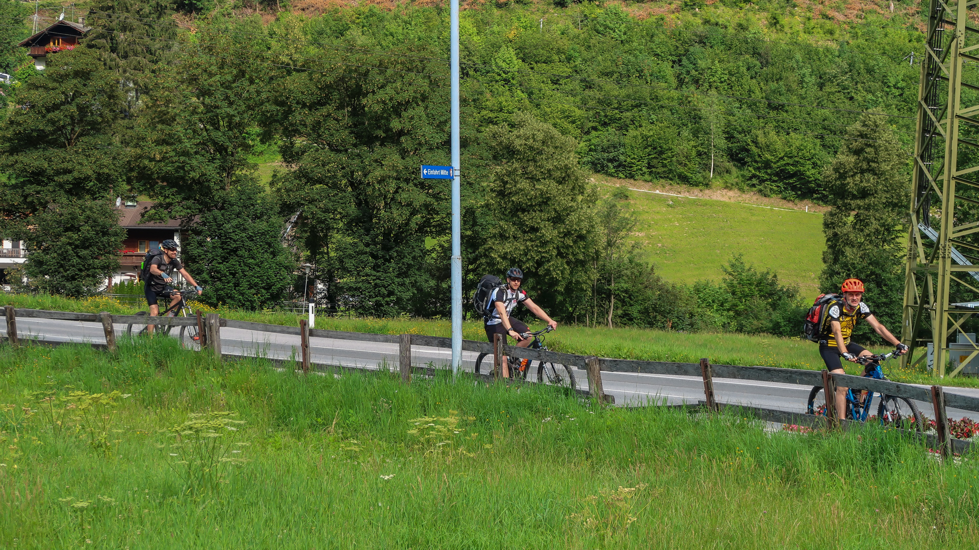 Jetzt folgt der alte Militärweg, mal aus feinem und mal aus grobem Schotter, hinunter nach Sankt Jakob ins Pfitschertal. Wir werden im Laufe der kompletten Abfahrt über 1.500 m an Höhe vernichten. Man fährt sich fast in einen Rausch, der immer wärmer werdende Fahrtwind, das hinab „rollen lassen“ und die Eindrücke der Berglandschaft machen auch diese Abfahrt zu einem Erlebnis. Nach Schotter folgt ein Wiesenpfad, danach rauschen wir hinab auf Straße, stellenweise haben unsere Tachos über 70 km/h drauf – echt krass. Einen kleiner Trail zwischen 3 Serpentienen machen fahrtechnisch auch Spaß, weiter geht es auf Straße bis nach Wiesen. Wir bemerkten eine Abzweigung mit Schild auf der rechten Seite: Riva 1.5 km – dass wir so schnell sind haben wir nicht gewusst 😉