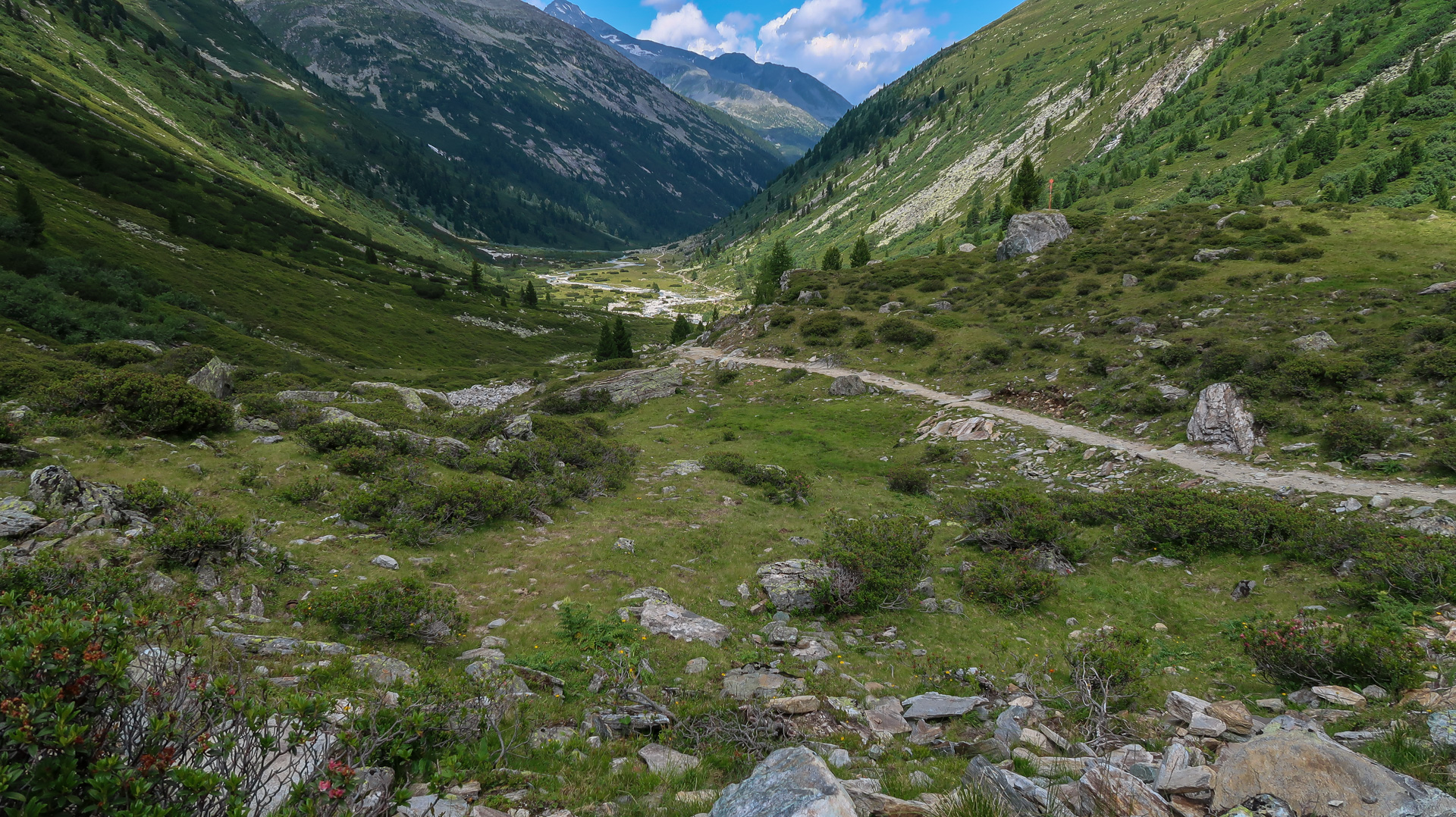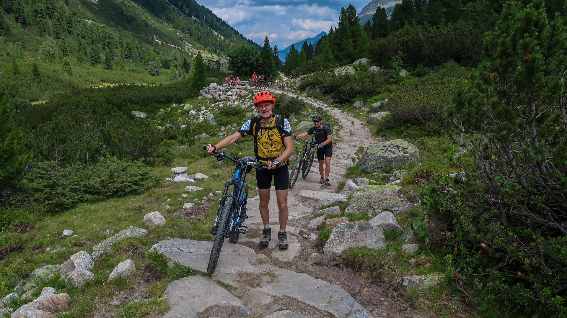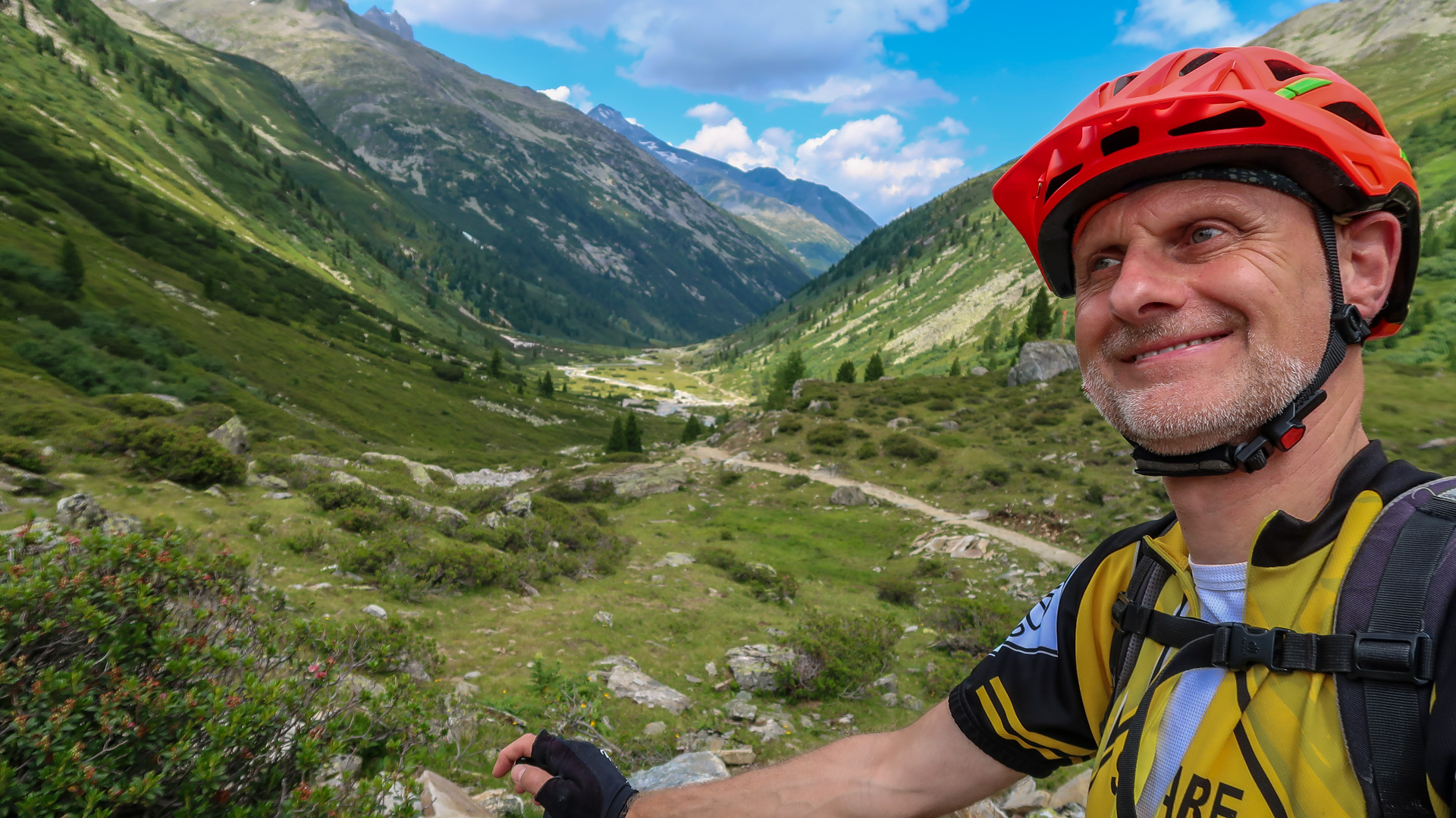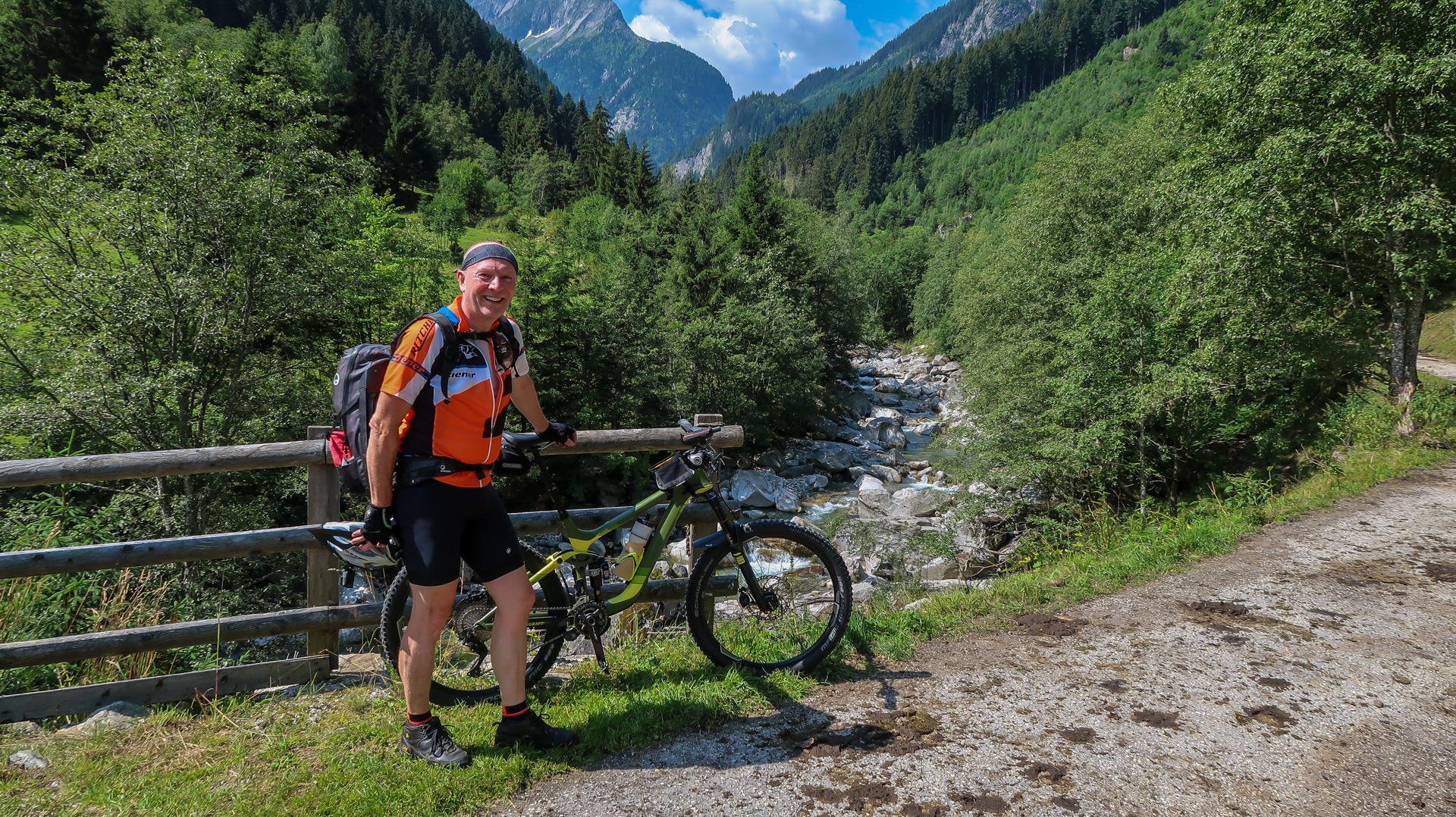 Jetzt folgt der alte Militärweg, mal aus feinem und mal aus grobem Schotter, hinunter nach Sankt Jakob ins Pfitschertal. Wir werden im Laufe der kompletten Abfahrt über 1.500 m an Höhe vernichten. Man fährt sich fast in einen Rausch, der immer wärmer werdende Fahrtwind, das hinab „rollen lassen“ und die Eindrücke der Berglandschaft machen auch diese Abfahrt zu einem Erlebnis. Nach Schotter folgt ein Wiesenpfad, danach rauschen wir hinab auf Straße, stellenweise haben unsere Tachos über 70 km/h drauf – echt krass. Einen kleiner Trail zwischen 3 Serpentienen machen fahrtechnisch auch Spaß, weiter geht es auf Straße bis nach Wiesen. Wir bemerkten eine Abzweigung mit Schild auf der rechten Seite: Riva 1.5 km – dass wir so schnell sind haben wir nicht gewusst 😉