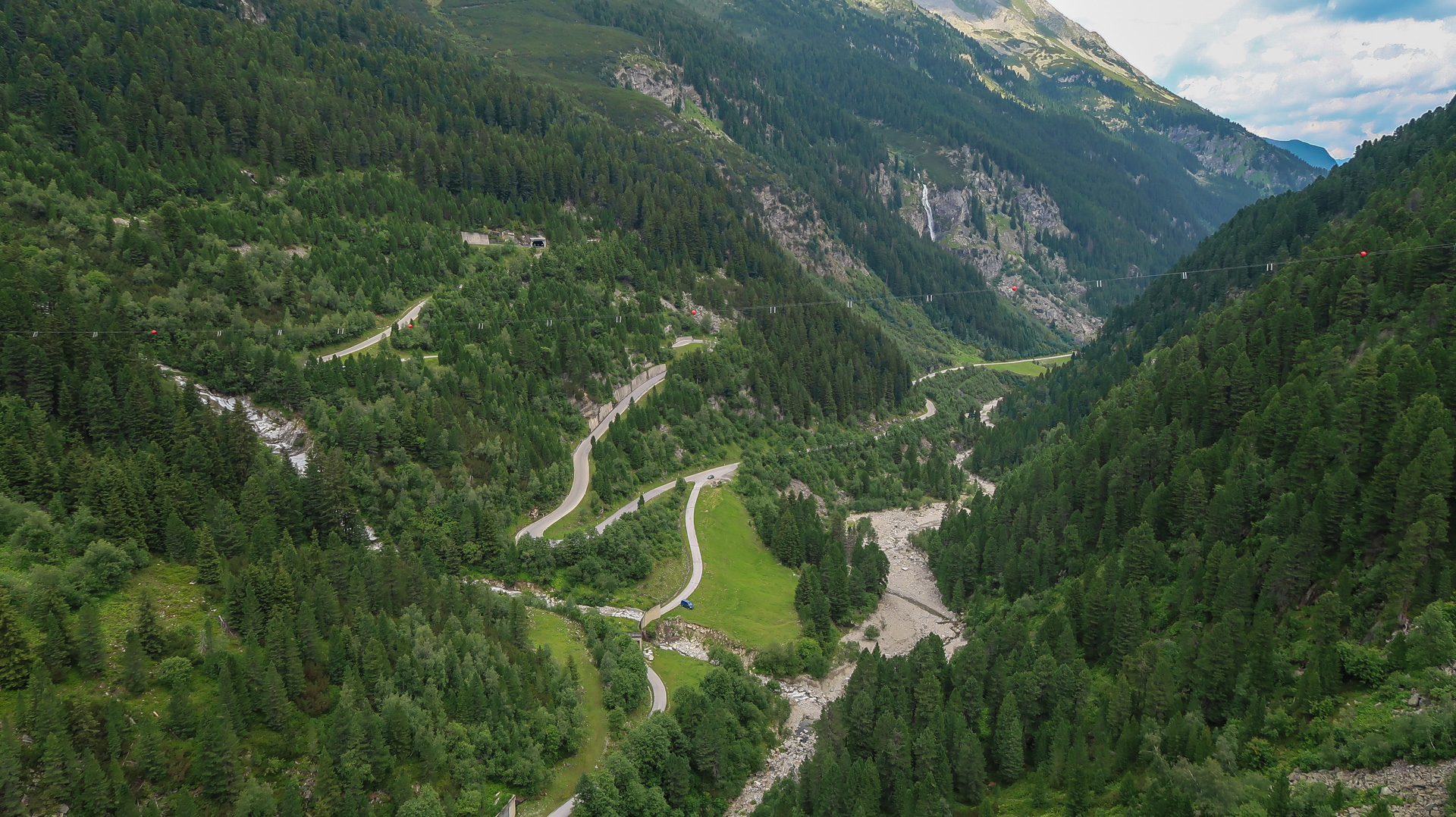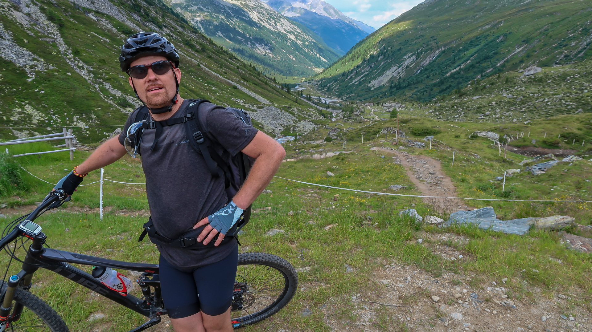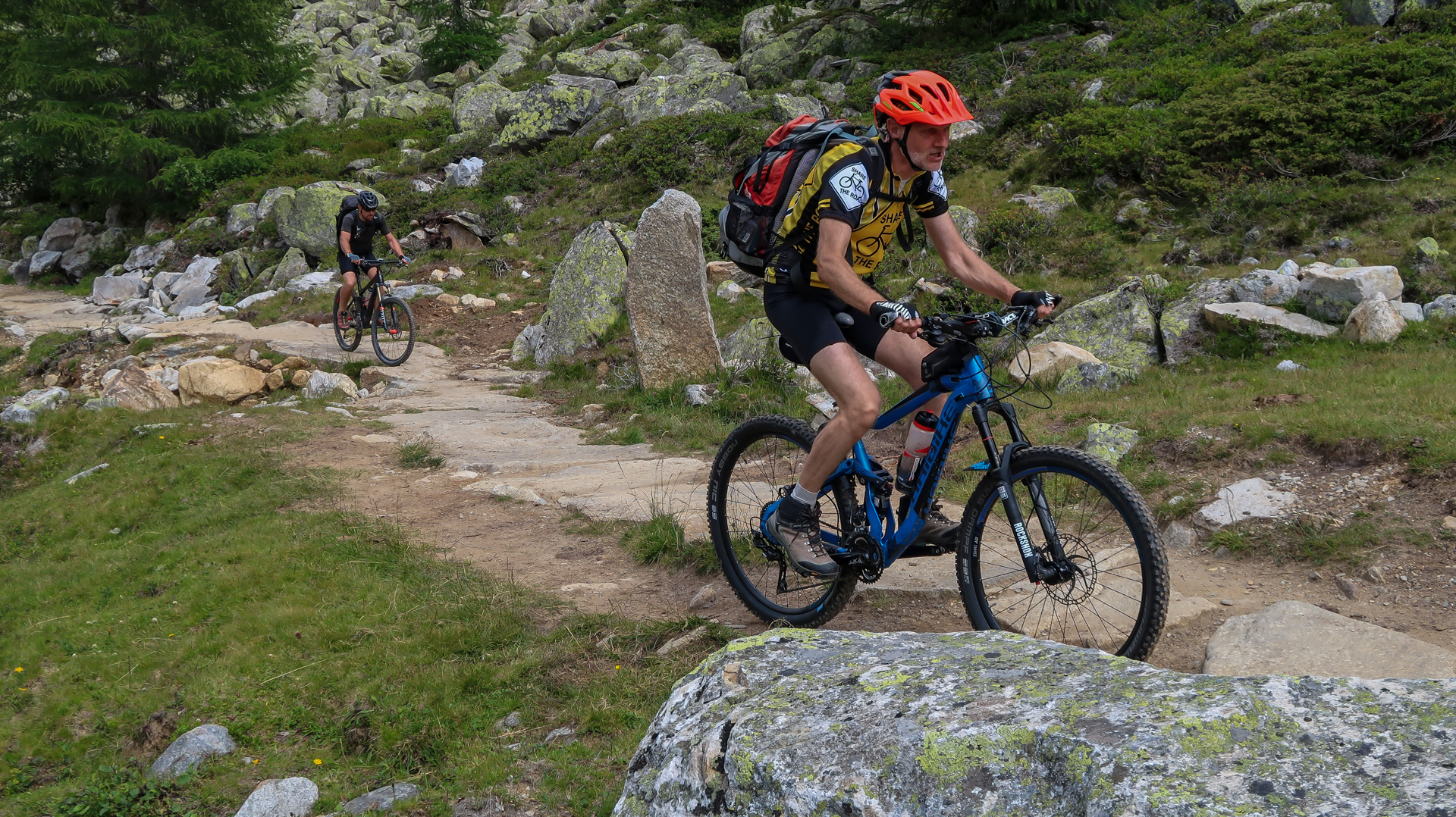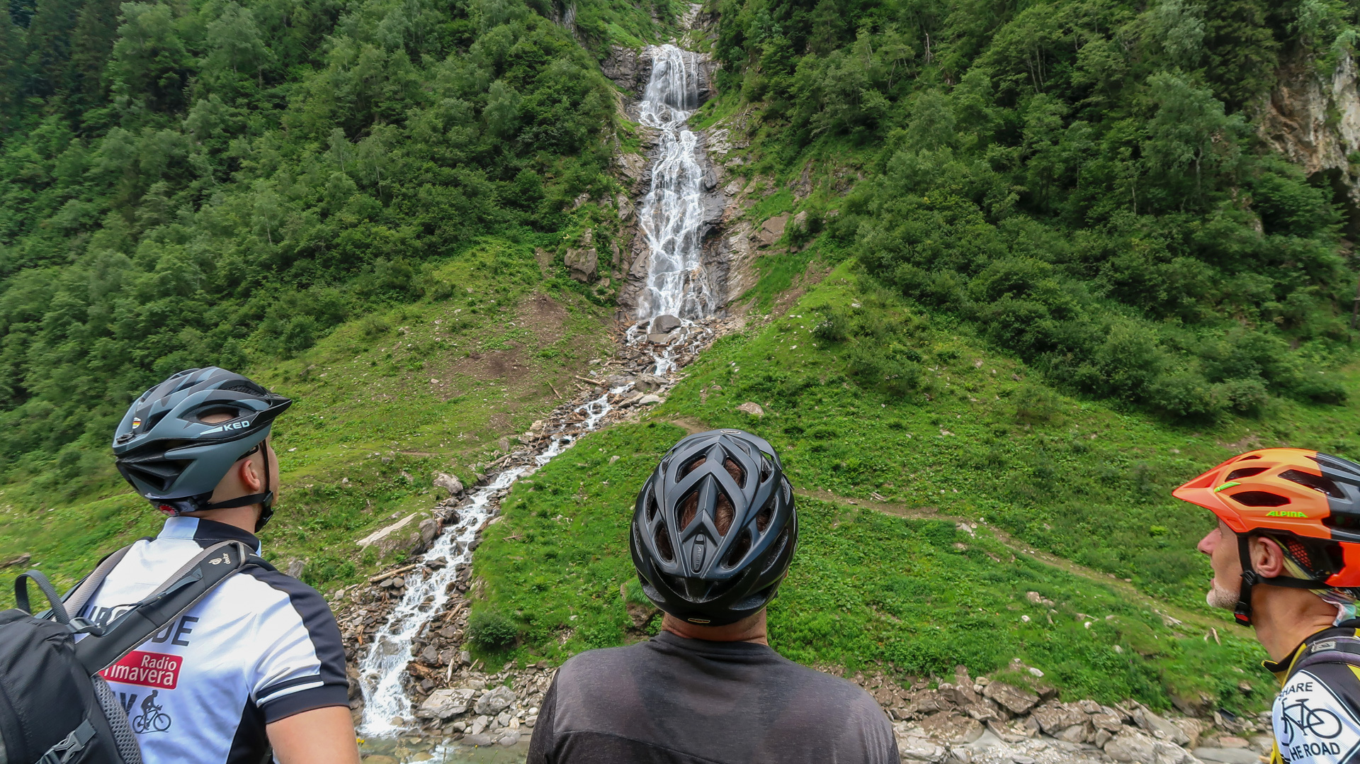 Jetzt folgt der alte Militärweg, mal aus feinem und mal aus grobem Schotter, hinunter nach Sankt Jakob ins Pfitschertal. Wir werden im Laufe der kompletten Abfahrt über 1.500 m an Höhe vernichten. Man fährt sich fast in einen Rausch, der immer wärmer werdende Fahrtwind, das hinab „rollen lassen“ und die Eindrücke der Berglandschaft machen auch diese Abfahrt zu einem Erlebnis. Nach Schotter folgt ein Wiesenpfad, danach rauschen wir hinab auf Straße, stellenweise haben unsere Tachos über 70 km/h drauf – echt krass. Einen kleiner Trail zwischen 3 Serpentienen machen fahrtechnisch auch Spaß, weiter geht es auf Straße bis nach Wiesen. Wir bemerkten eine Abzweigung mit Schild auf der rechten Seite: Riva 1.5 km – dass wir so schnell sind haben wir nicht gewusst 😉