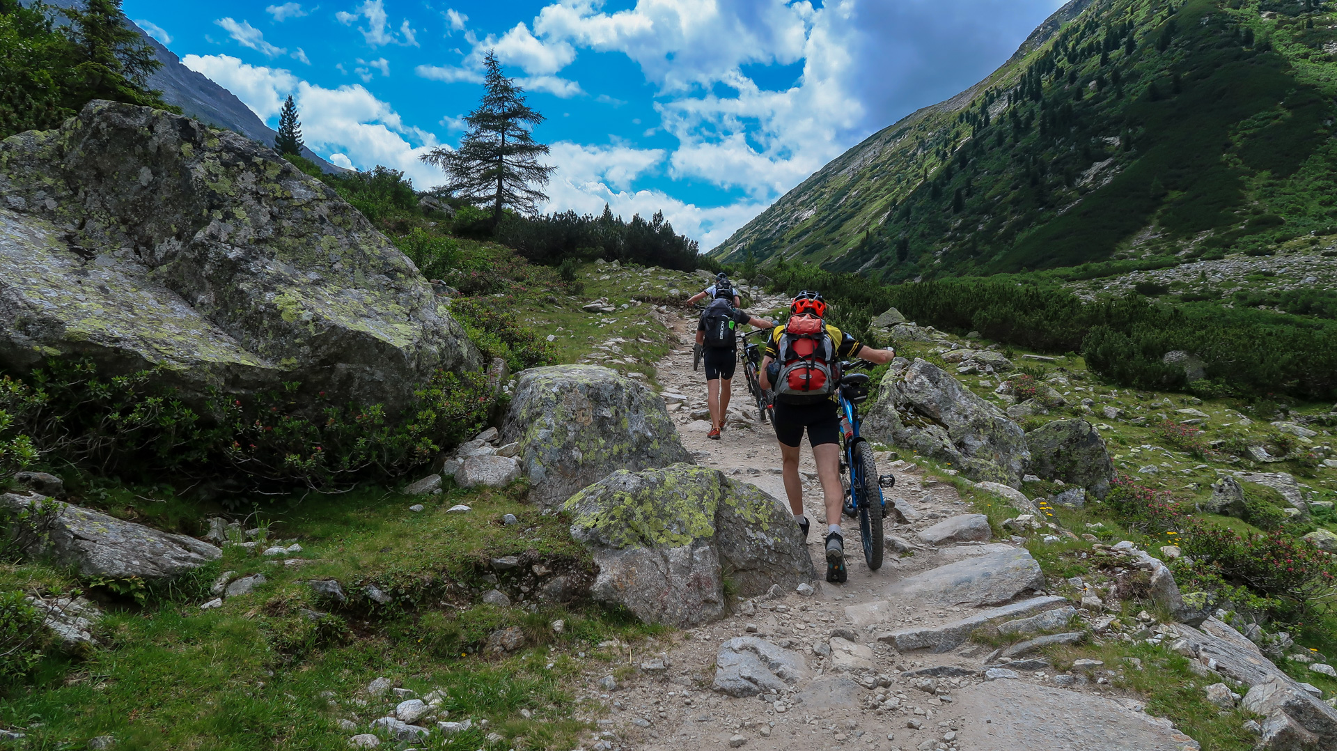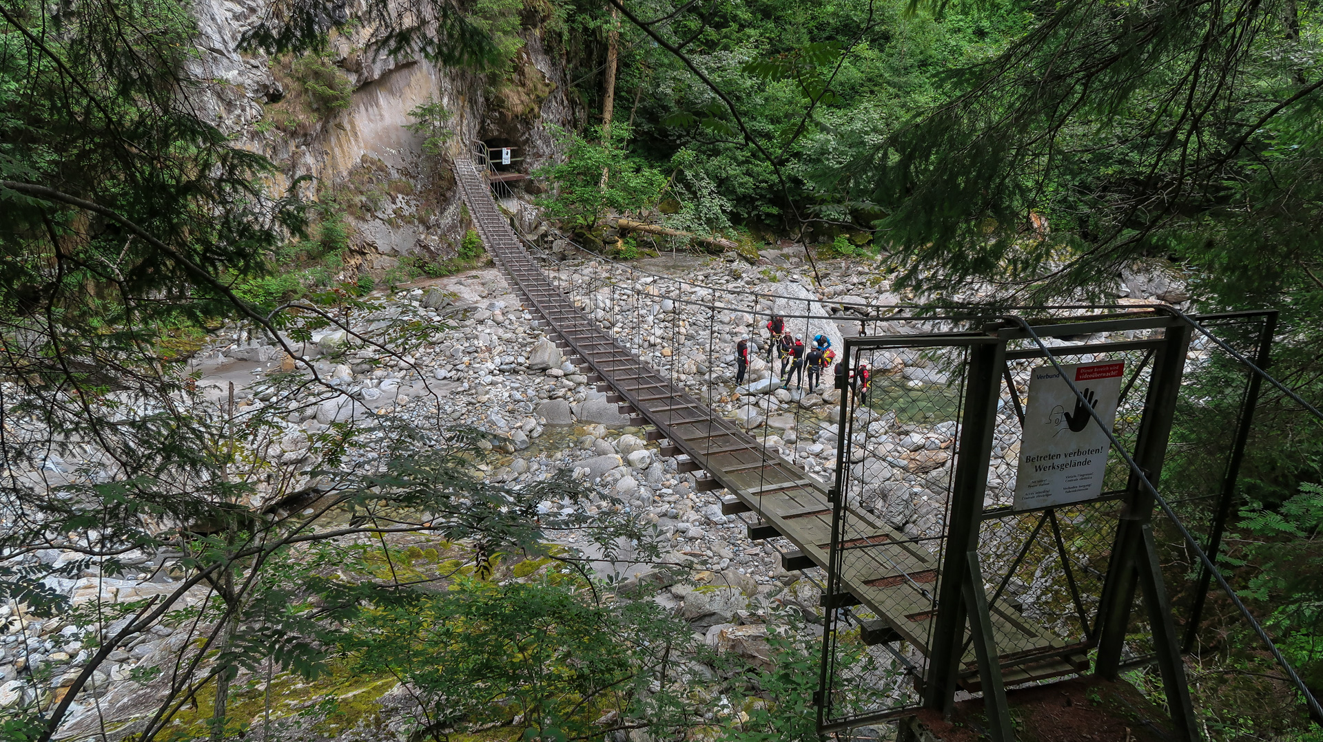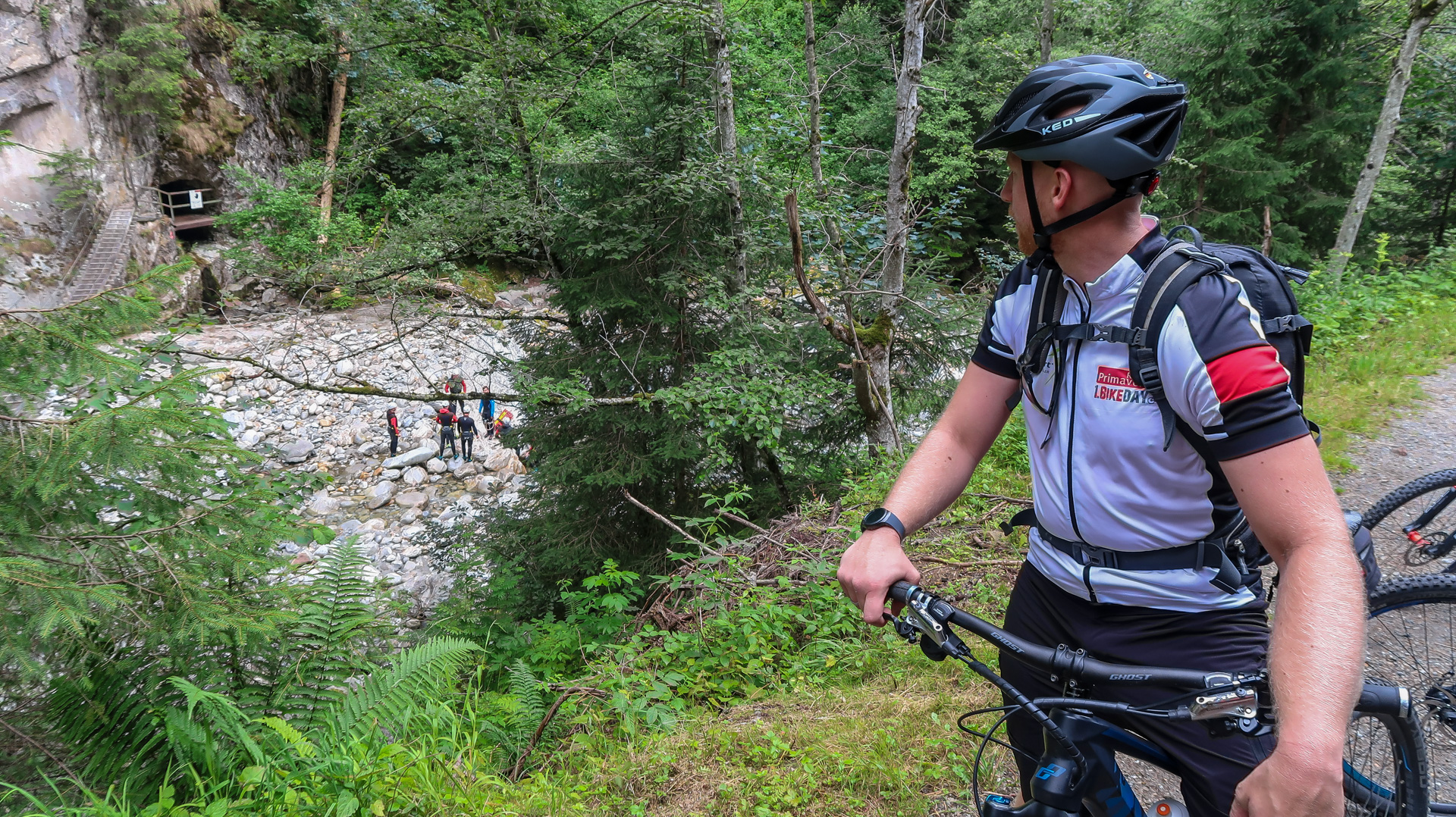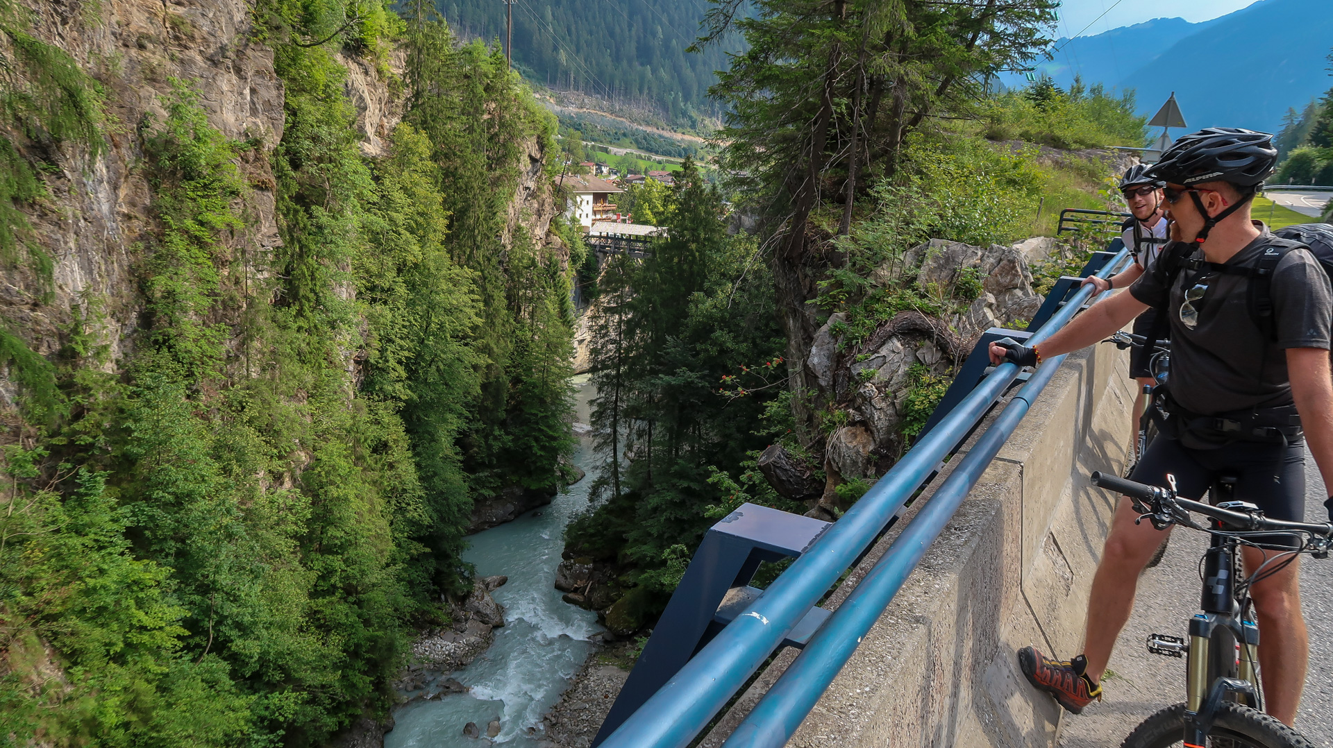 Nachdem die Autos geparkt und die Rucksäcke fertig gepackt sind geht die Reise los. Zunächst raus aus Mayrhofen Richtung Jochberg. Gemächlich auf Straße, die aber ab & zu schon kleine Rampen für uns bereit hält. Wir müssen erst mal „in Tritt“ kommen. Vorbei an Schluchten, verlassen wir die Hauptstraße und bleiben rechts von ihr auf einem kleinen Asphaltsträßchen, dass sich mit Schotter abwechselt.