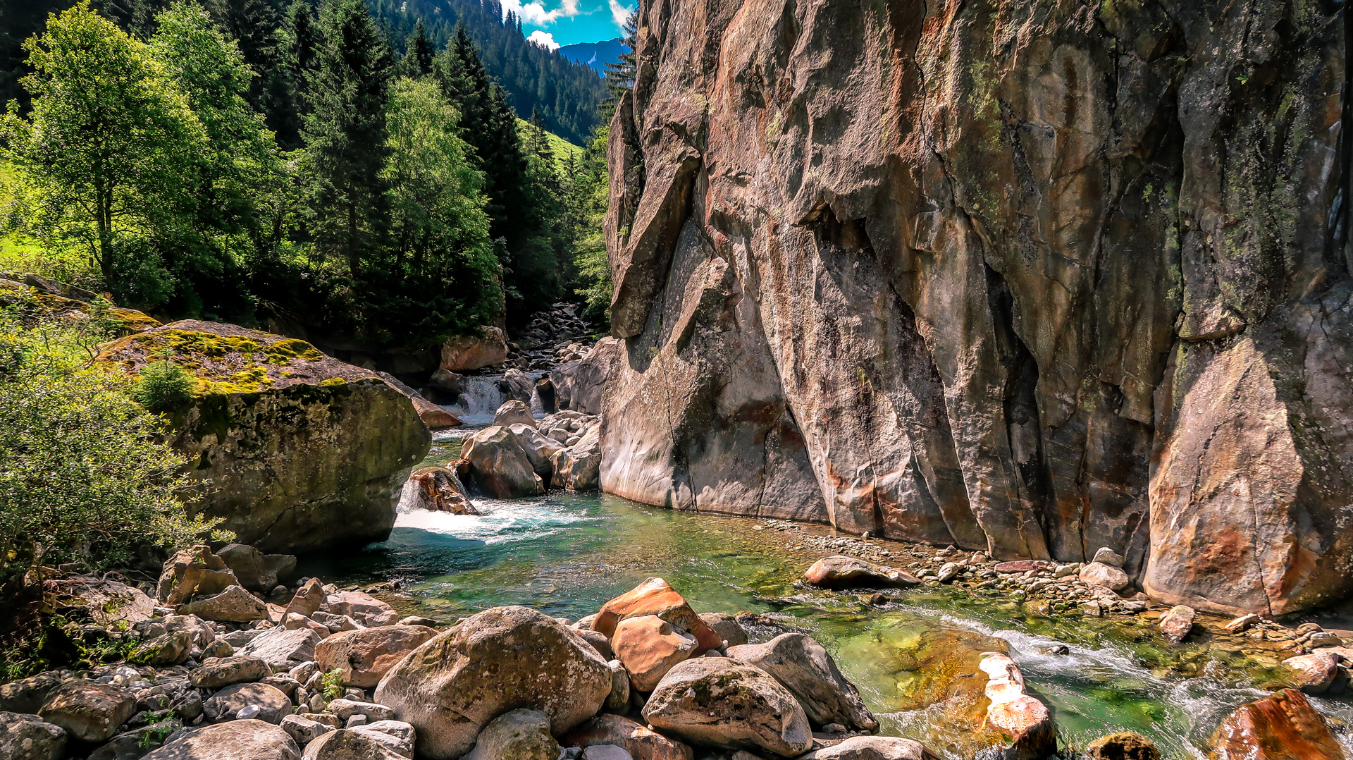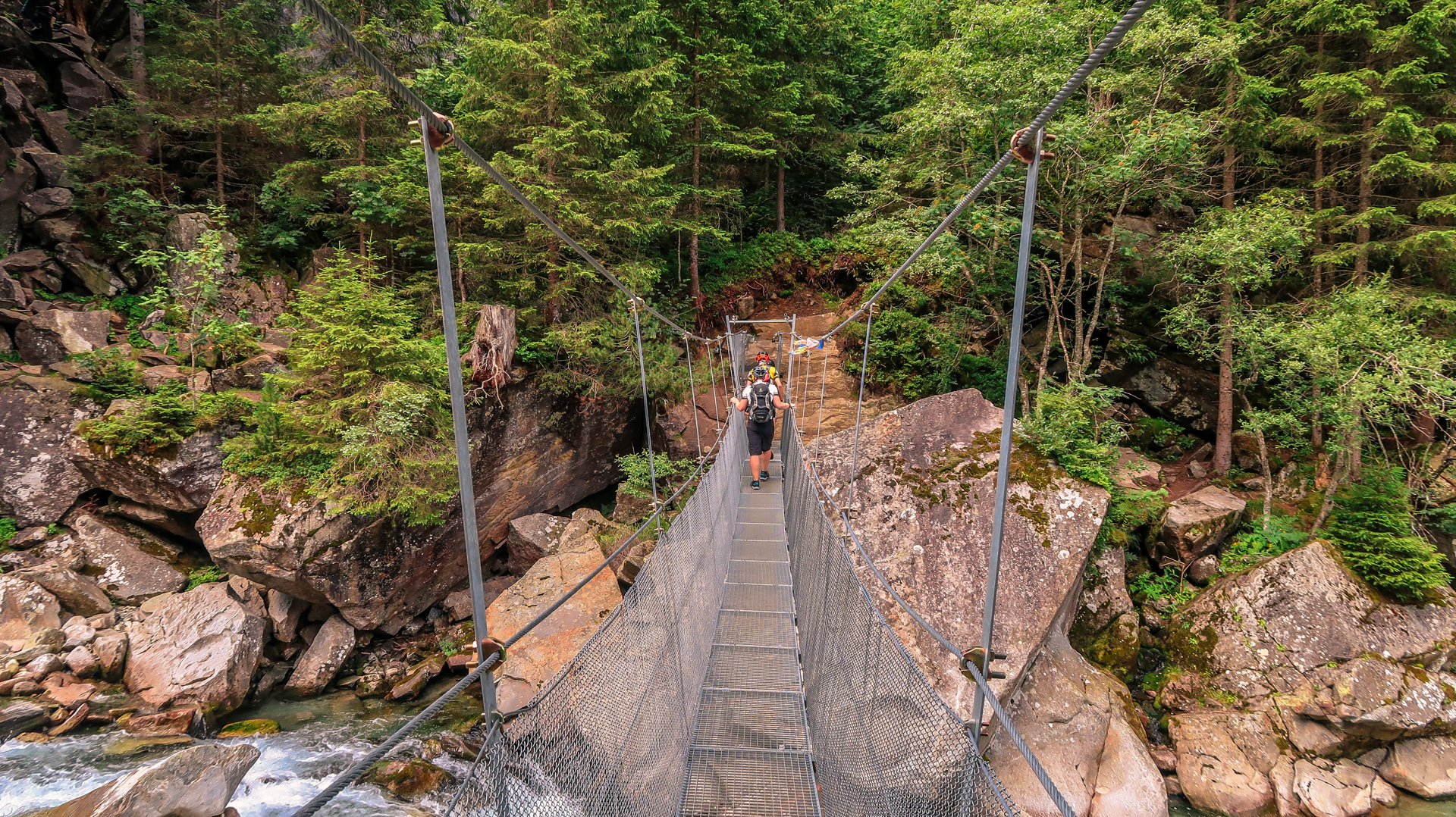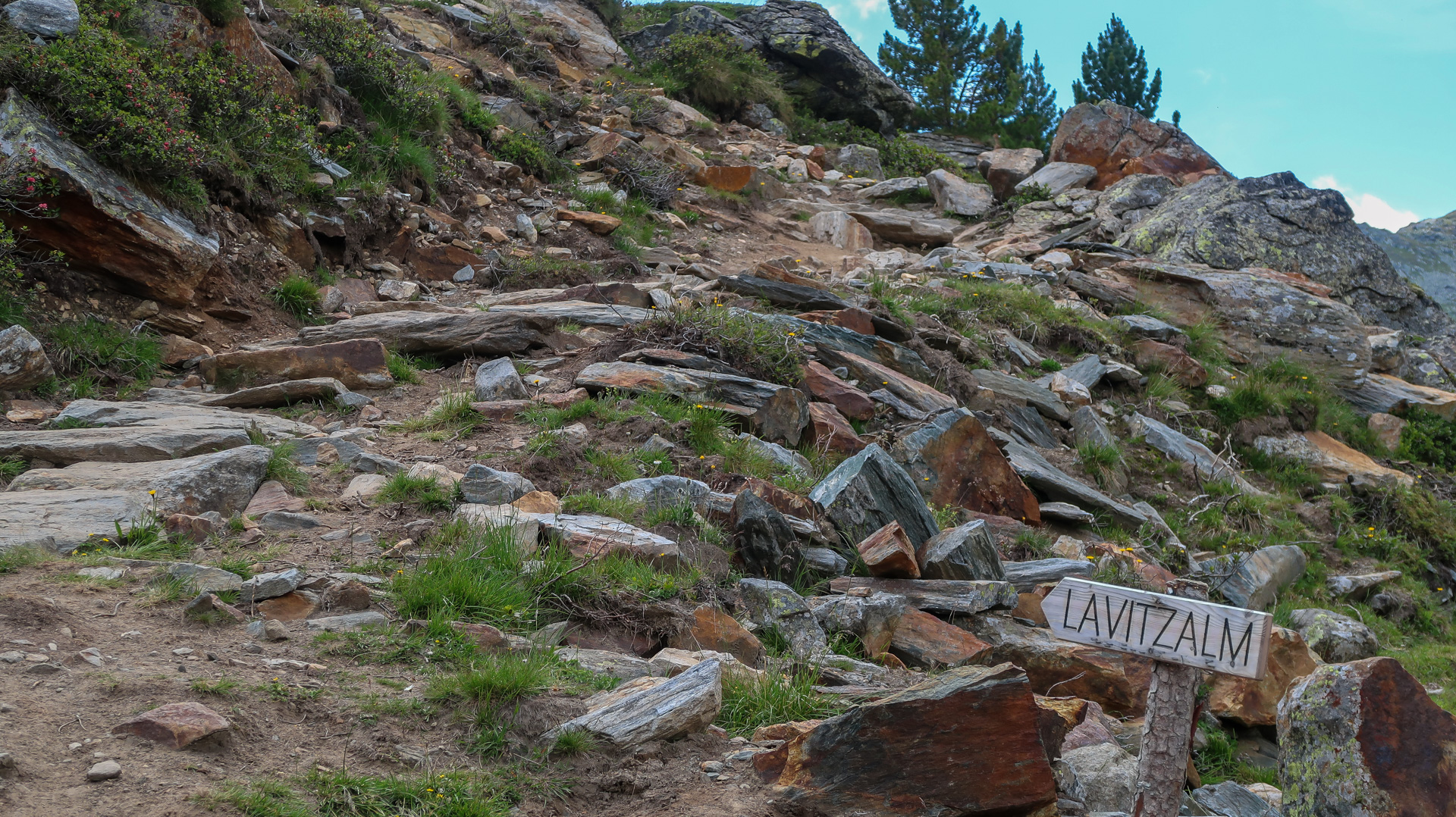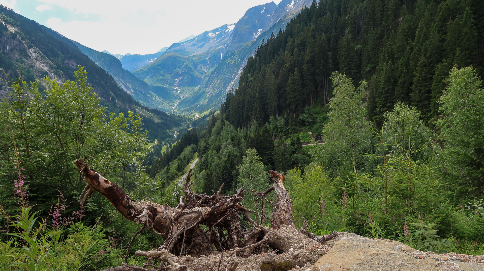 Nachdem die Autos geparkt und die Rucksäcke fertig gepackt sind geht die Reise los. Zunächst raus aus Mayrhofen Richtung Jochberg. Gemächlich auf Straße, die aber ab & zu schon kleine Rampen für uns bereit hält. Wir müssen erst mal „in Tritt“ kommen. Vorbei an Schluchten, verlassen wir die Hauptstraße und bleiben rechts von ihr auf einem kleinen Asphaltsträßchen, dass sich mit Schotter abwechselt.