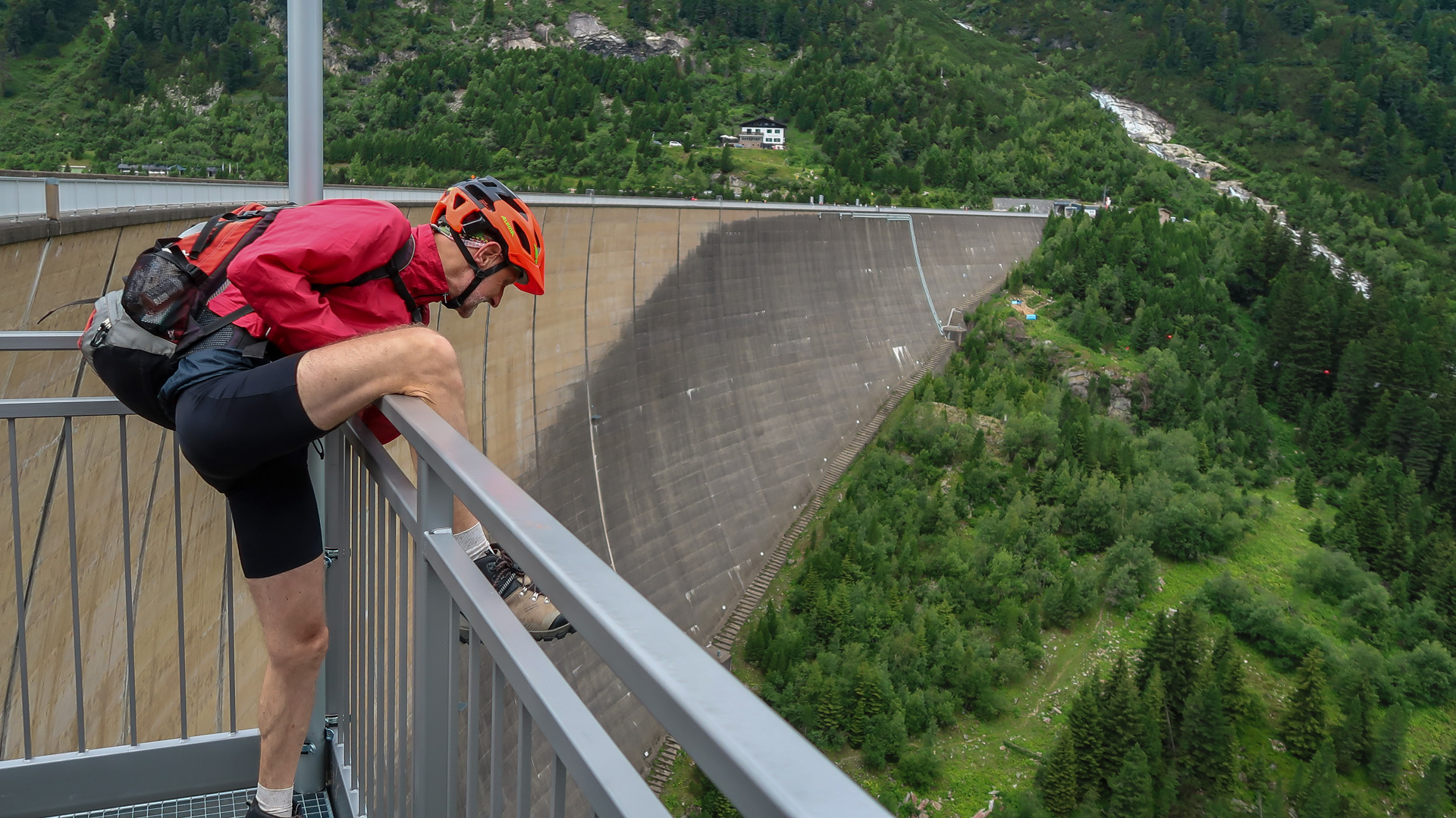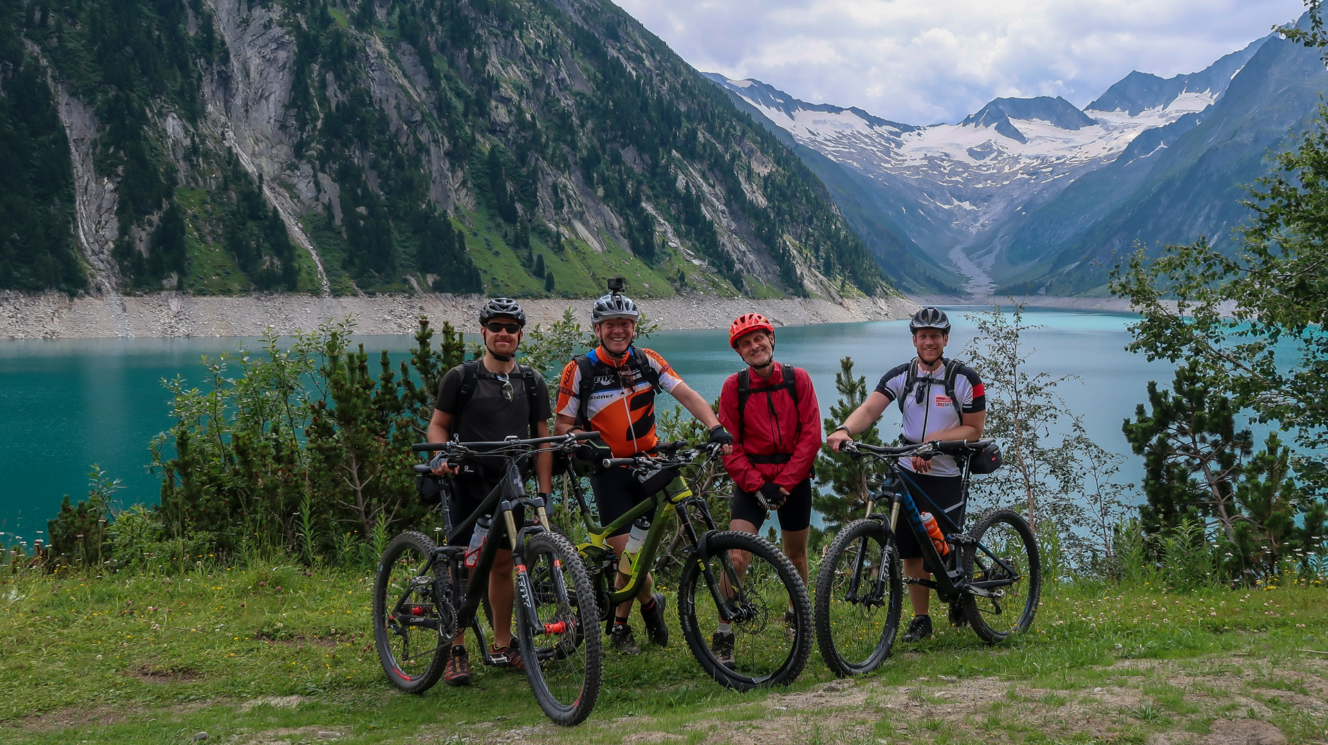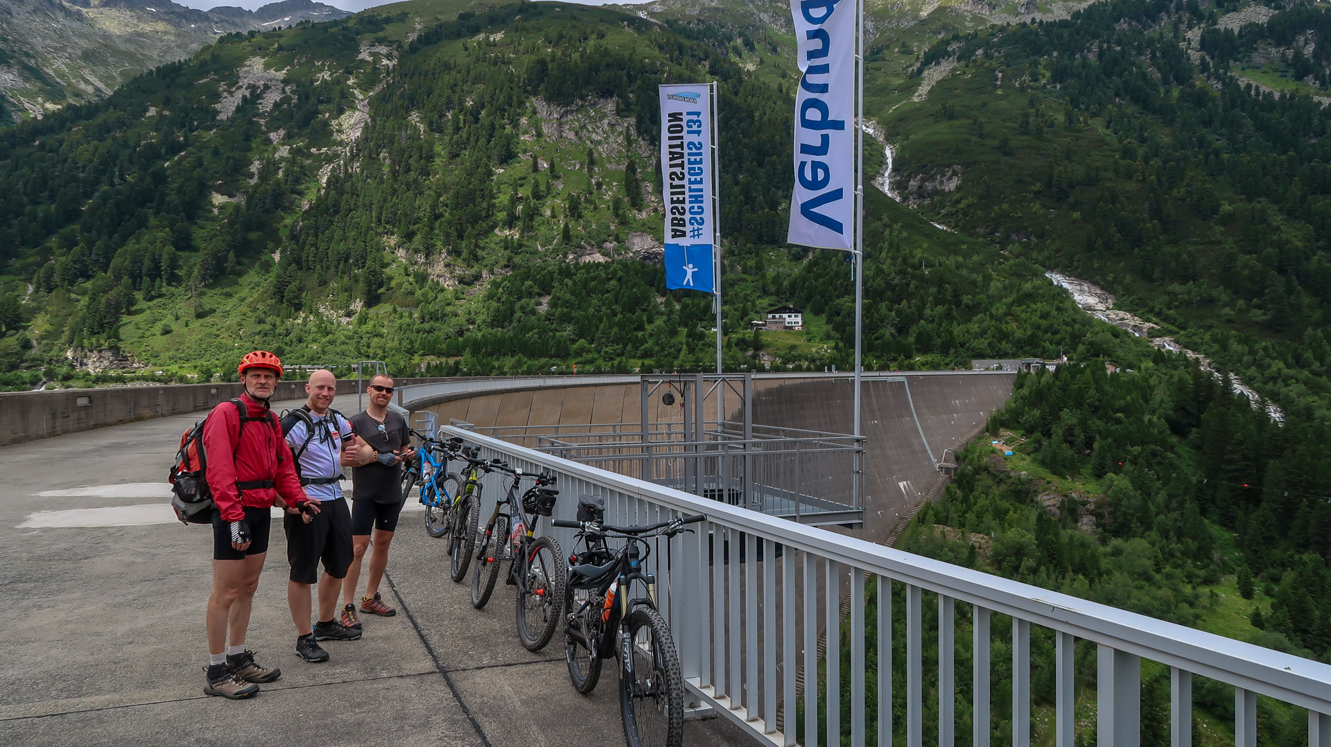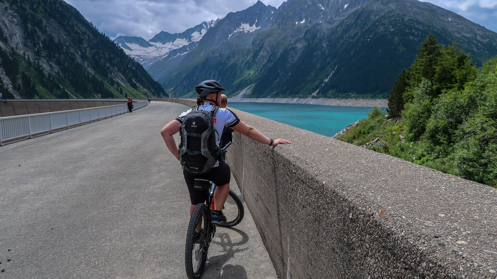 Wir machen eine kleine Fotopause an einem herrlichen Wasserfall, der sich mit Getöse den Berg herunter stürzt. Auf einem kleinen Pfad erkennen wir 2 Wanderer, da hat man einen tollen Größenvergleich zum Wasserfall und merkt schnell, wie klein wir eigentlich sind. Immer weiter geht es bergauf, bis wir nach 17 km die Mautstelle für Autofahrer erblicken. Wir dürfen uns auf die nach rechts abzweigende Bikepiste begeben. Anfangs etwas steiler Schotterweg, dann ein schmalerer Weg weiter folgend. Hier war ich auch schon mal bei meinem Alpencross von 2007. Damals war dieser Weg noch ein ganz kleiner Pfad, jetzt ist er viel breiter und mit Schotter bedeckter. Warum macht man sowas? Ich fand den schmalen wesentlich besser und der Natur schadet es auch, wenn alle Wege geebnet werden. Der Weg mündet wieder auf die Passstraße, die riesige Staumauer liegt uns zu Füßen. Jetzt heißt es noch ein paar Serpentienen hinauf kurbeln, zu guter letzt durch ein Tunnel und wir stehen auf der Staumauer des Schlegeisspeicher.