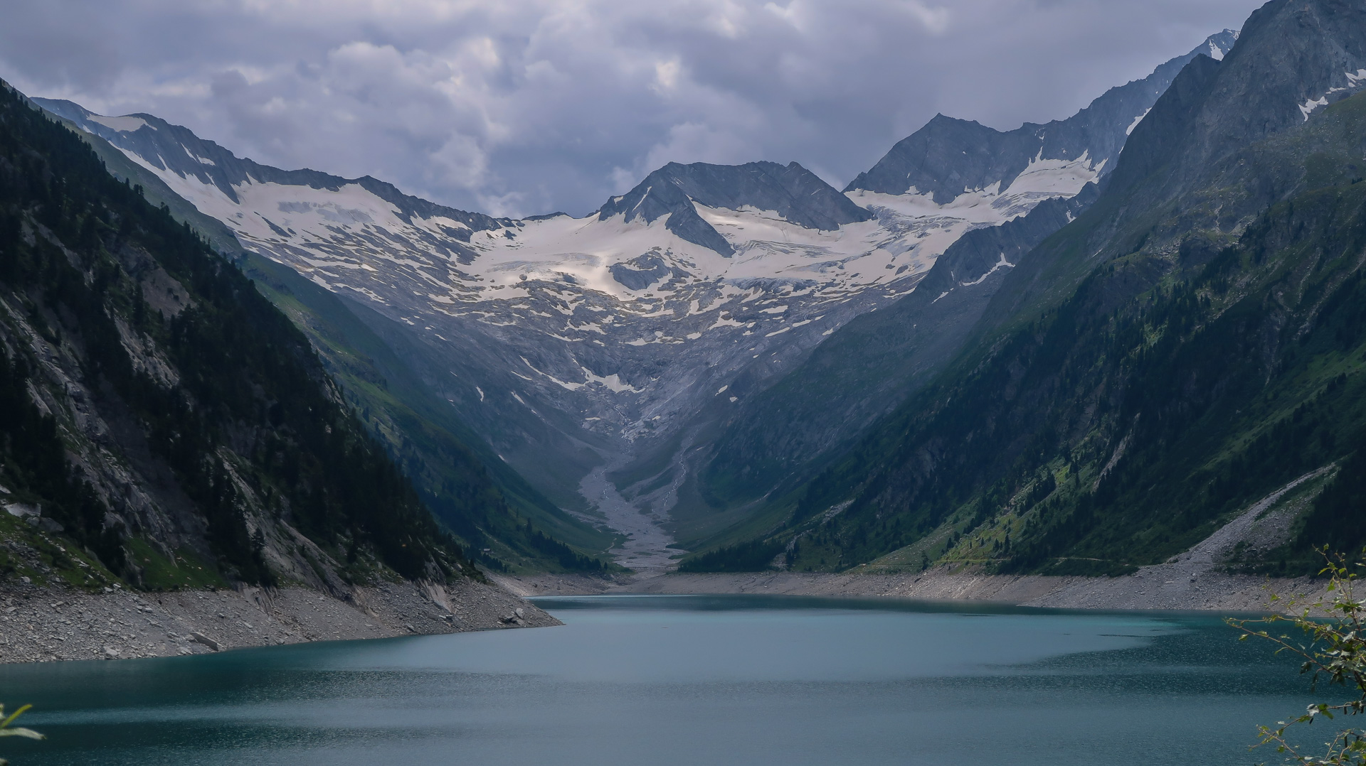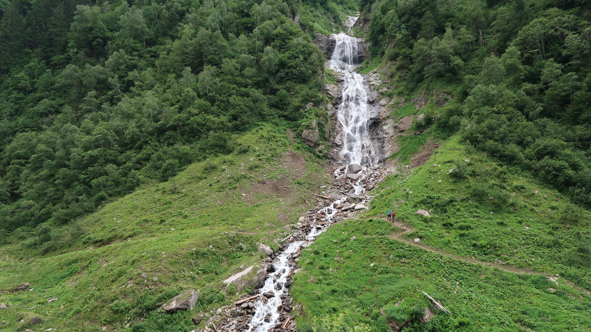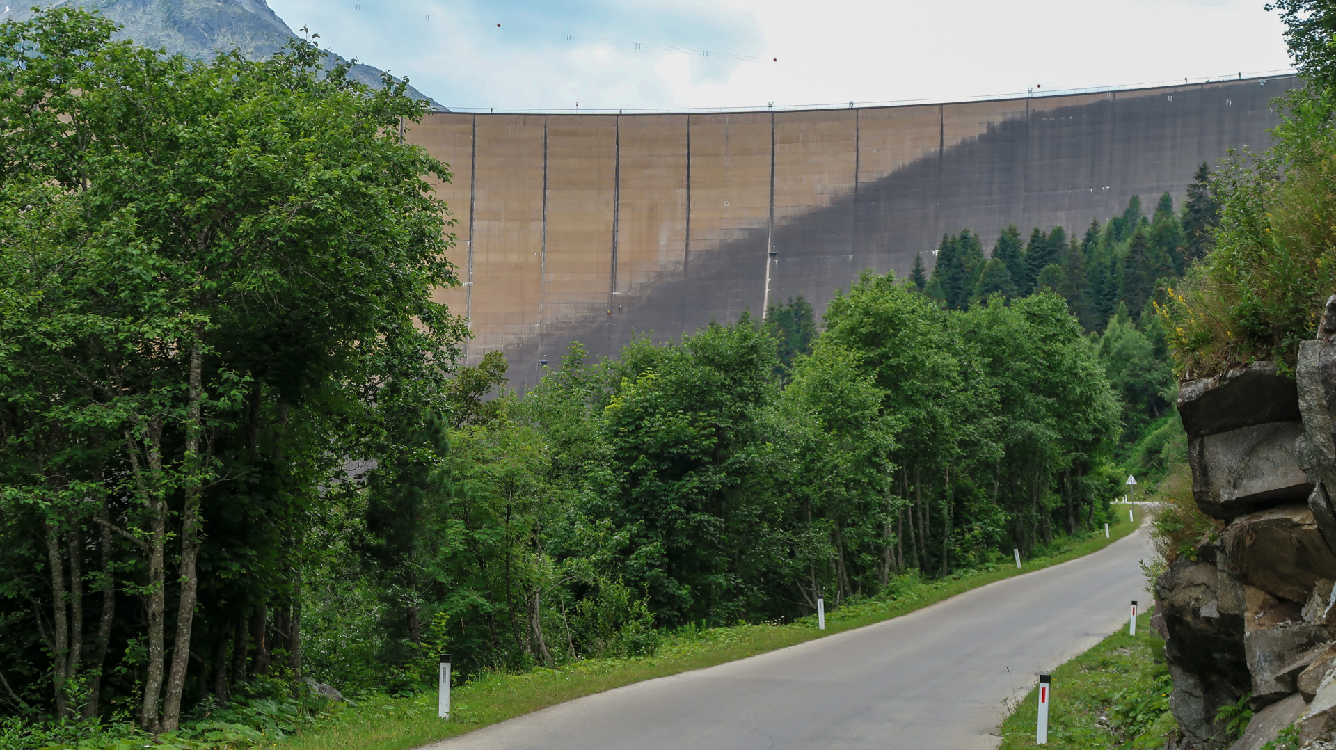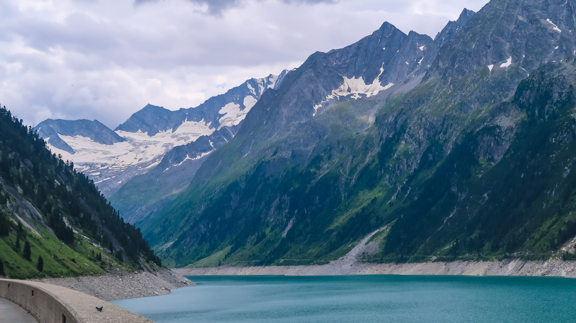 Wir machen eine kleine Fotopause an einem herrlichen Wasserfall, der sich mit Getöse den Berg herunter stürzt. Auf einem kleinen Pfad erkennen wir 2 Wanderer, da hat man einen tollen Größenvergleich zum Wasserfall und merkt schnell, wie klein wir eigentlich sind. Immer weiter geht es bergauf, bis wir nach 17 km die Mautstelle für Autofahrer erblicken. Wir dürfen uns auf die nach rechts abzweigende Bikepiste begeben. Anfangs etwas steiler Schotterweg, dann ein schmalerer Weg weiter folgend. Hier war ich auch schon mal bei meinem Alpencross von 2007. Damals war dieser Weg noch ein ganz kleiner Pfad, jetzt ist er viel breiter und mit Schotter bedeckter. Warum macht man sowas? Ich fand den schmalen wesentlich besser und der Natur schadet es auch, wenn alle Wege geebnet werden. Der Weg mündet wieder auf die Passstraße, die riesige Staumauer liegt uns zu Füßen. Jetzt heißt es noch ein paar Serpentienen hinauf kurbeln, zu guter letzt durch ein Tunnel und wir stehen auf der Staumauer des Schlegeisspeicher.