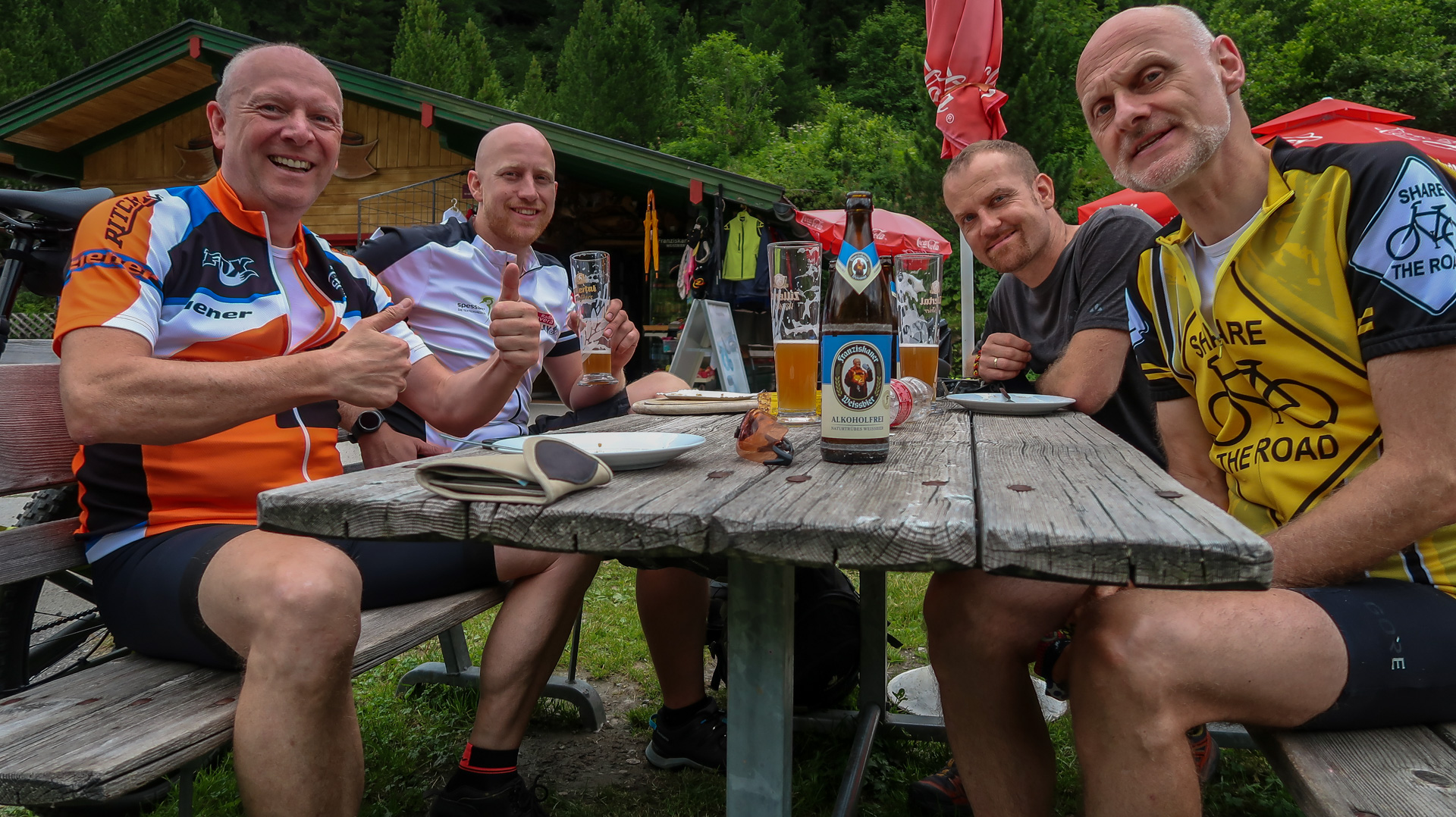 Es wird windiger, die dunklen Wolken auf den Gipfel deuten auf ein Gewitter hin. Also schnell einen Schlussspurt einlegen und ca. 6 km weiter sind wir am Ziel, Hotel Wieser in Stilfs angelangt. Wir setzen uns auf die Terrasse und stoßen mit einem kühlen frisch gezapften Bier gegenseitig auf den gelungen ersten Tag an!