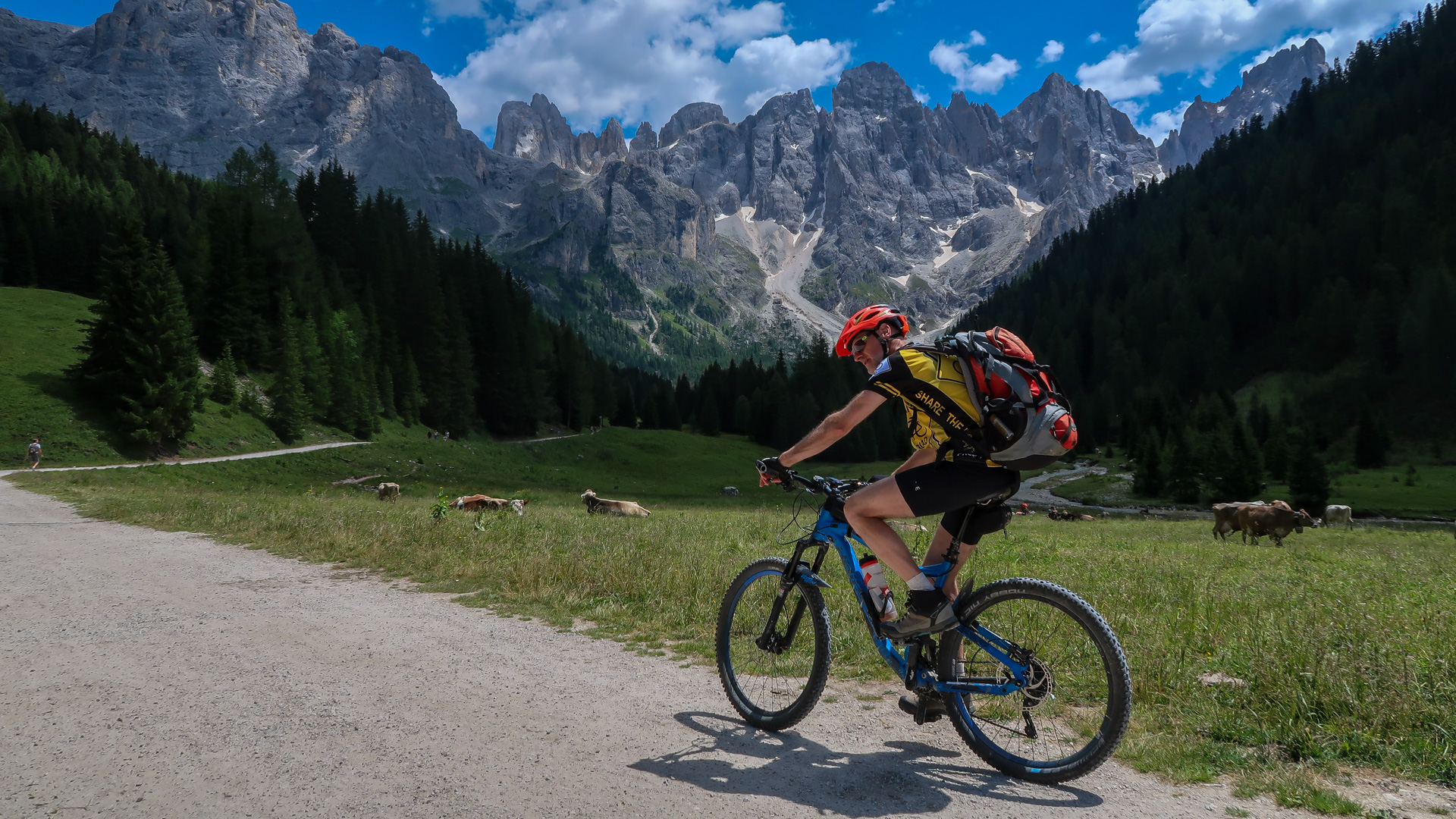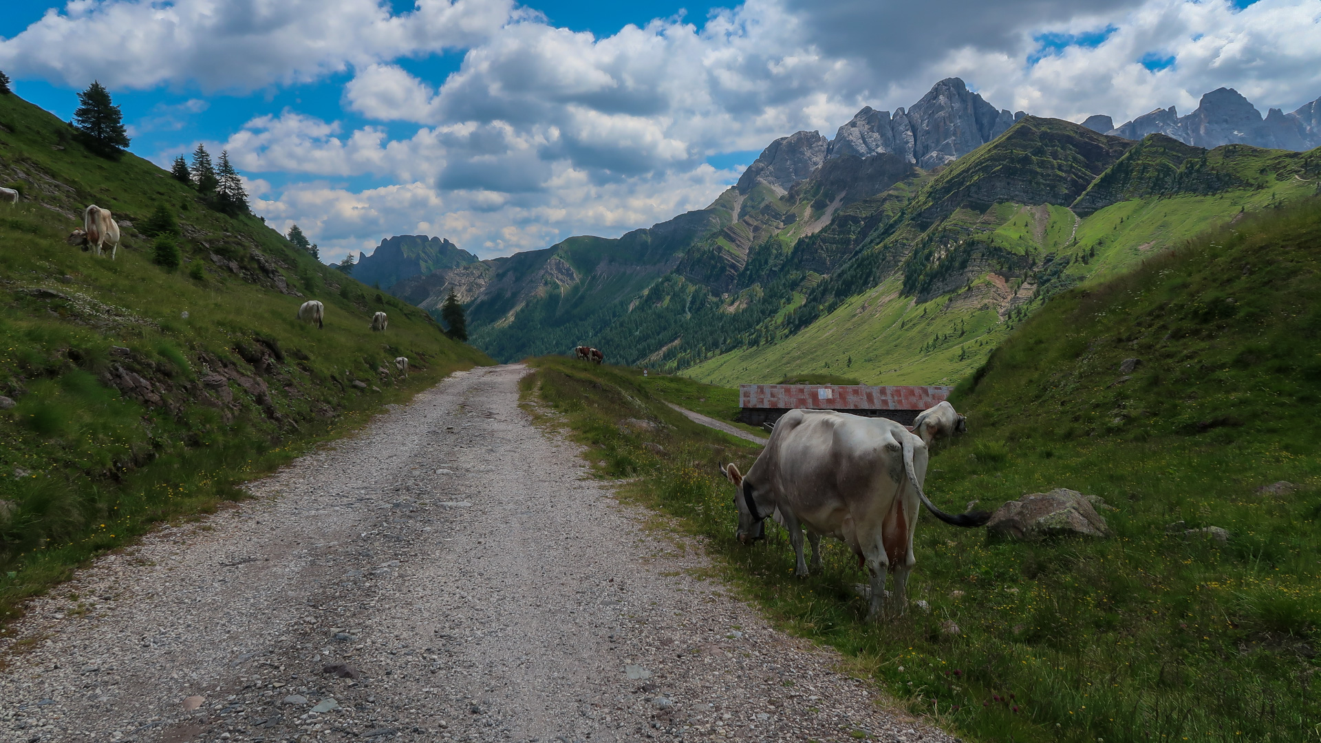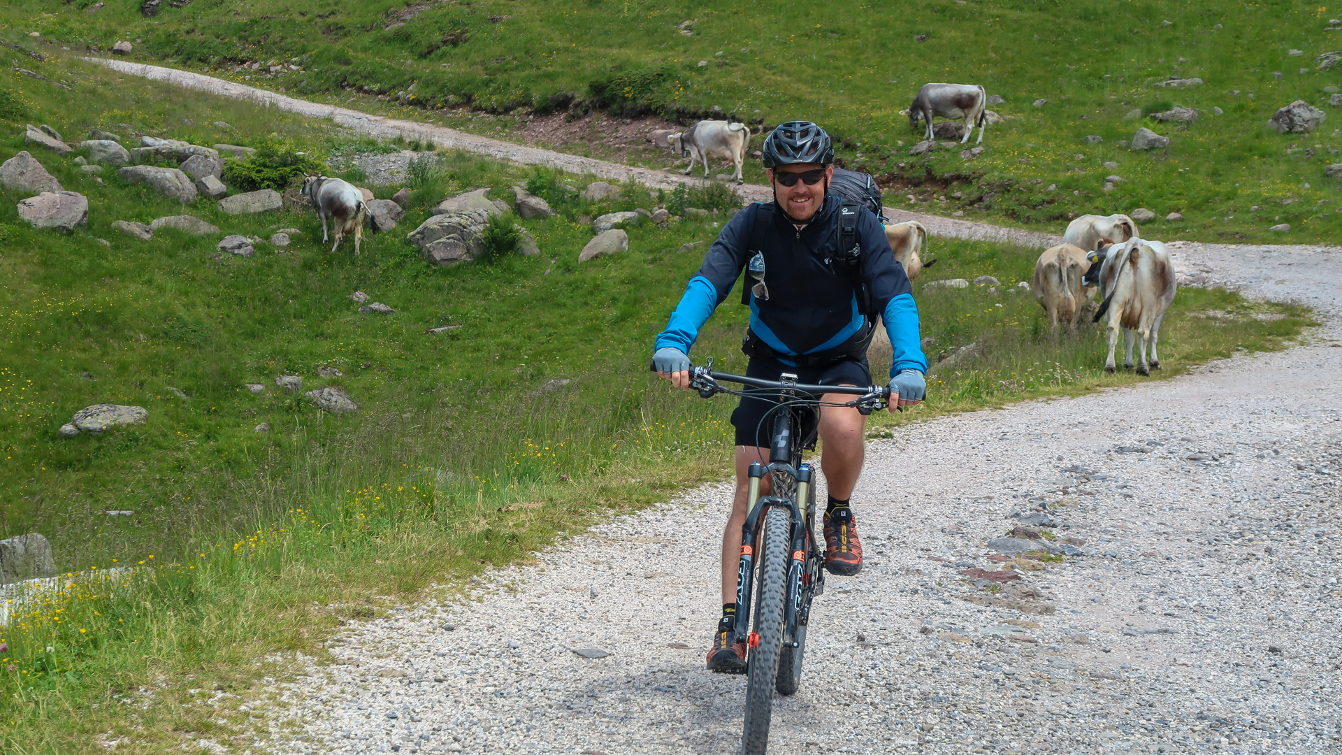 Teils auf der Skipiste hinunter, größtenteils Wanderwege entlang, immer im Flow und im Einklang mit dir selbst, so könnte man das beschreiben. Ab & zu versperren uns Kühe den Weg, dann rauschen wir weiter hinunter zum Vallespass. Ab hier geht der Tiefenrausch weitere 6 km auf Straße hinunter bis zum Eingang ins Val Venegia. Der eingeschlagene Weg steigt sanft mit 5% Steigung und es macht richtig Spaß der Sonne entgegen zu biken. Heute ist sehr viel los hier oben, die Italiener haben Urlaub und viele Wander & Ausflugsgruppen genießen dieses Tal.