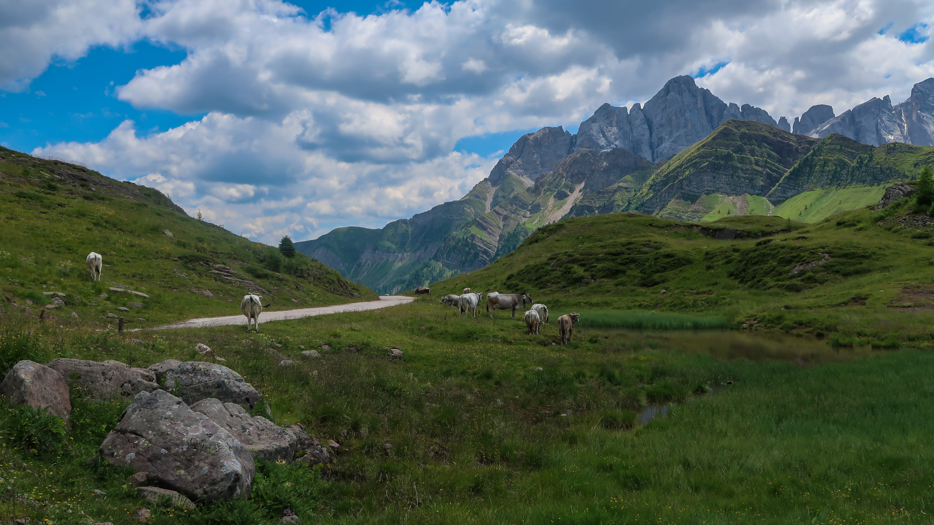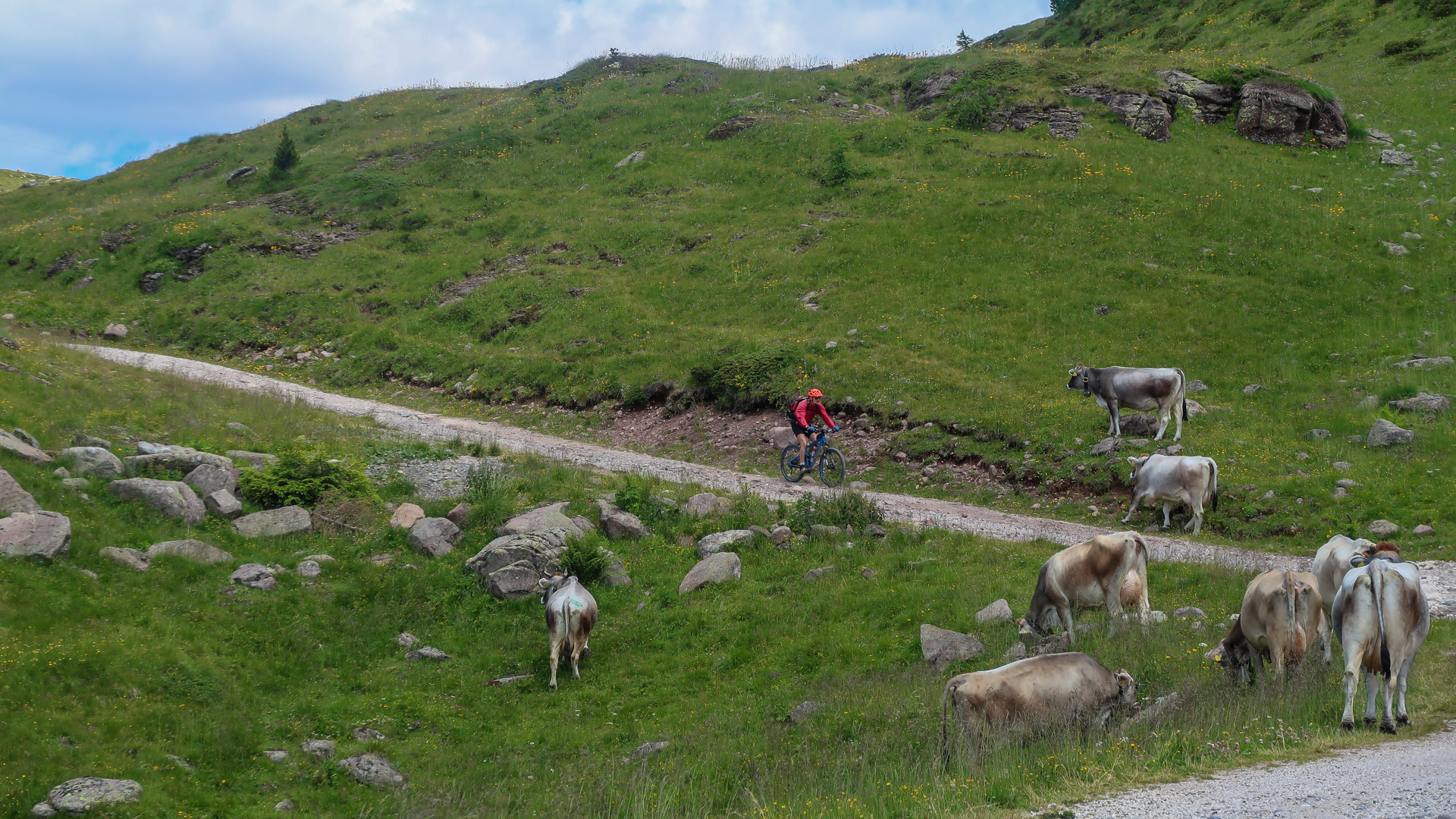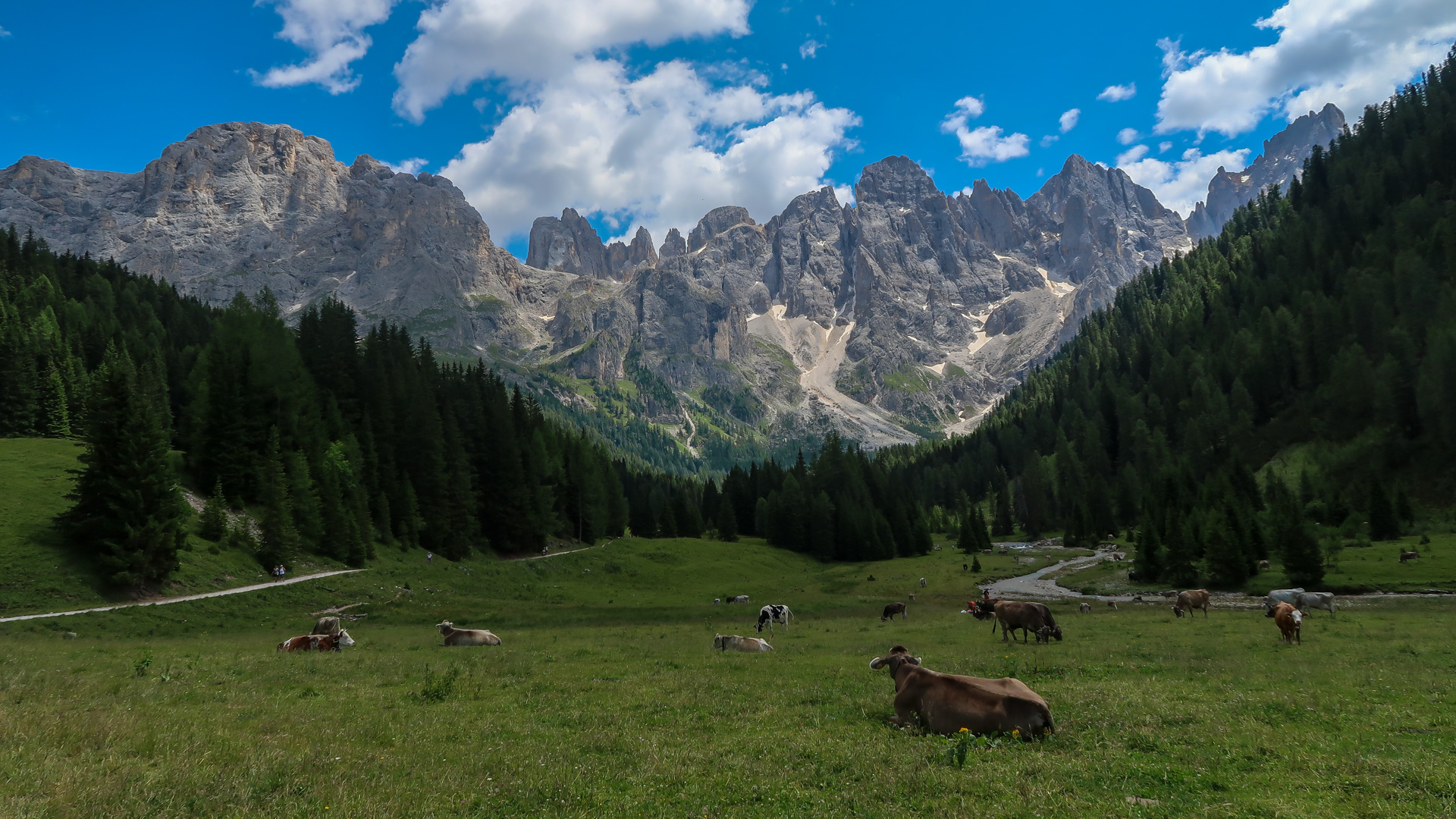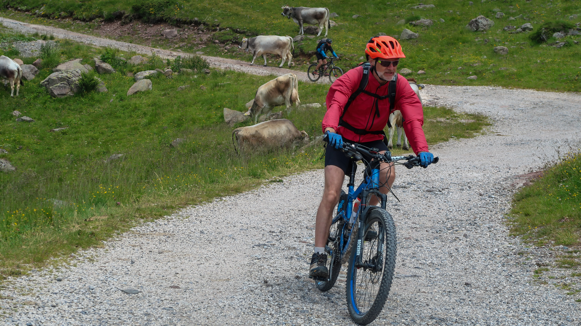 Teils auf der Skipiste hinunter, größtenteils Wanderwege entlang, immer im Flow und im Einklang mit dir selbst, so könnte man das beschreiben. Ab & zu versperren uns Kühe den Weg, dann rauschen wir weiter hinunter zum Vallespass. Ab hier geht der Tiefenrausch weitere 6 km auf Straße hinunter bis zum Eingang ins Val Venegia. Der eingeschlagene Weg steigt sanft mit 5% Steigung und es macht richtig Spaß der Sonne entgegen zu biken. Heute ist sehr viel los hier oben, die Italiener haben Urlaub und viele Wander & Ausflugsgruppen genießen dieses Tal.