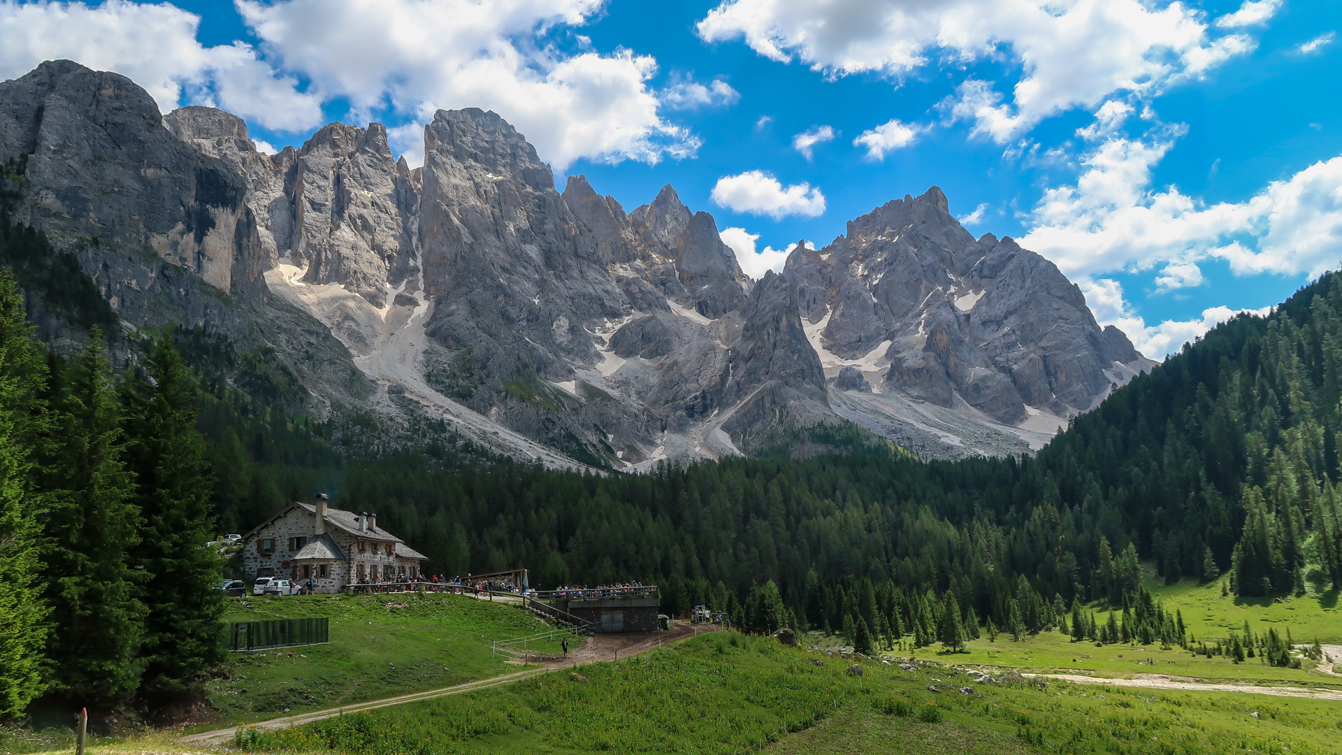 Uns verschlägt es fast den Atem vor Schönheit. Links die schroffen Felsspitzen der Palagruppe inmitten der Dolomiten, rechts saftige Wiesen mit einem kleinen Fluss und wir auf einem tollen Schotterweg, der mit weißen Steinen bestückt ist. Ein Meer von Felsbrocken in prachtvollem Weiß. Eine fast unwirklich wirkende Landschaft, die uns ins Staunen versetzt. Dazu noch der Sonnenschein und der strahlend blaue Himmel, so muss das Paradies aussehen! Thomas macht kurzer Hand einen „Schneeengel“ in den weißen Steinen, ein cooles Bild. Der Weg könnte so endlos weiter gehen, wir merken gar nicht, dass wir immer mehr an Höhe gewinnen. Er wird etwas steiler, aber nie unfahrbar, er schlängelt sich in Serpentinen immer höher hinauf, Meter um Meter empor, bis wir letztendlich die Hütte Baita Segantini auf 2.177 m erreichen.