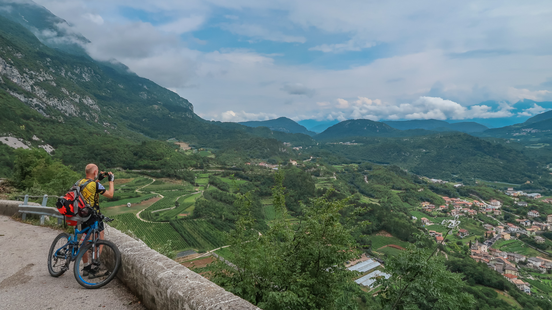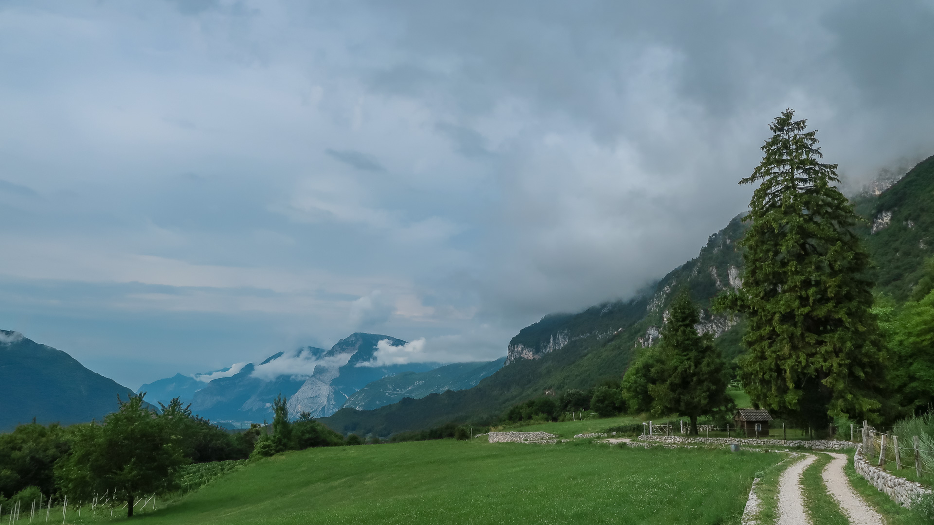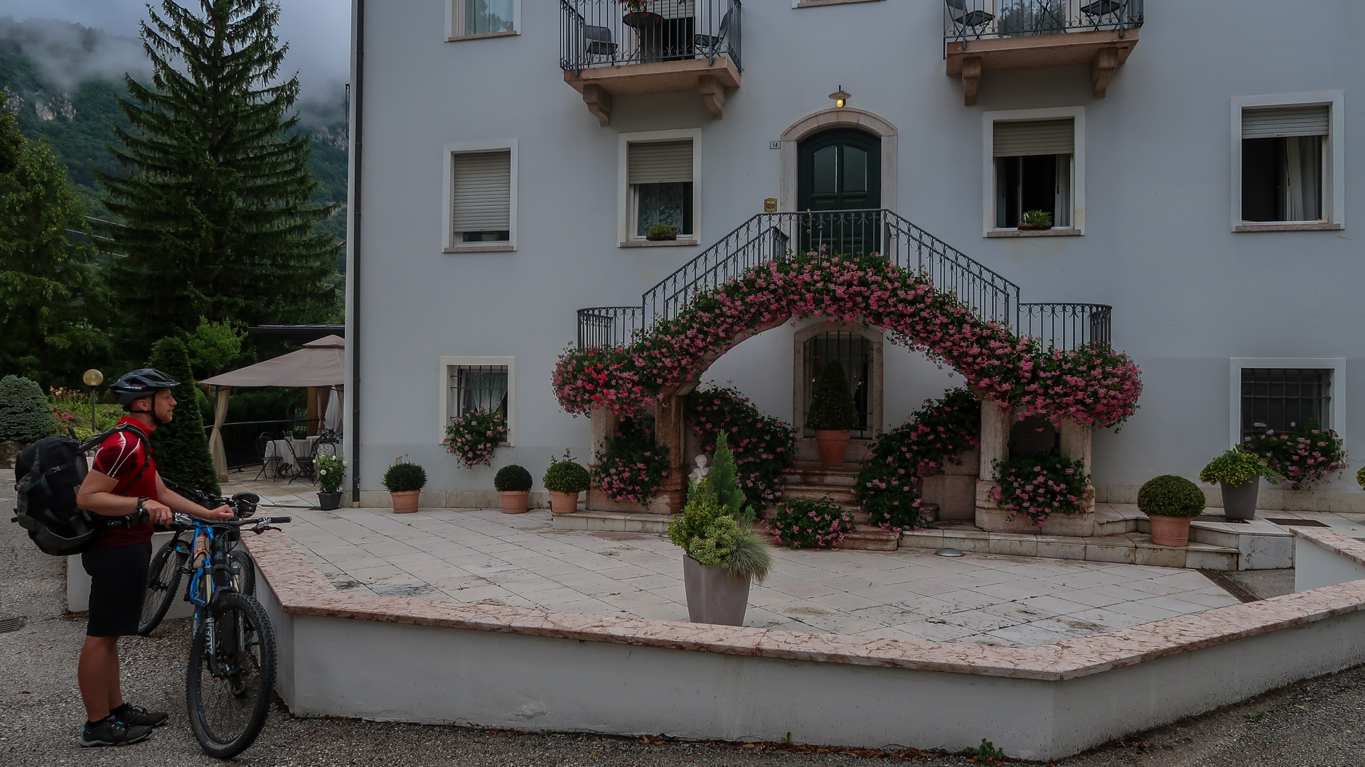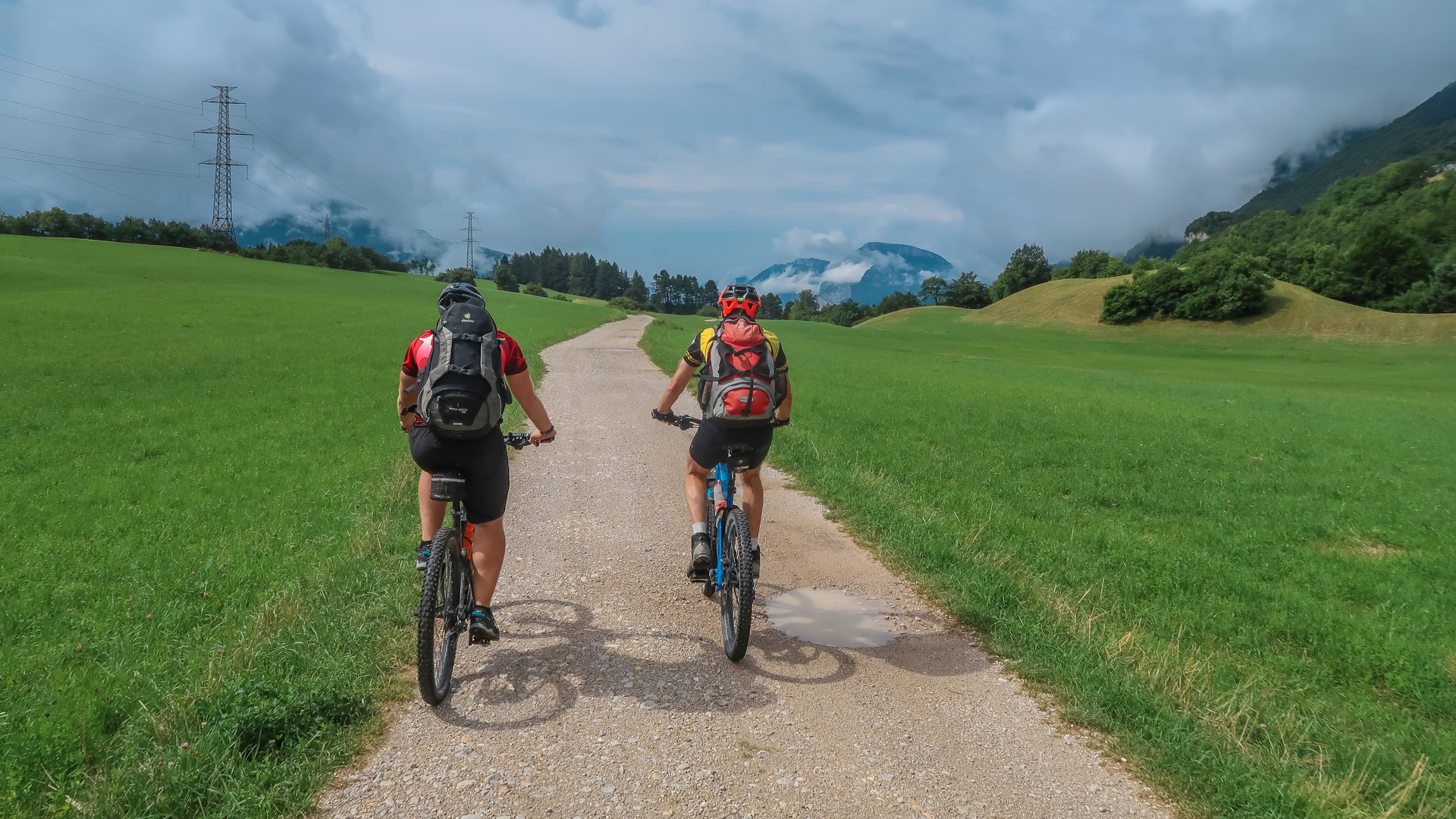 Oh weh – schon wieder der letze Tag des Alpencross. Es hat über Nacht ordentlich gewittert, die Berge sind aktuell noch unter einer dicken Wolkendecke versteckt. Jetzt geht es erst mal zum Frühstück. Lars hat durch die andauernde Belastung Probleme mit seiner Schulter – wir schätzen einfach eine Überanstrengung durch Rucksack und das durchschüttel der ruppigen Trails. Die OP ist ja gerade mal 10 Wochen her. Wir raten ihm, die letze Etappe auf dem Radweg nach Riva zu fahren und nichts zu riskieren, das sind grade mal 30 km. Er ist vernünftig genug und befolgt unserem Rat.