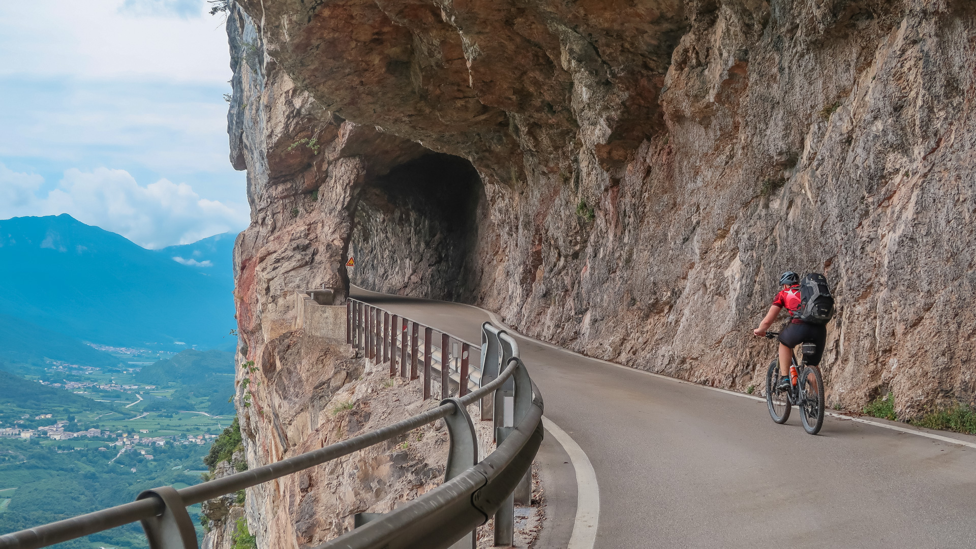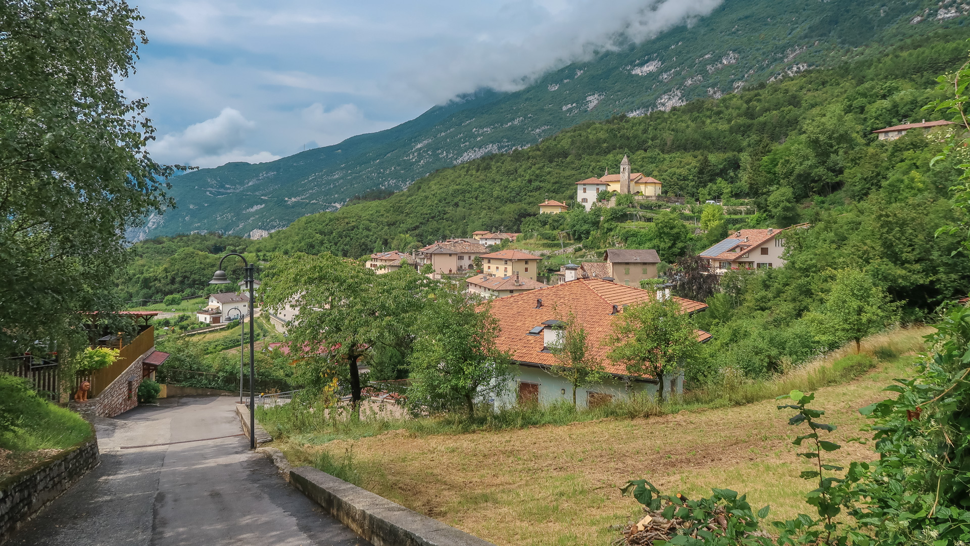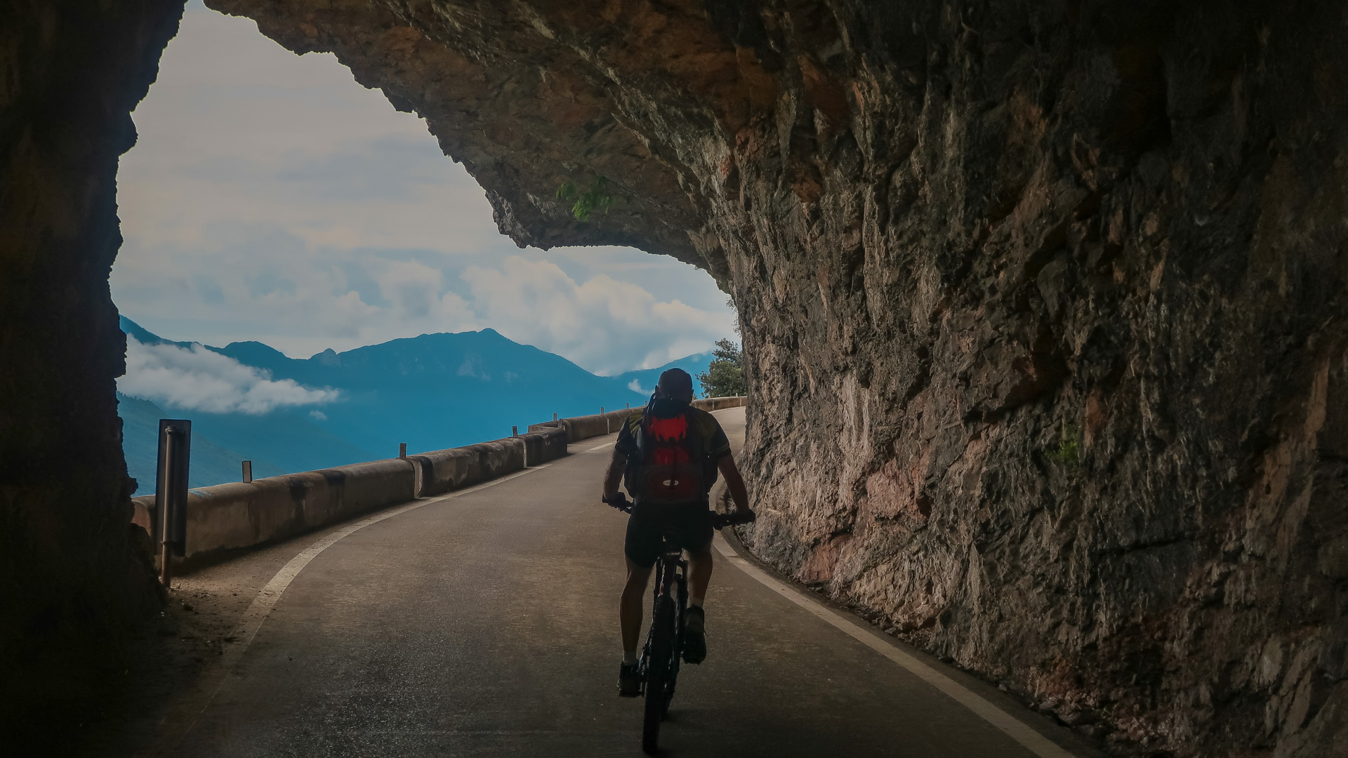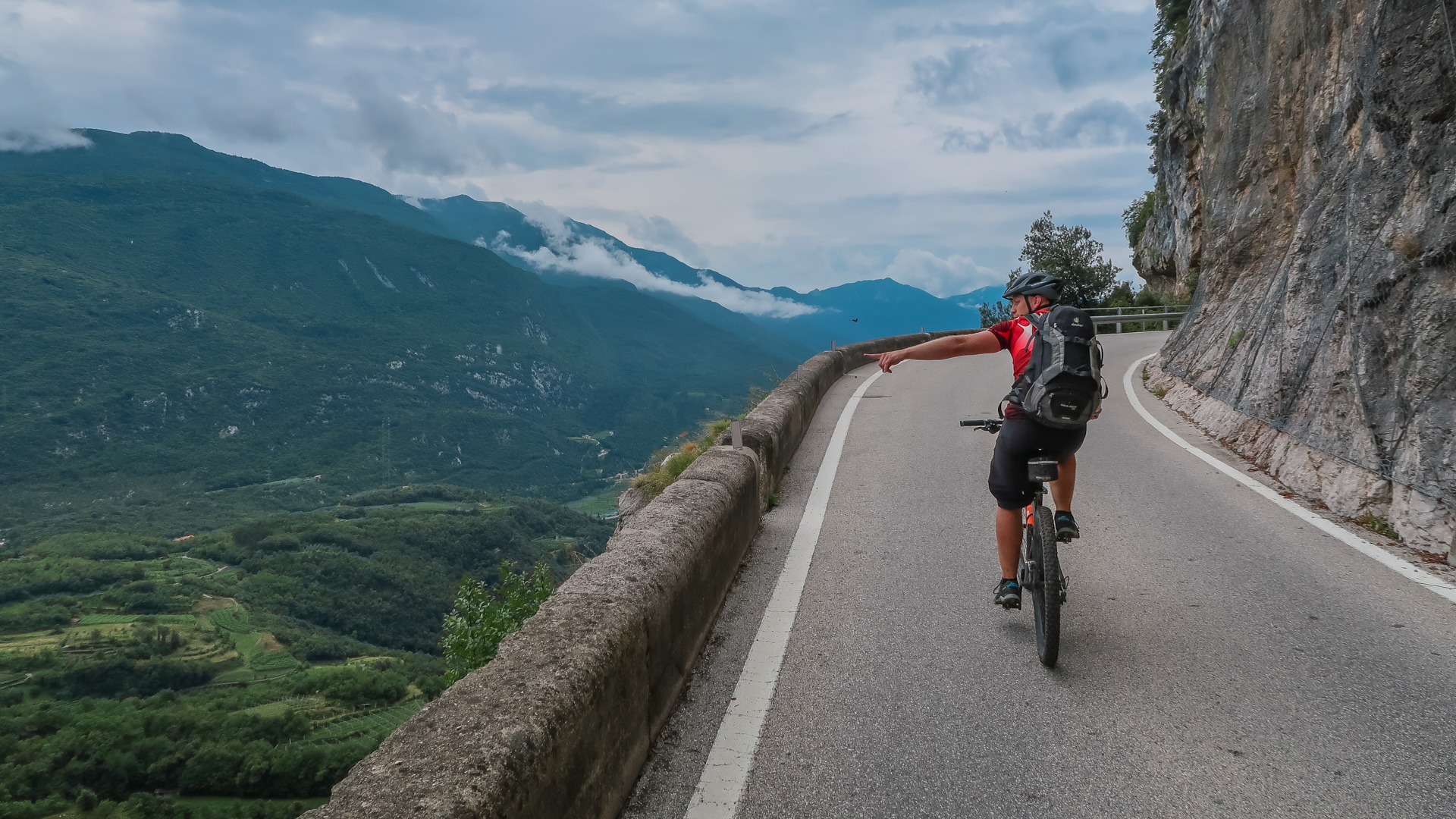 Wir drei machen uns auf zur letzten Etappe. Es geht erst mal bergauf – auf einer einsamen Straße und anschießendem Schotterweg 200 hm hinauf zum Lago di Lamar. Es folgen ein paar herrliche, aber durch den Regen sehr rutschige Trails. Wir müssen höllisch aufpassen, aber Spaß macht es irgendwie dennoch. Still und einsam ruht der See an einer Waldlichtung. Ein sehr idyllisches Plätzchen. Im ständigen rauf und runter, mit vielen kleinen Trails am Waldrand schlängelt sich der Weg von Covelon nach Lon. Es macht pure Freude, wäre es etwas trockener wäre es ja gar nicht auszuhalten. Sanft fällt der Weg hinab, bis wir am Fuße zu einer spektakulären Straße nah Ranzo gelangen. In Fels gesprengt, schlängelt sich der Straße 180 hm hinauf. Sie lässt sich leicht fahren, kaum Autos und mit dem ersten Blick auf dem Gardasee.