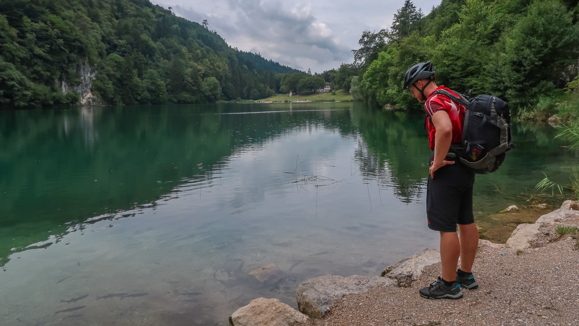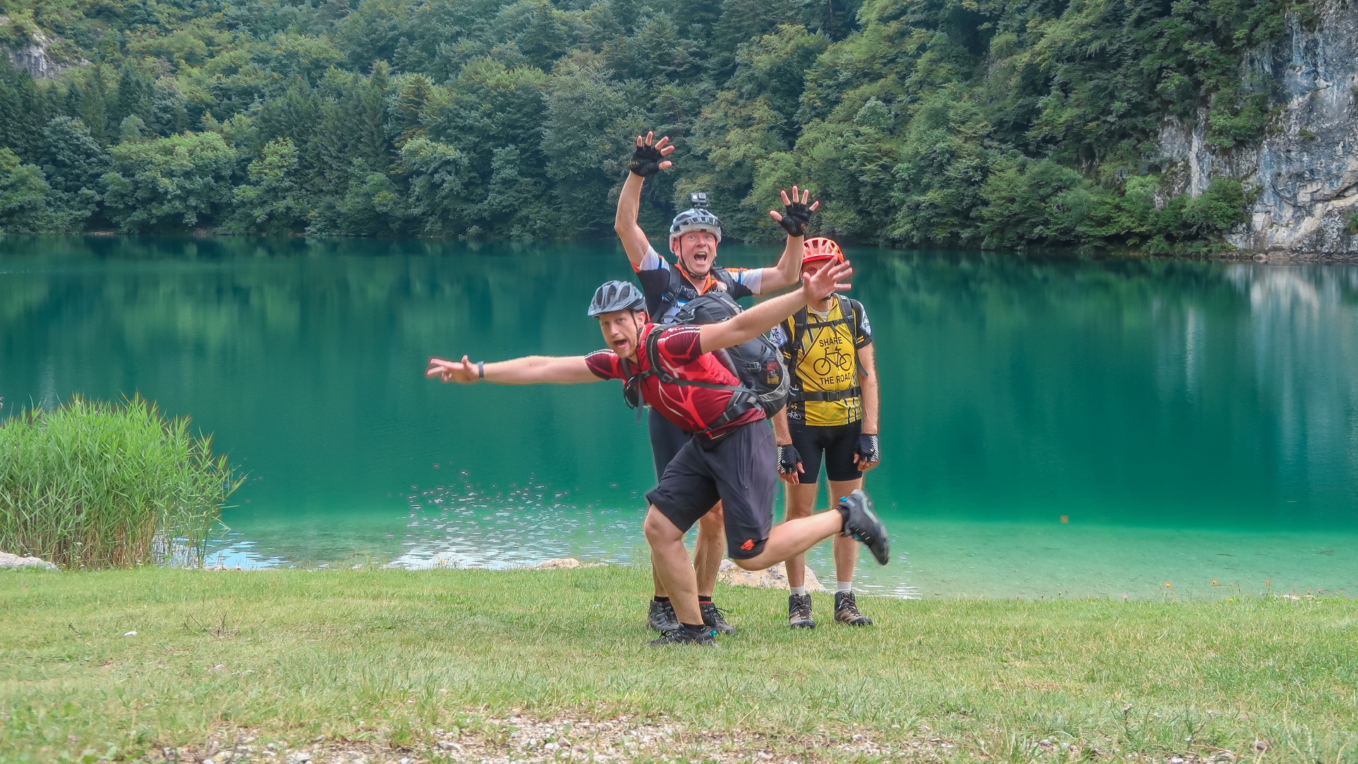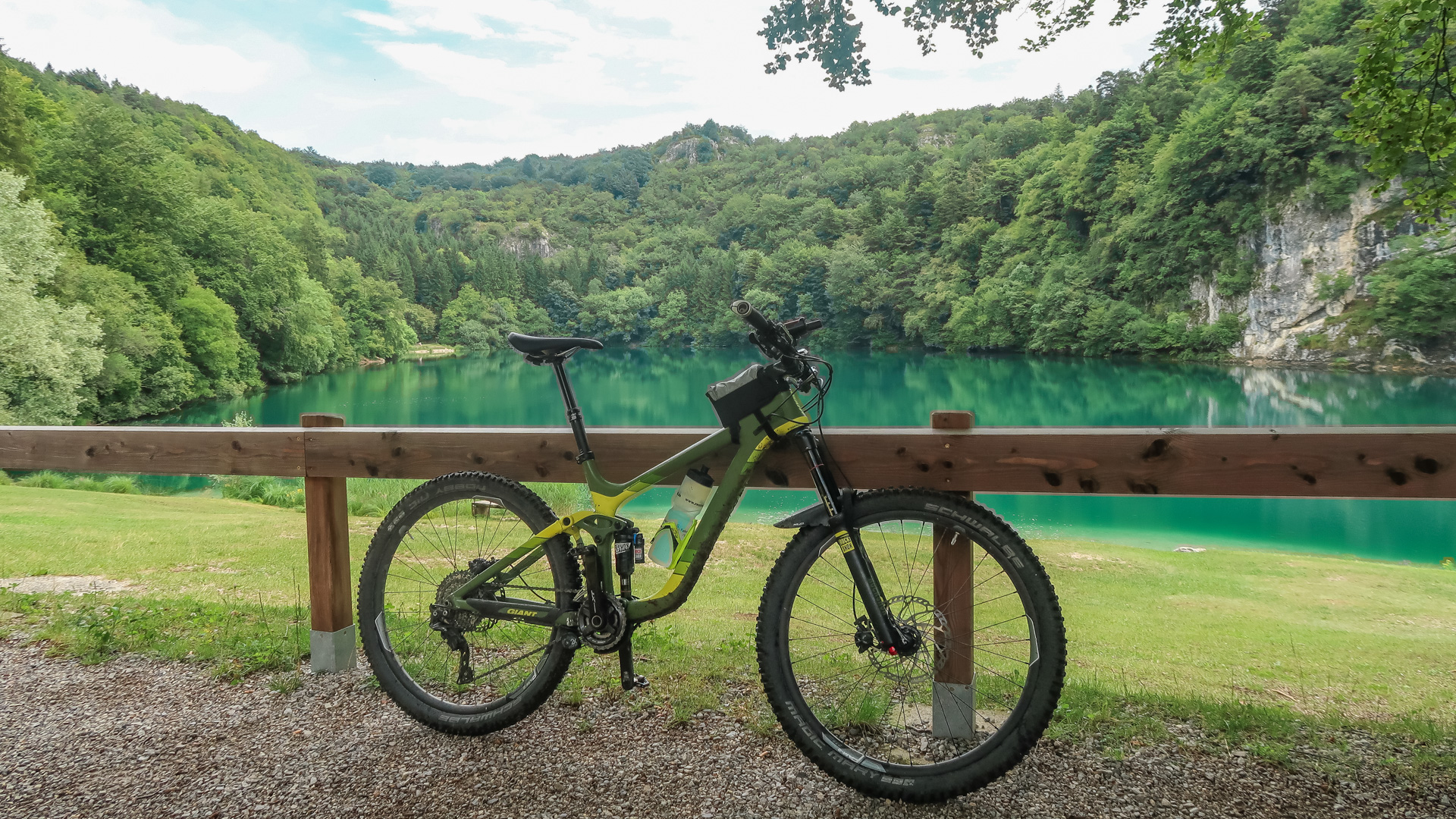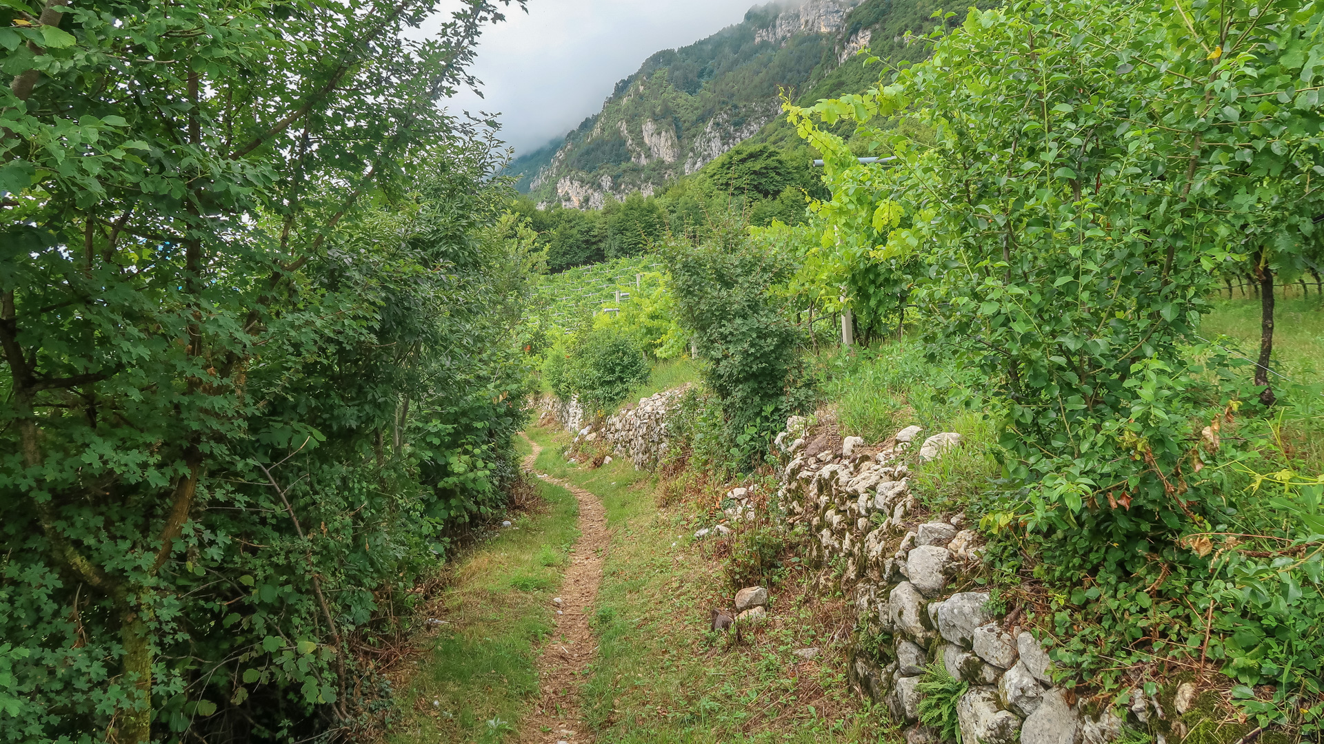 Wir drei machen uns auf zur letzten Etappe. Es geht erst mal bergauf – auf einer einsamen Straße und anschießendem Schotterweg 200 hm hinauf zum Lago di Lamar. Es folgen ein paar herrliche, aber durch den Regen sehr rutschige Trails. Wir müssen höllisch aufpassen, aber Spaß macht es irgendwie dennoch. Still und einsam ruht der See an einer Waldlichtung. Ein sehr idyllisches Plätzchen. Im ständigen rauf und runter, mit vielen kleinen Trails am Waldrand schlängelt sich der Weg von Covelon nach Lon. Es macht pure Freude, wäre es etwas trockener wäre es ja gar nicht auszuhalten. Sanft fällt der Weg hinab, bis wir am Fuße zu einer spektakulären Straße nah Ranzo gelangen. In Fels gesprengt, schlängelt sich der Straße 180 hm hinauf. Sie lässt sich leicht fahren, kaum Autos und mit dem ersten Blick auf dem Gardasee.