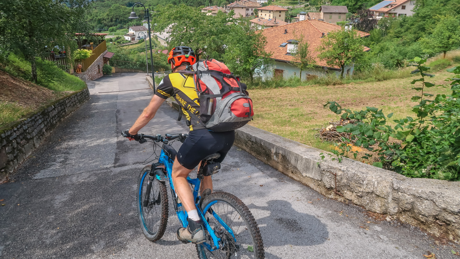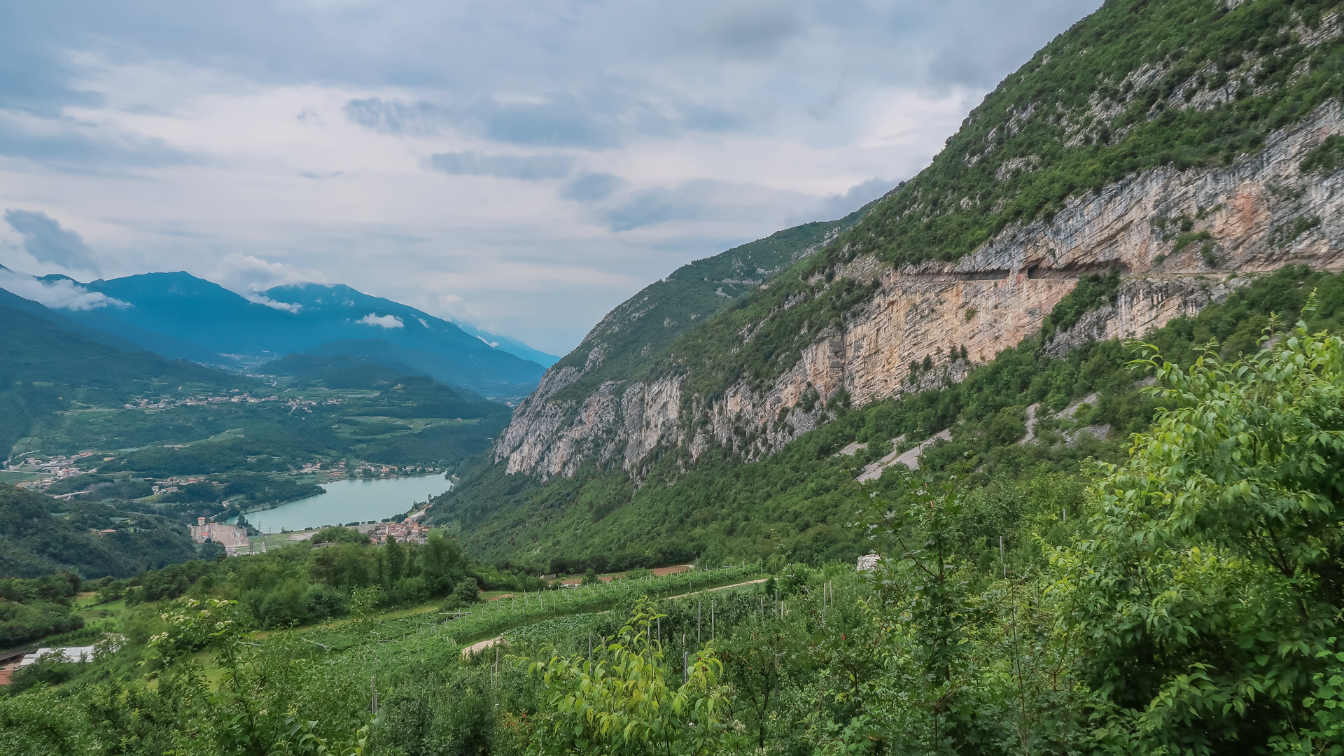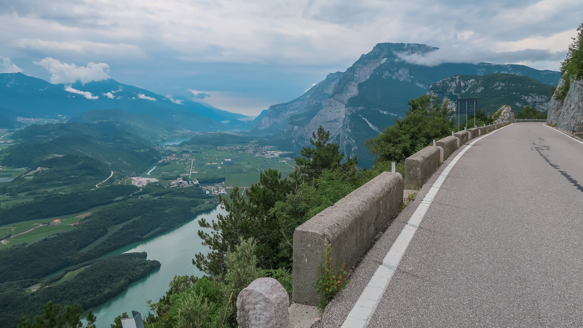 Den Weg von Ranzo hinunter zum Lago di Toblino kennen wir schon vom Alpencross aus 2016. Ab hier geht es weiter, diesmal steil bergab. Wirklich steil, denn auf 3 km verlieren wir über 400 Höhenmeter, bedeutet im Schnitt mehr als 13 %! Das ganze schön im Schatten der Bäume, sehr enge Wege, es macht einfach tierisch viel Spaß. Die Abfahrt spuckt uns an einer Allee am Lago die Toblino wieder raus und stoppt unseren Geschwindigkeitsrausch.