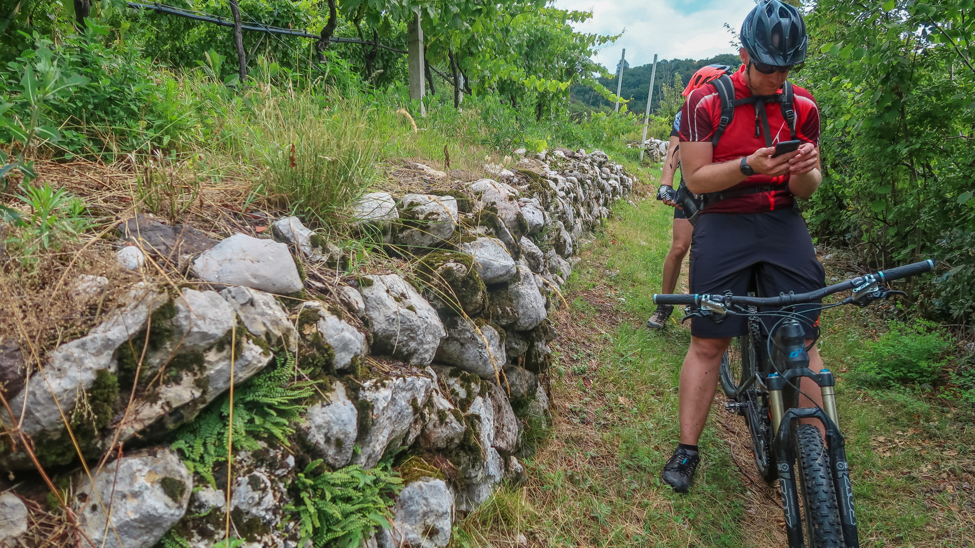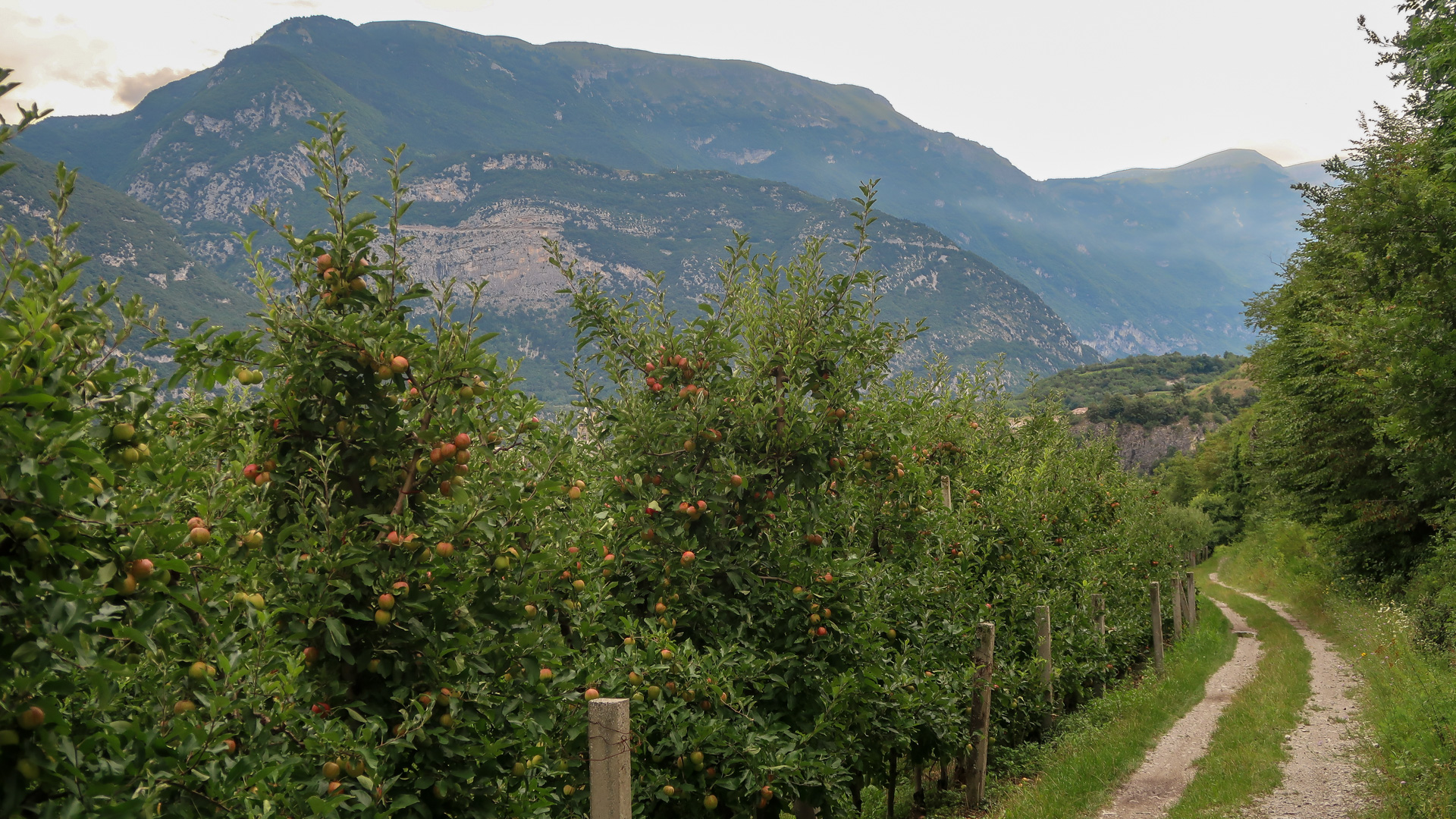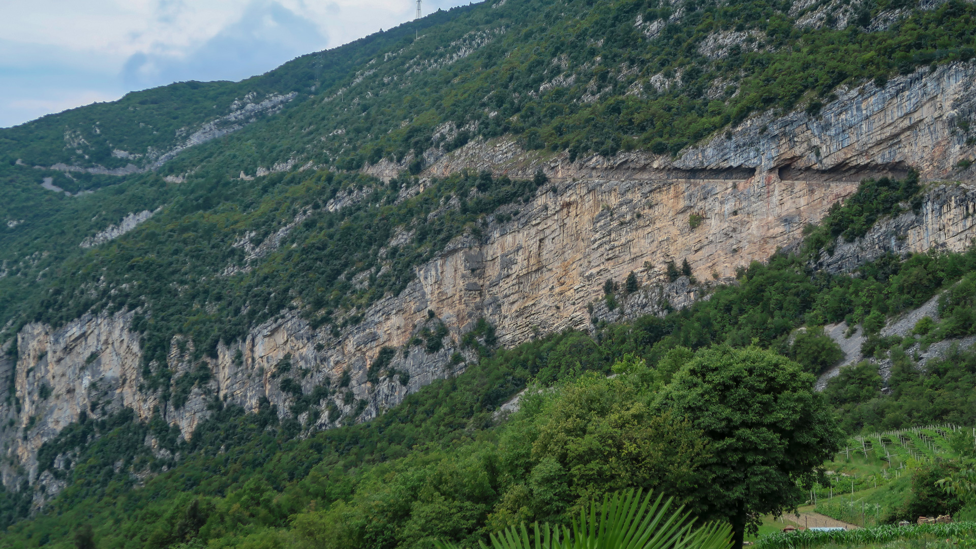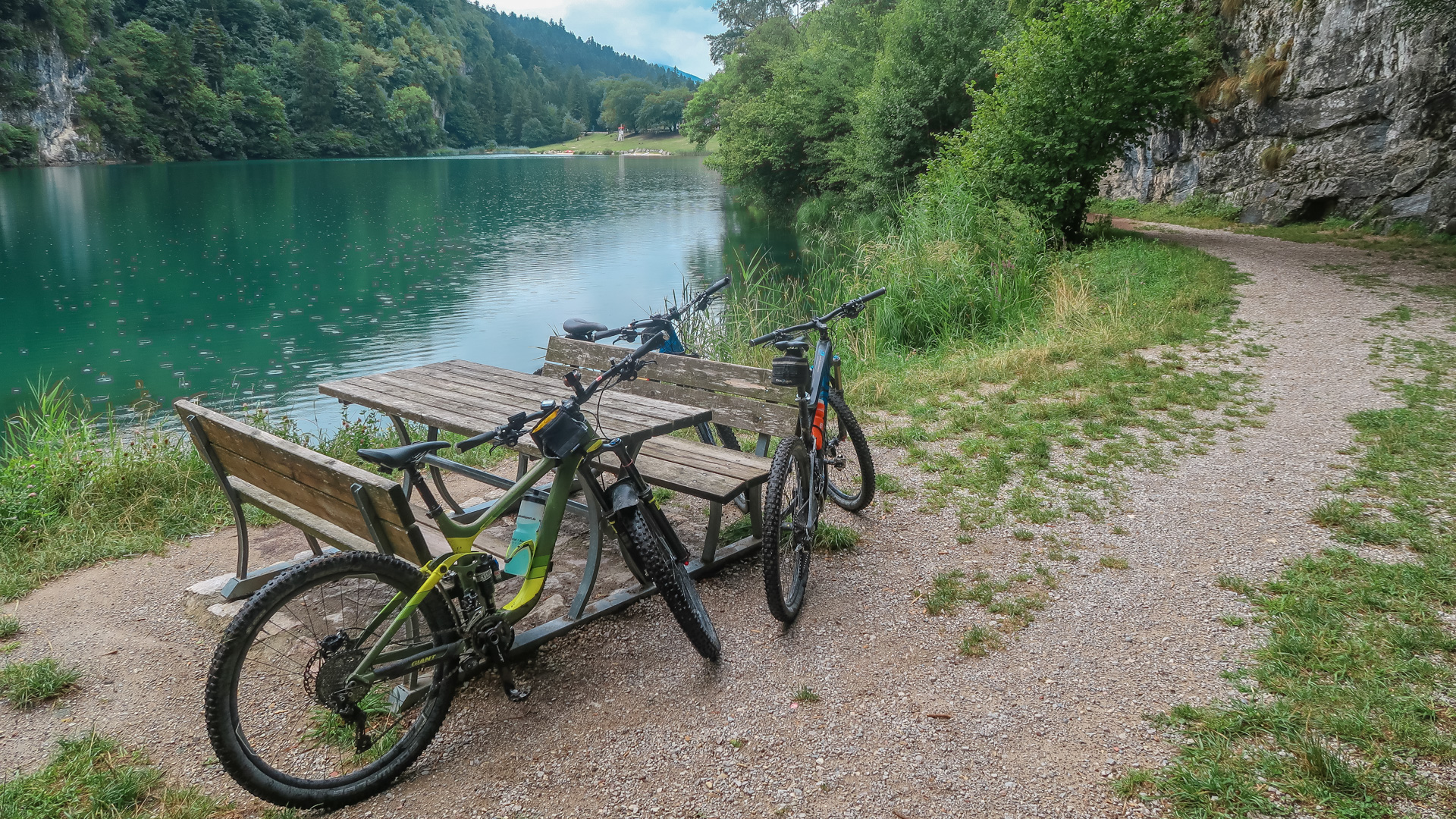 Den Weg von Ranzo hinunter zum Lago di Toblino kennen wir schon vom Alpencross aus 2016. Ab hier geht es weiter, diesmal steil bergab. Wirklich steil, denn auf 3 km verlieren wir über 400 Höhenmeter, bedeutet im Schnitt mehr als 13 %! Das ganze schön im Schatten der Bäume, sehr enge Wege, es macht einfach tierisch viel Spaß. Die Abfahrt spuckt uns an einer Allee am Lago die Toblino wieder raus und stoppt unseren Geschwindigkeitsrausch.