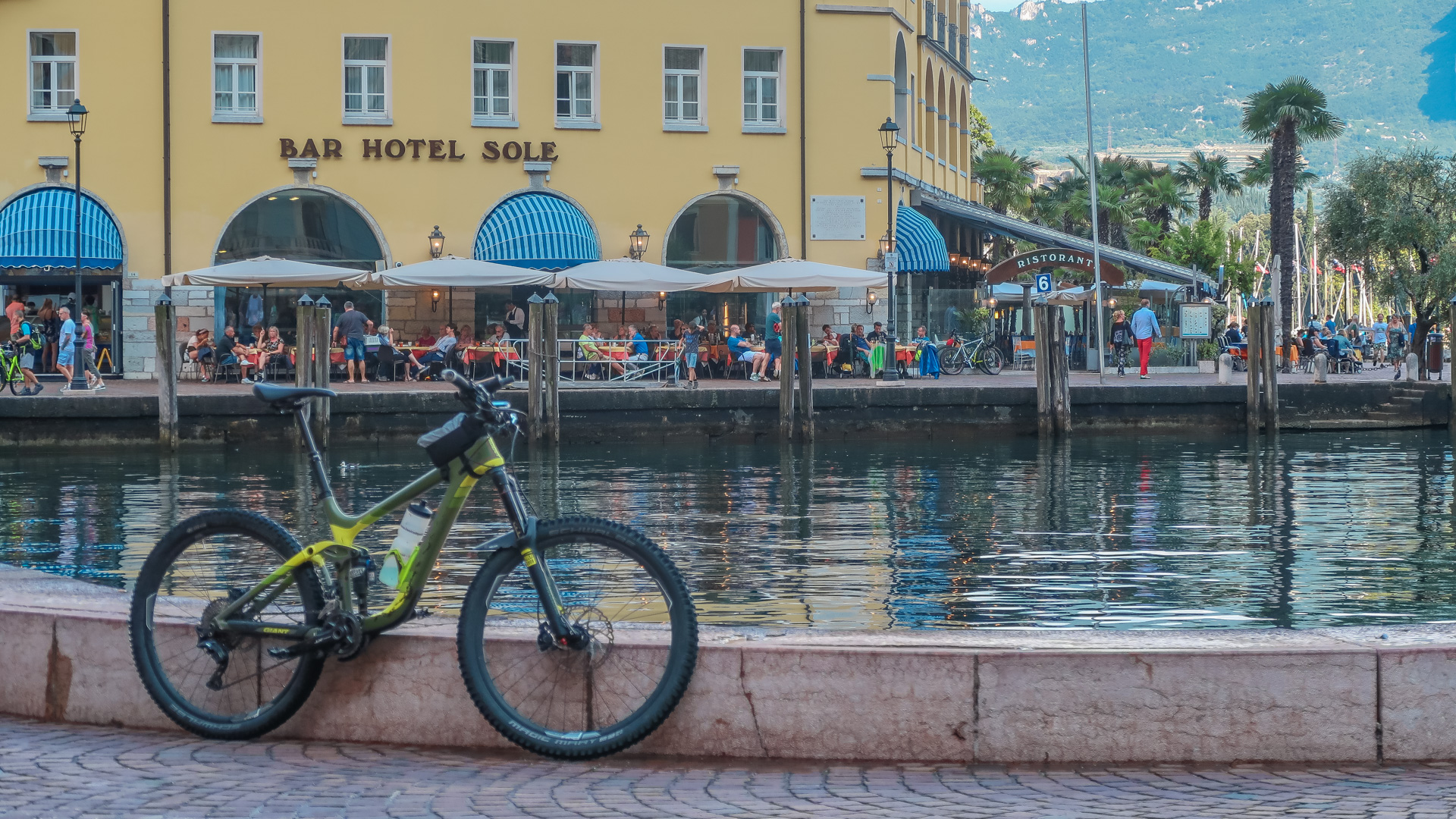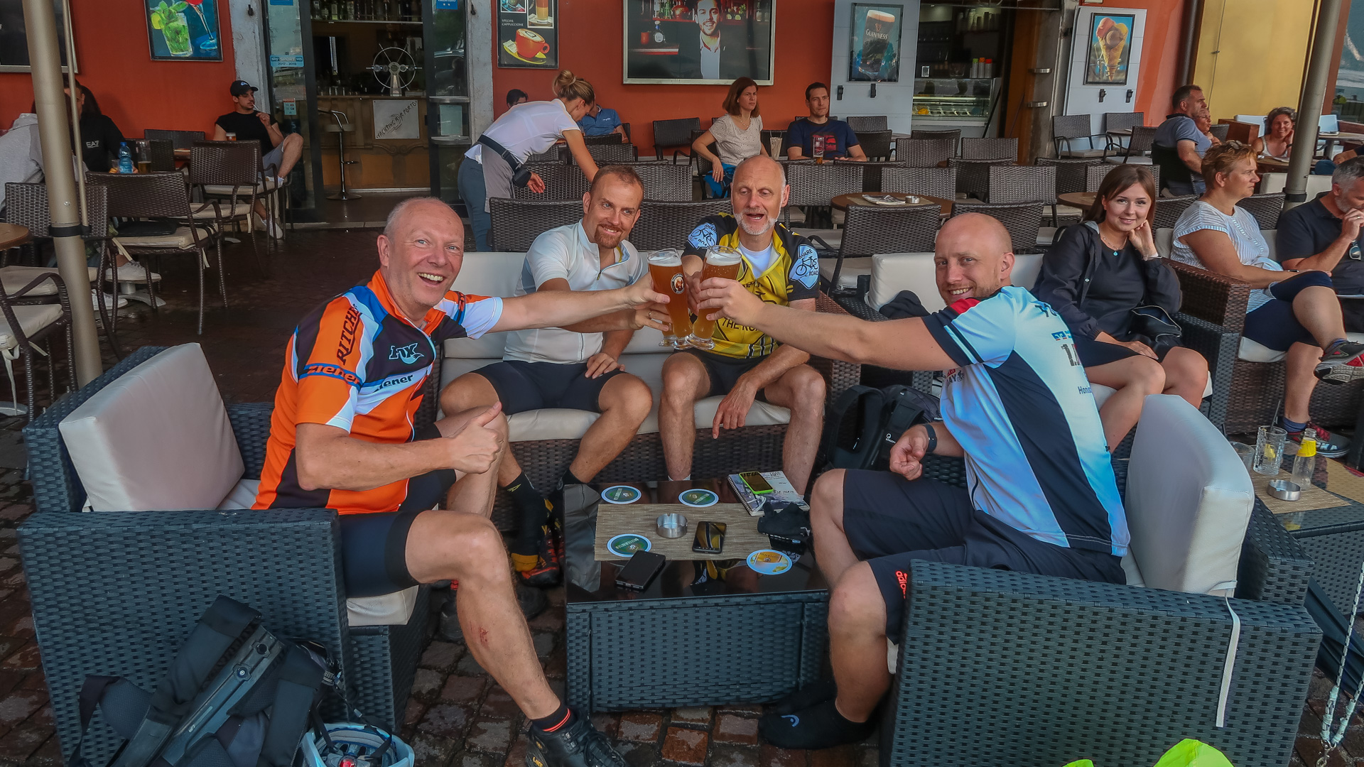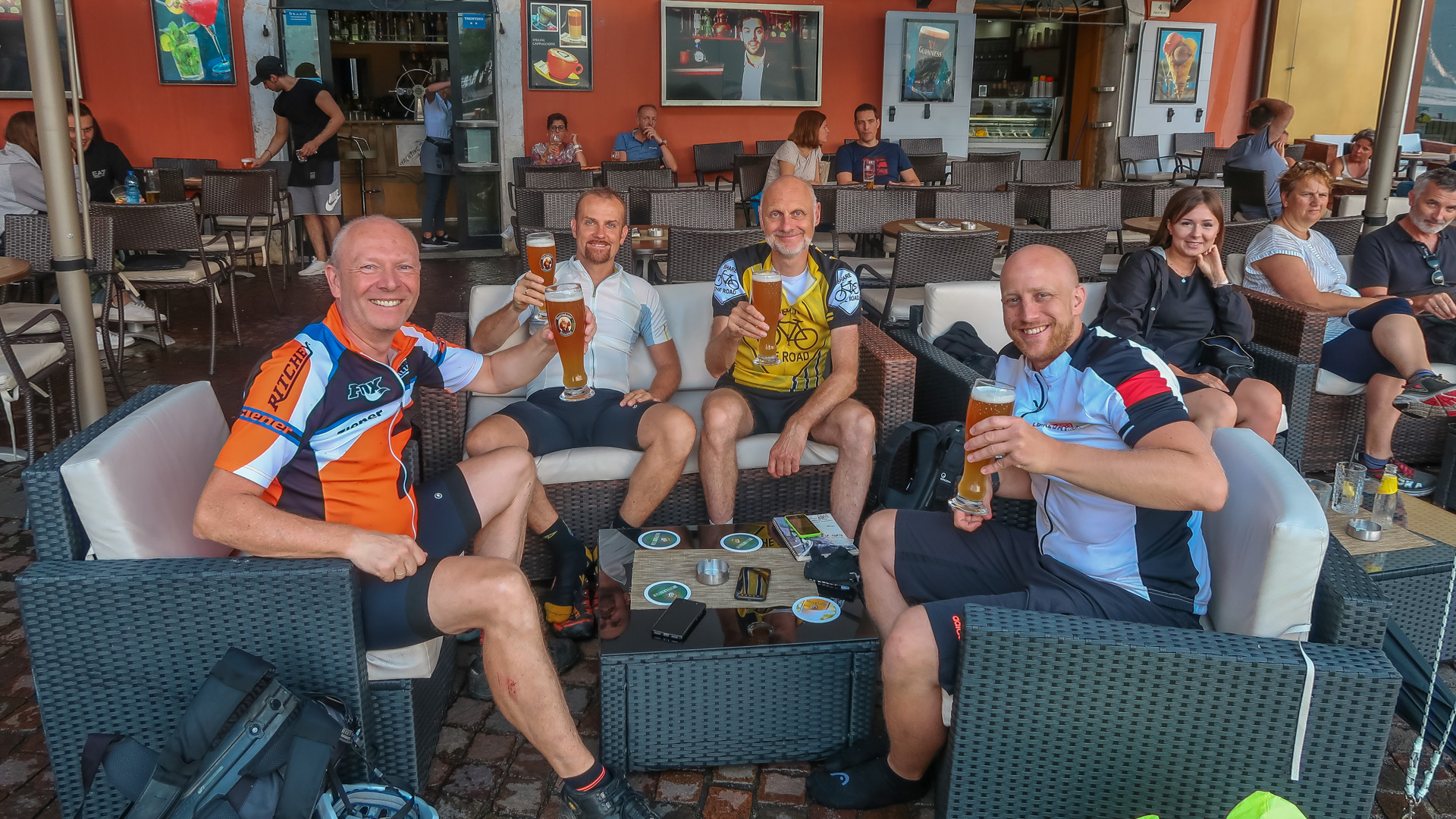 Kurz hinterm See halten wir an einer kleinen Kneipe und gönnen uns ein Kaltgetränk und einen Espresso. Lars schreibt uns, dass er in Dro beim Eis Maui auf uns wartet, aber es regnet dort bereits. Kaum haben wir seine Nachricht gelesen, fängt es auch bei uns an zu regnen. Ein zweiter Espresso, es wird nicht besser. Ich habe mir eigentlich eine neue Route ausgedacht, denn wir wollten am Lago di Cavédine über Trails durch das Naturschutzgebiet mit Dino-Spuren durchfahren. Regenklamotten an und ab gehts. Es ist schwül heiß, der Regen ist warm aber heftig, der Donner aber auch. Die tollen Trials können wir gar nicht genießen, biegen auf den dortigen Radweg ab und fahren auf direktem Wege nach Dro zu unserer Lieblingseisdiele. Dort treffen wir auf Lars, und welch eine Überraschung, auf Jürgen mit seiner Frau die eine Woche Urlaub am Gardasee geplant hatten. Freudige Umarmung, lecker Eis, und abwarten bis es aufhört zu regnen. Tut es aber nicht. Also die letzen Kilometer schaffen wir auch noch, schwingen und aus die Räder und ab geht nach Riva del Garda. Da sich unsere Apartment auf dem Weg dorthin befindet, checken wir erst mal ein, ziehen die nassen Regenkalotten aus und fahren gleich weiter nach Riva.