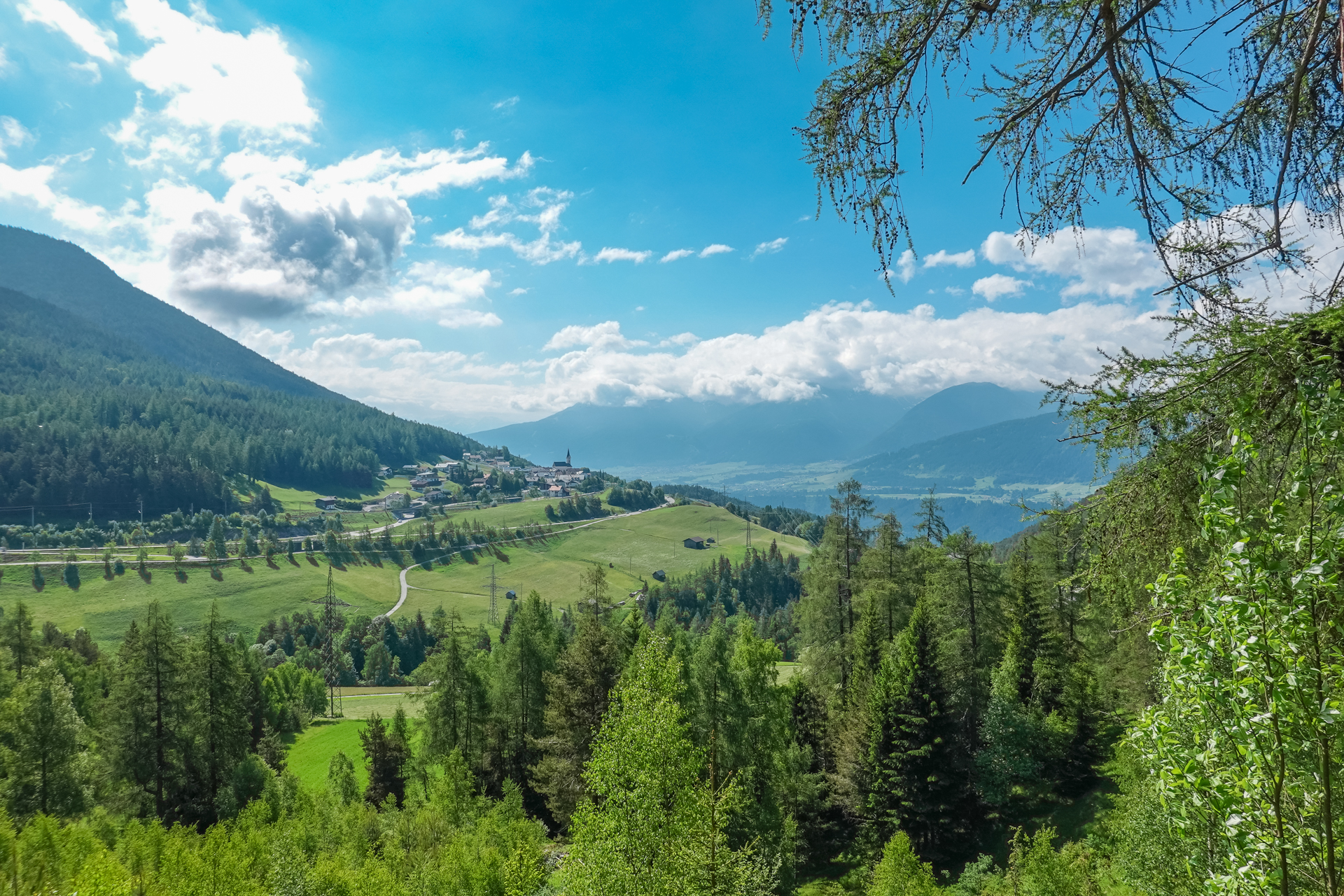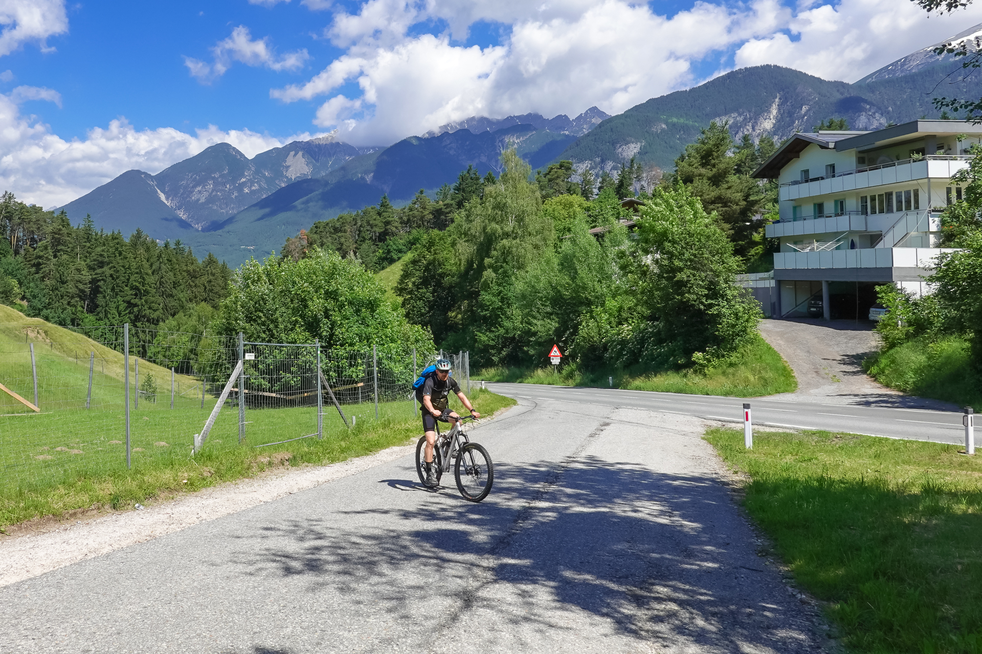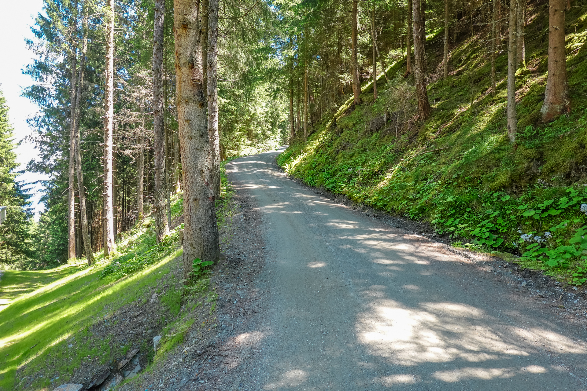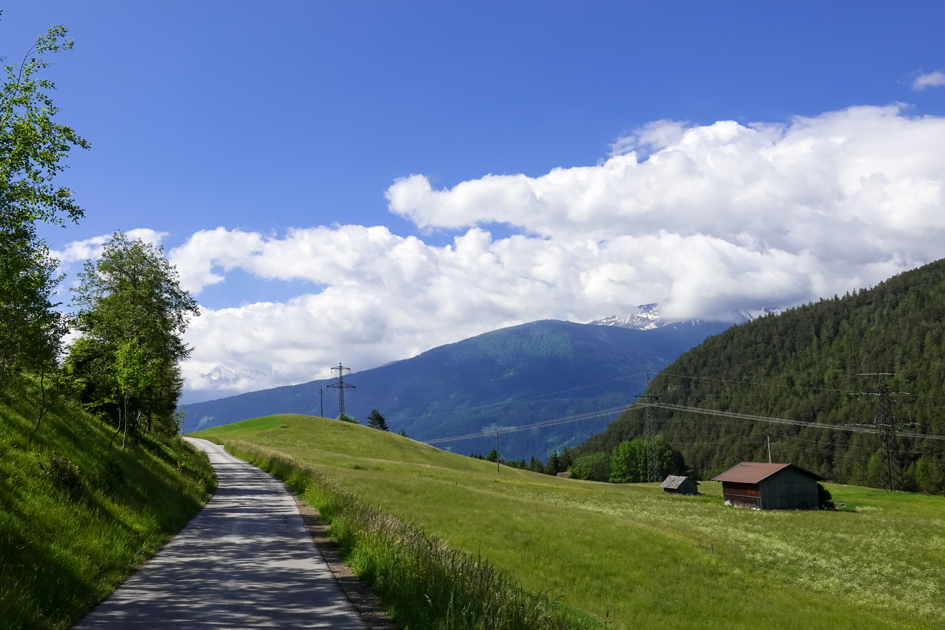Ab dem nächsten Dorf „Götzens“ ist Schluss mit Lustig – ein Rodel Weg führt uns hinauf zur Götzner Alm (1542 m), danach weiter zur Mutterer Alm auf 1.608 m. Das sind insgesamt ca. 6 km und mühsame 700 hm am Stück. Teilweise zu steil zum Fahren, aber Laufen ist auch keine Schande. Ab und zu erhaschen wir einen Blick hinunter nach Innsbruck, Gott sei dank verläuft fast die komplette Strecke schattig im Wald.
