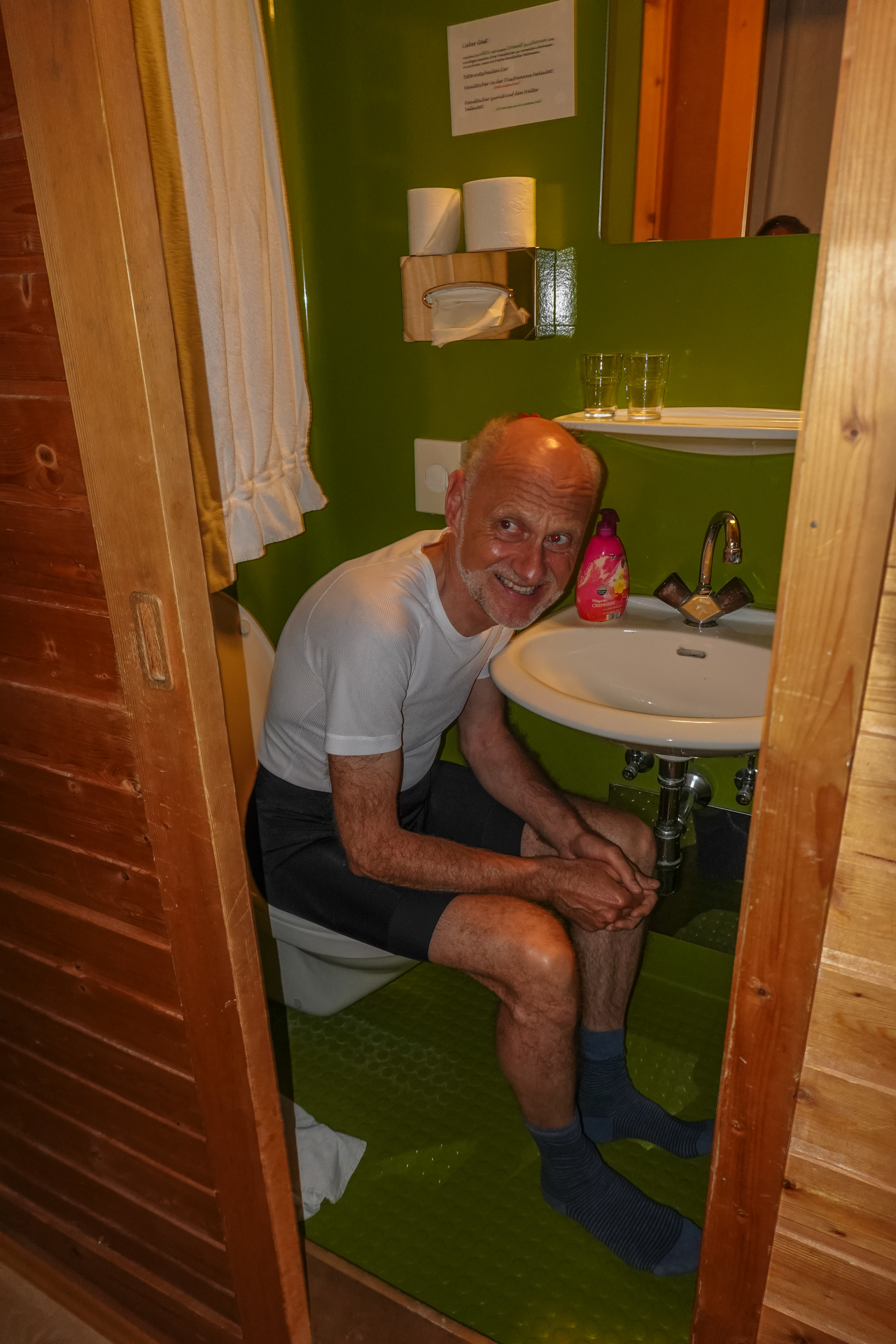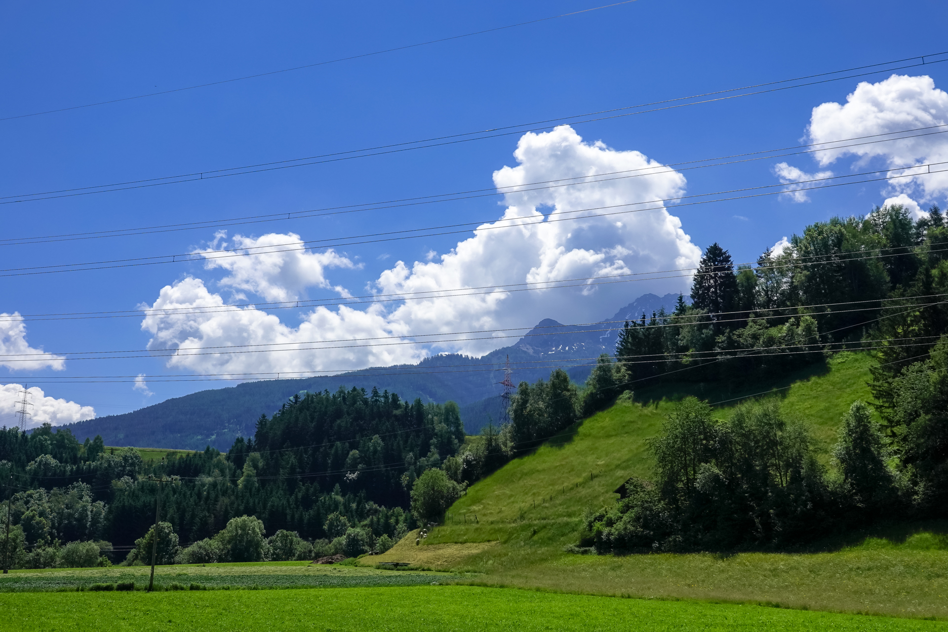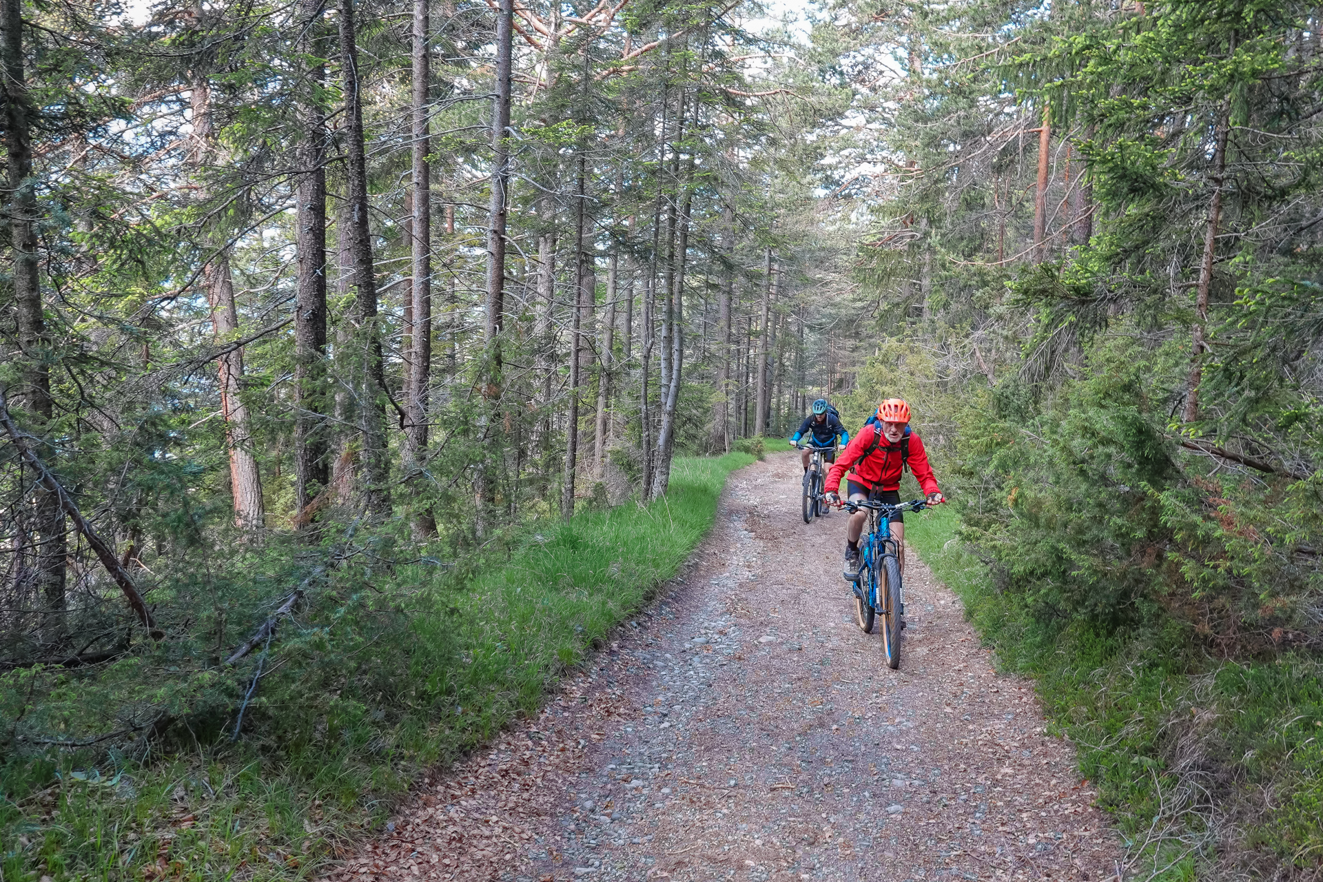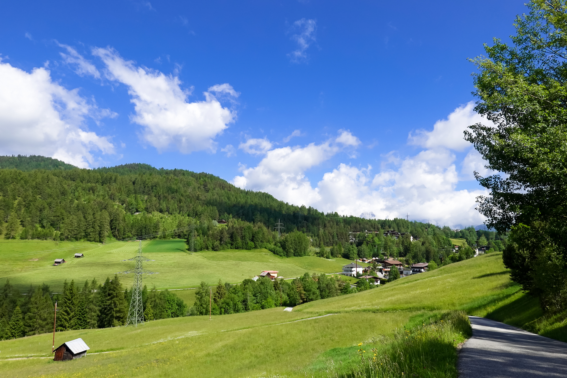 Ab dem nächsten Dorf „Götzens“ ist Schluss mit Lustig – ein Rodel Weg führt uns hinauf zur Götzner Alm (1542 m), danach weiter zur Mutterer Alm auf 1.608 m. Das sind insgesamt ca. 6 km und mühsame 700 hm am Stück. Teilweise zu steil zum Fahren, aber Laufen ist auch keine Schande. Ab und zu erhaschen wir einen Blick hinunter nach Innsbruck, Gott sei dank verläuft fast die komplette Strecke schattig im Wald.