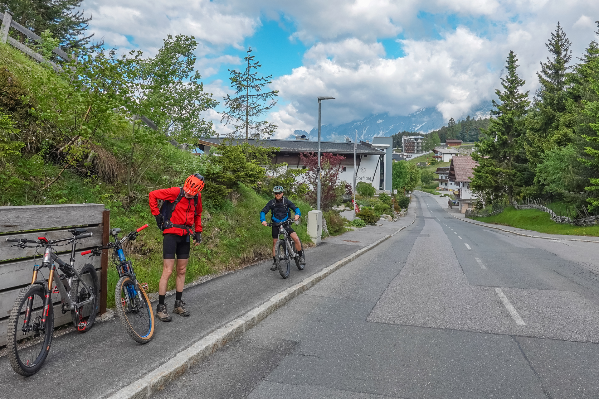 „Morgenstunde hat Gold im Munde“ – das Frühstück war lecker und ergiebig. Das Wetter – Wolken und Sonne wechseln sich ab – kein Regen. So darf der Tag um 7:30 Uhr beginnen. Ich hatte 2010 einen AX in Mittenwald gestartet, von dort ging es einem Wanderweg folgend per Singletrail runter nach Zirl. Genau diesen Weg hatte ich auch für dieses Jahr eingeplant – und es hat sich wieder gelohnt.
