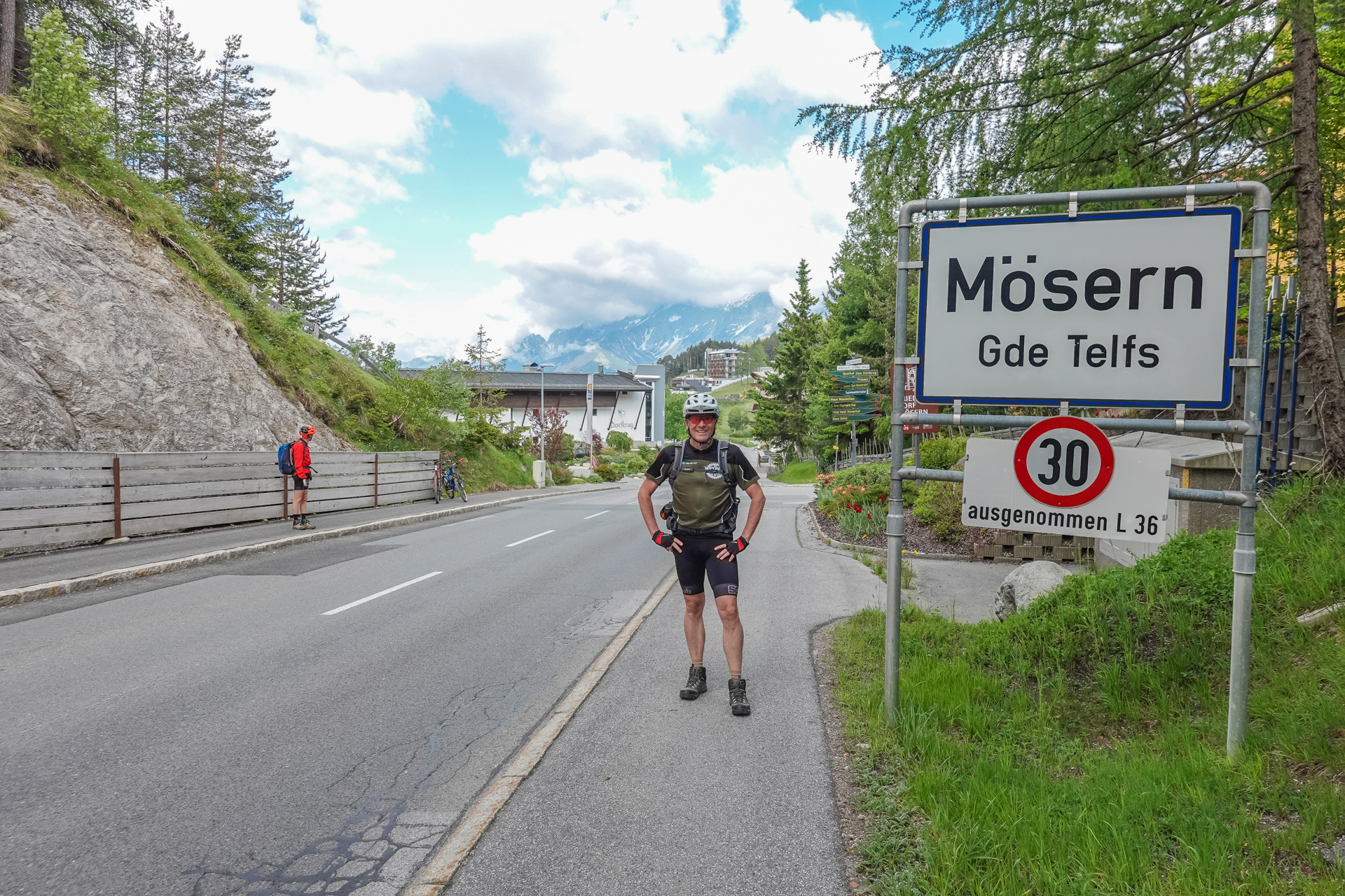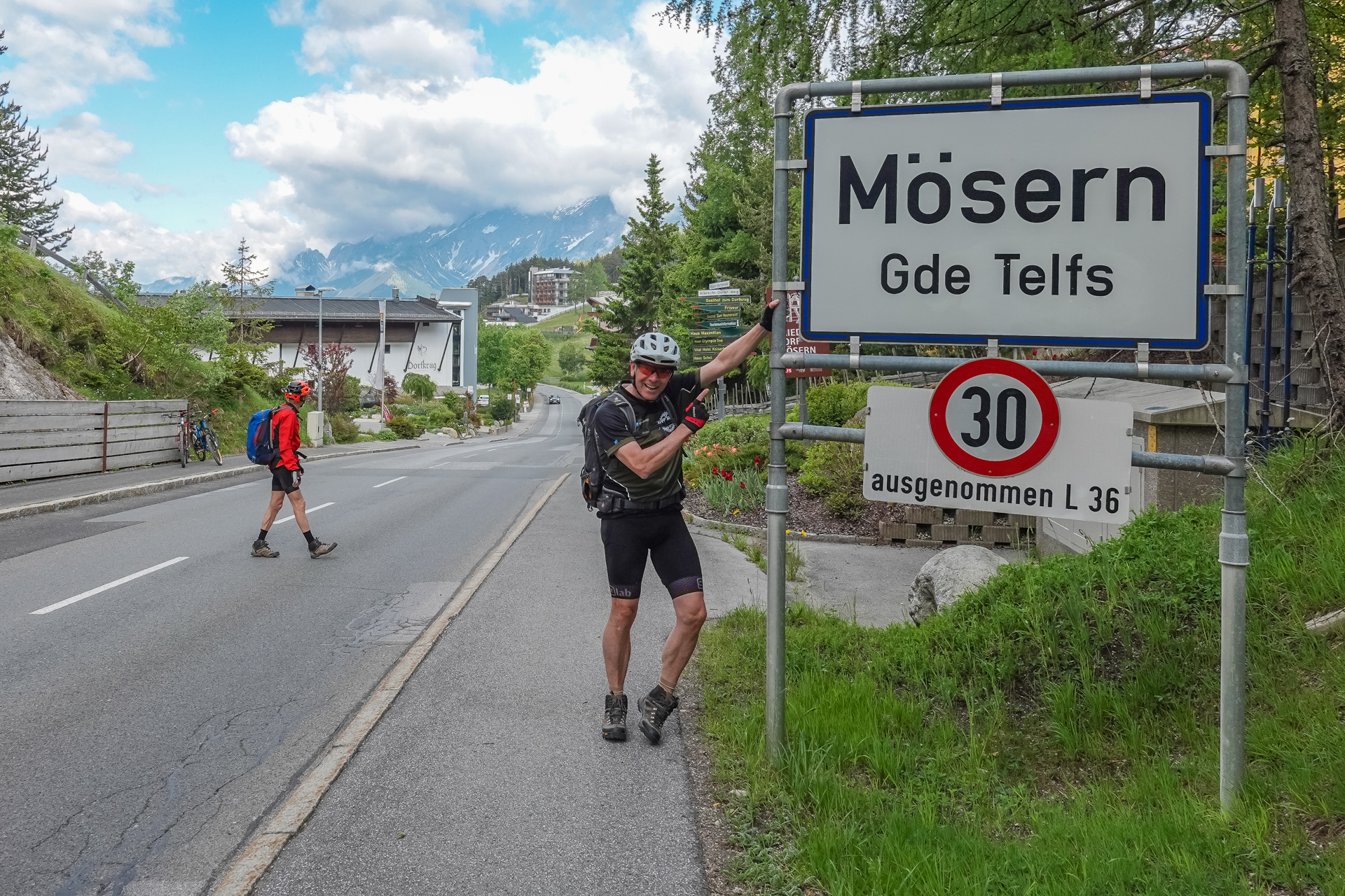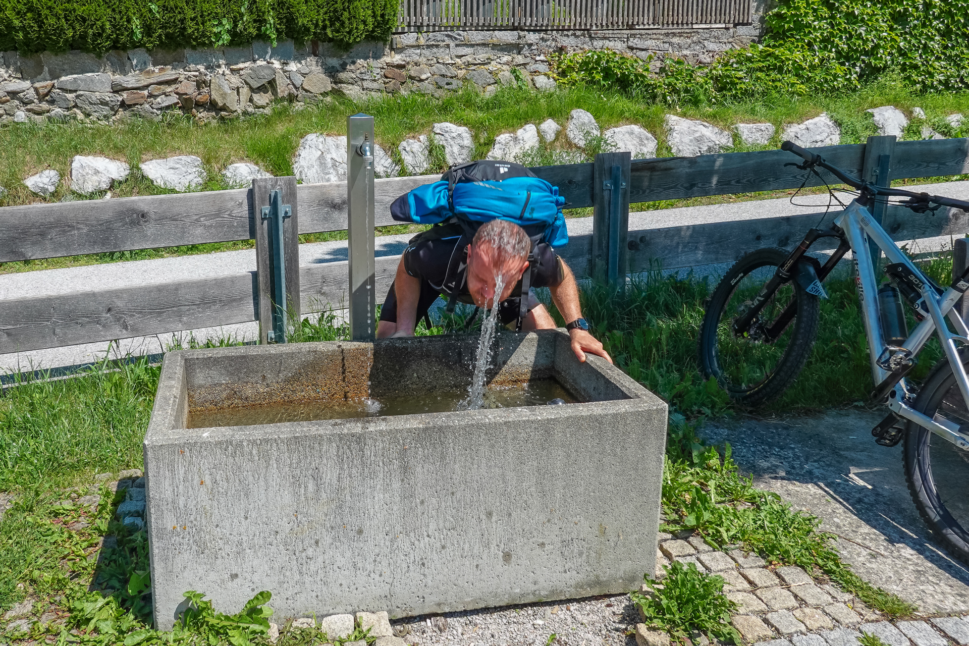 In Zirl füllen wir am Dorfbrunnen unsere Wasserflaschen, überqueren dann die neu gebaute Rad & Fußgängerbrücke über den Inn und weiter geht es auf Straße nach Kematen. Es ist schon sehr warm, 26 Grad zeigt das Thermometer an. Die nächsten 130 hm folgen wir eine kleinen Straße den Berg hinauf. Ein kleiner Brunnen lädt uns ein, den Kopf unter Wasser zu halten und abzukühlen. Jetzt gehts weiter hinauf nach Birgiz. Kleiner dialektischer Scherz am Rande: „Birgiz is da, wo´s Bier git“