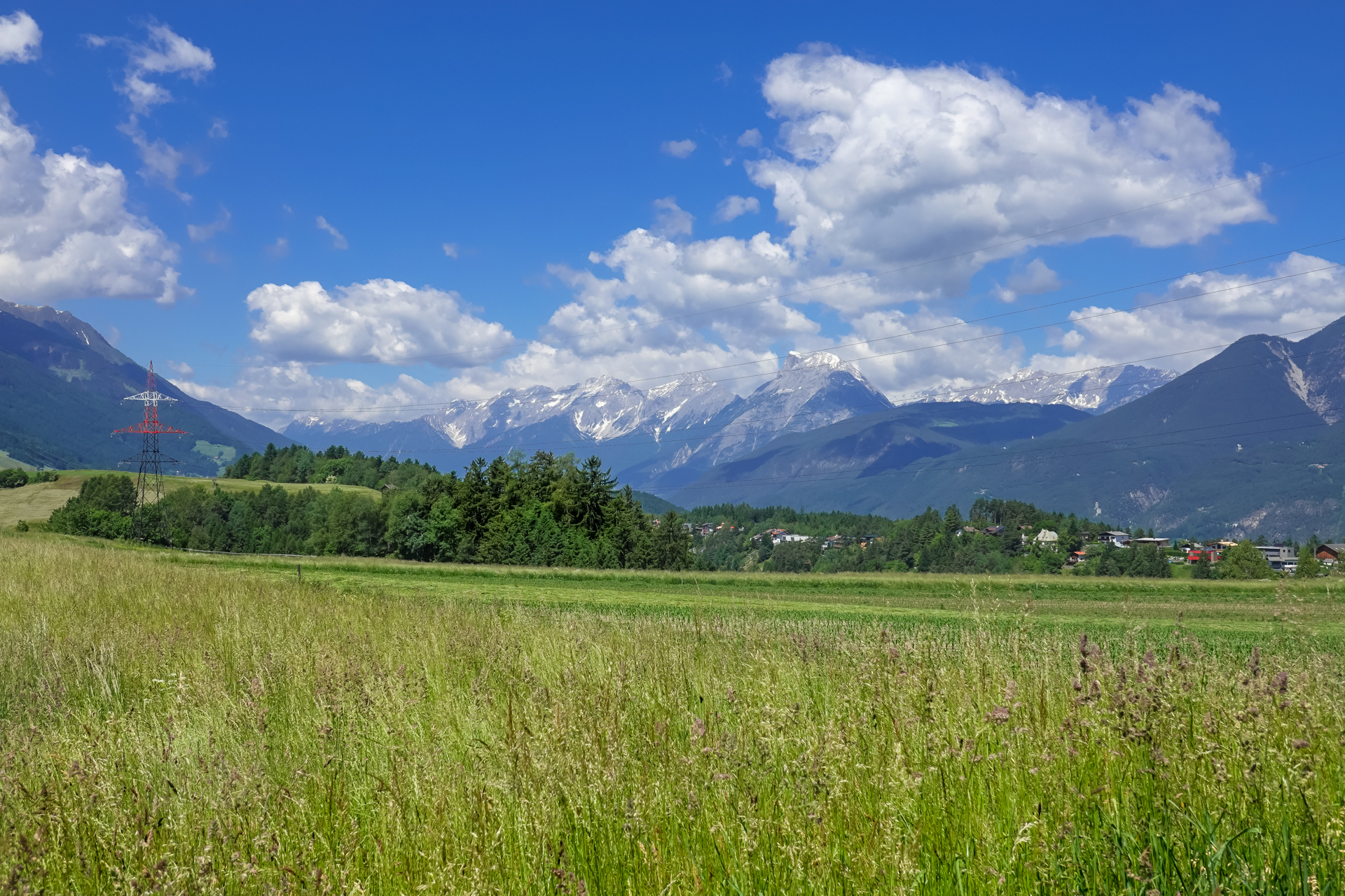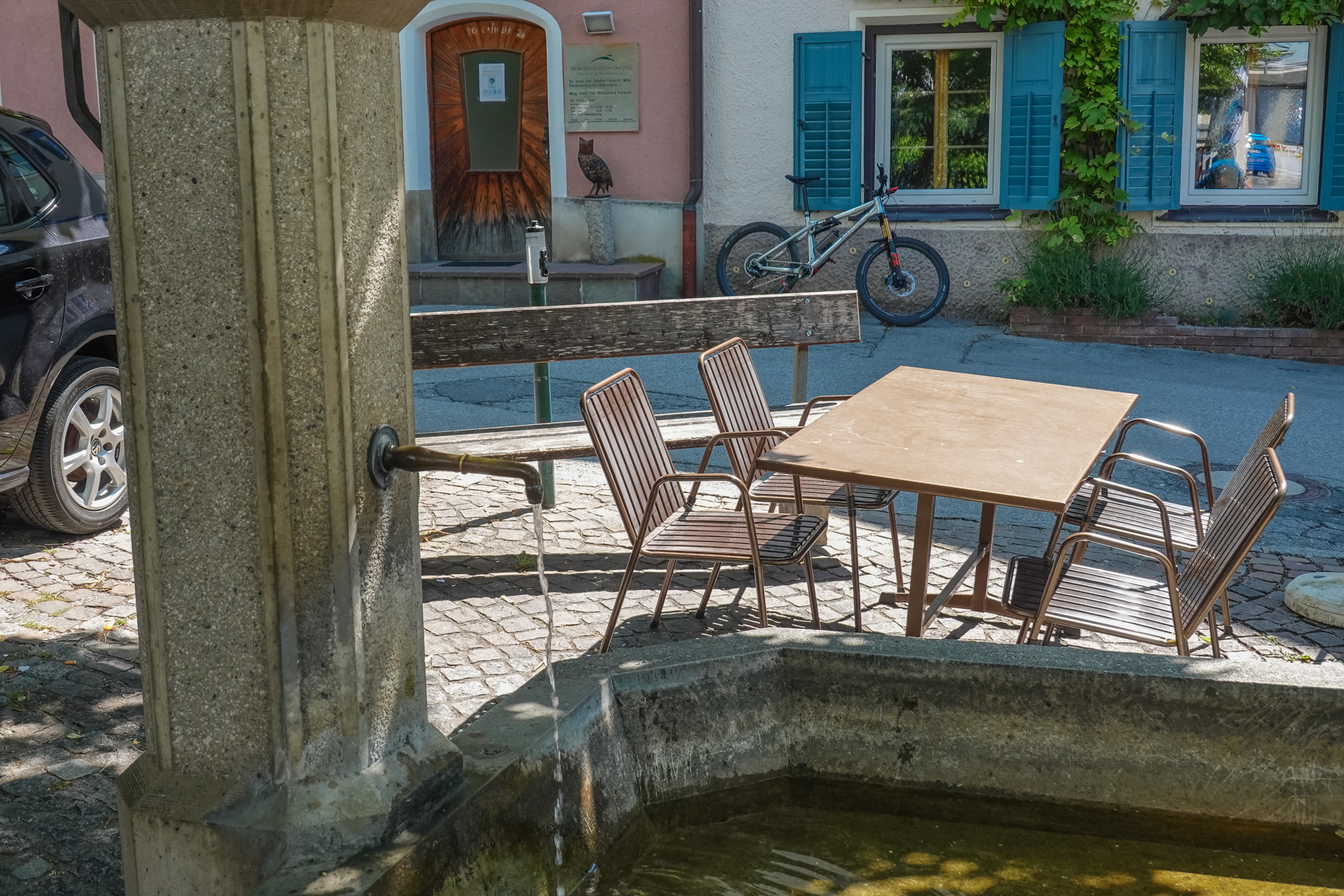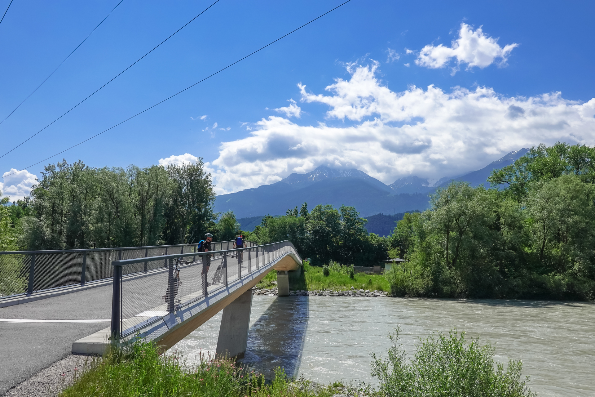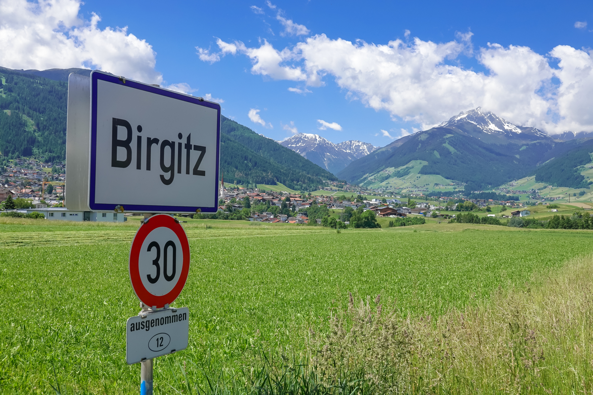 In Zirl füllen wir am Dorfbrunnen unsere Wasserflaschen, überqueren dann die neu gebaute Rad & Fußgängerbrücke über den Inn und weiter geht es auf Straße nach Kematen. Es ist schon sehr warm, 26 Grad zeigt das Thermometer an. Die nächsten 130 hm folgen wir eine kleinen Straße den Berg hinauf. Ein kleiner Brunnen lädt uns ein, den Kopf unter Wasser zu halten und abzukühlen. Jetzt gehts weiter hinauf nach Birgiz. Kleiner dialektischer Scherz am Rande: „Birgiz is da, wo´s Bier git“