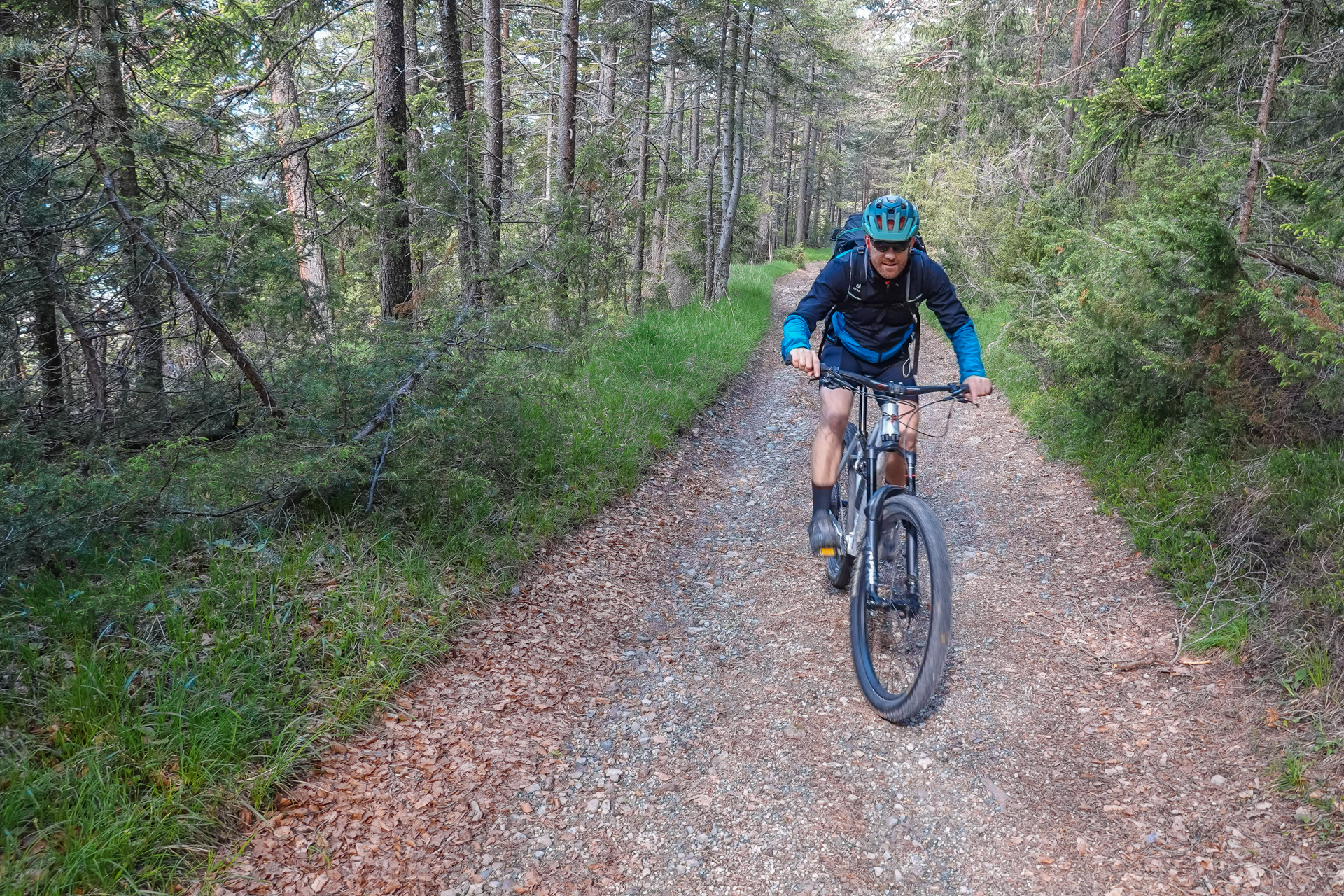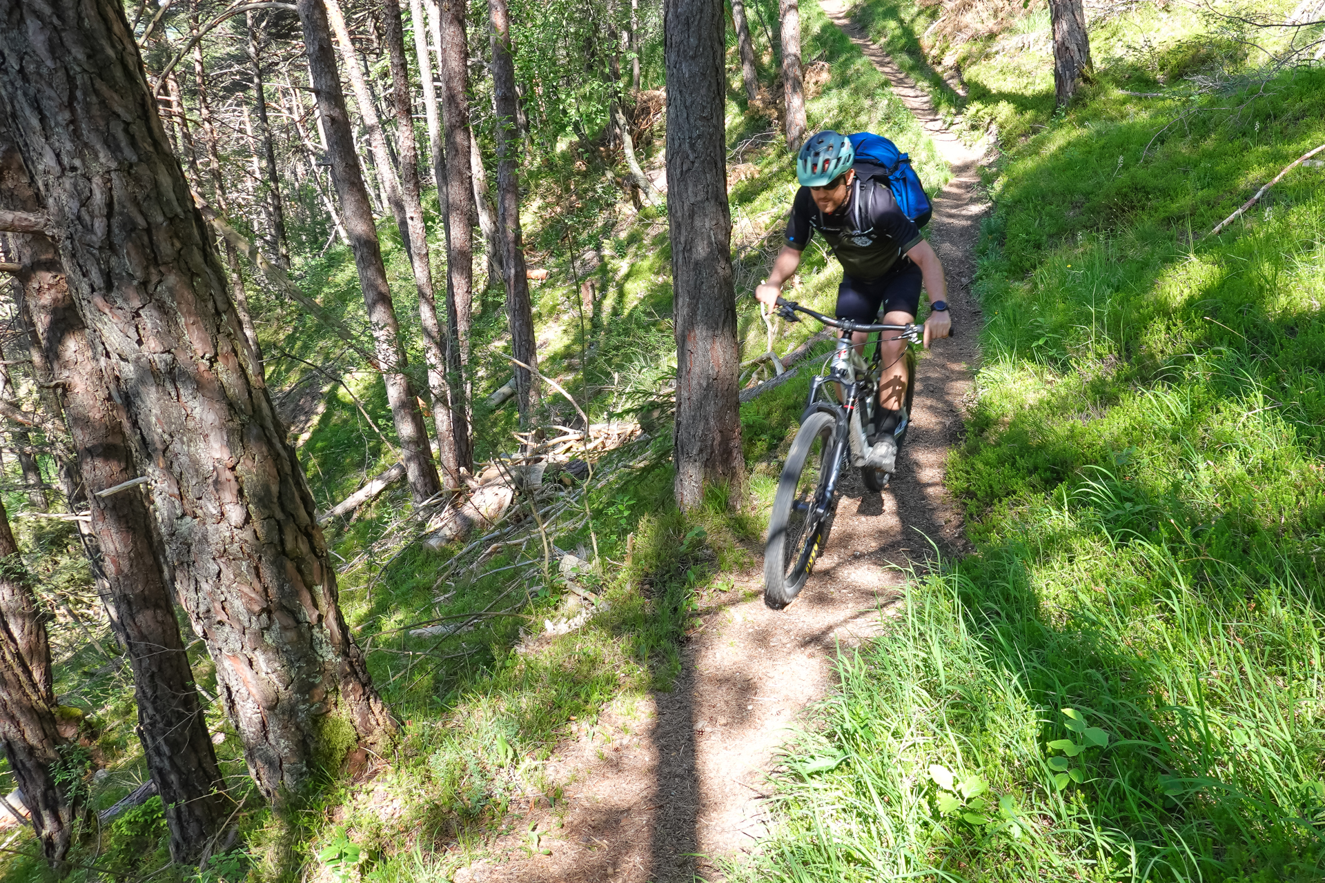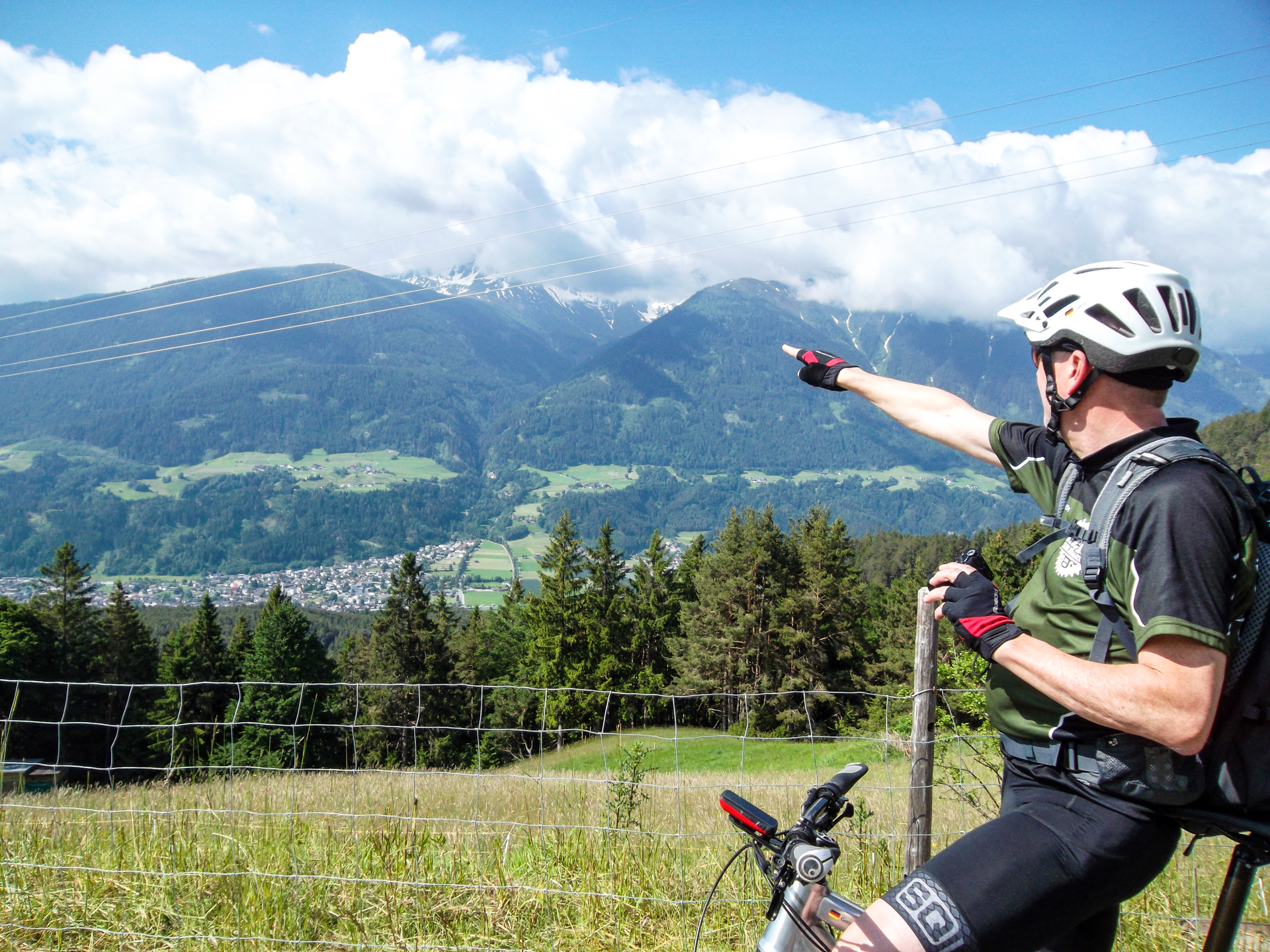Es startet, wie soll es auch anders sein, bergauf zum Sattel unterm Jochkreuz. 1,5 km und 200 hm weiter sind wir am höchsten Punkt unserer Tour auf 1.610 Meter angelangt. Telfes im Stubaital liegt auf 970 m, bedeutet es geht länger bergab – genau gesagt 11 Kilometer. Geil. Trails, Rodelwege, leichter Schotter wechseln sich ab und leider vergeht die Zeit bergab wie im Fluge – Schwups sind wir im Tal – auf leichtem Almweg fahren wir zum Etappenziel dem „Gröbner Hof“. Das waren heute hart erkämpfte aber nicht unglückliche 1.560 Meter bergauf.