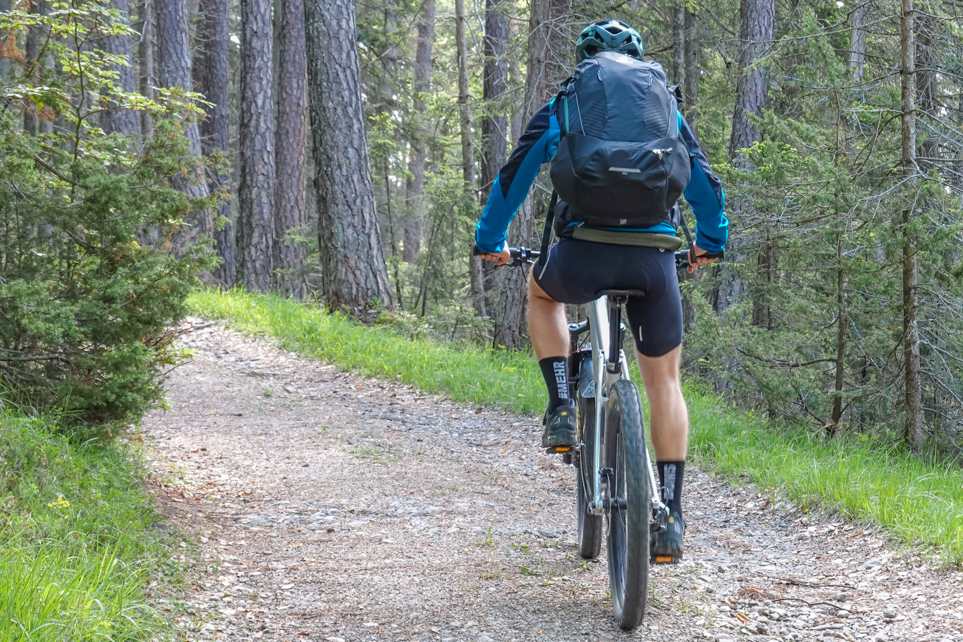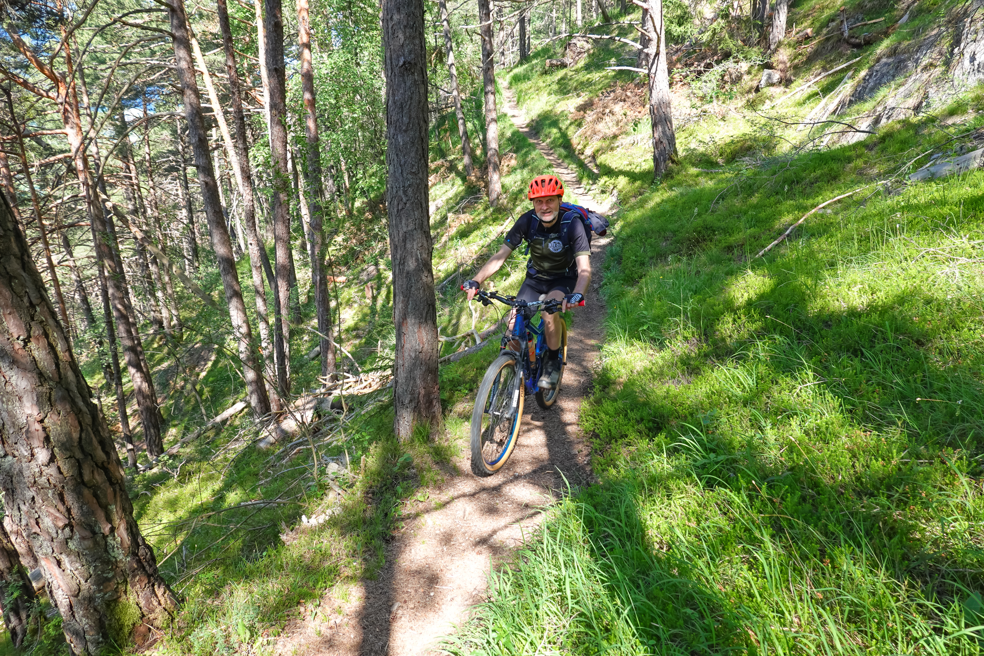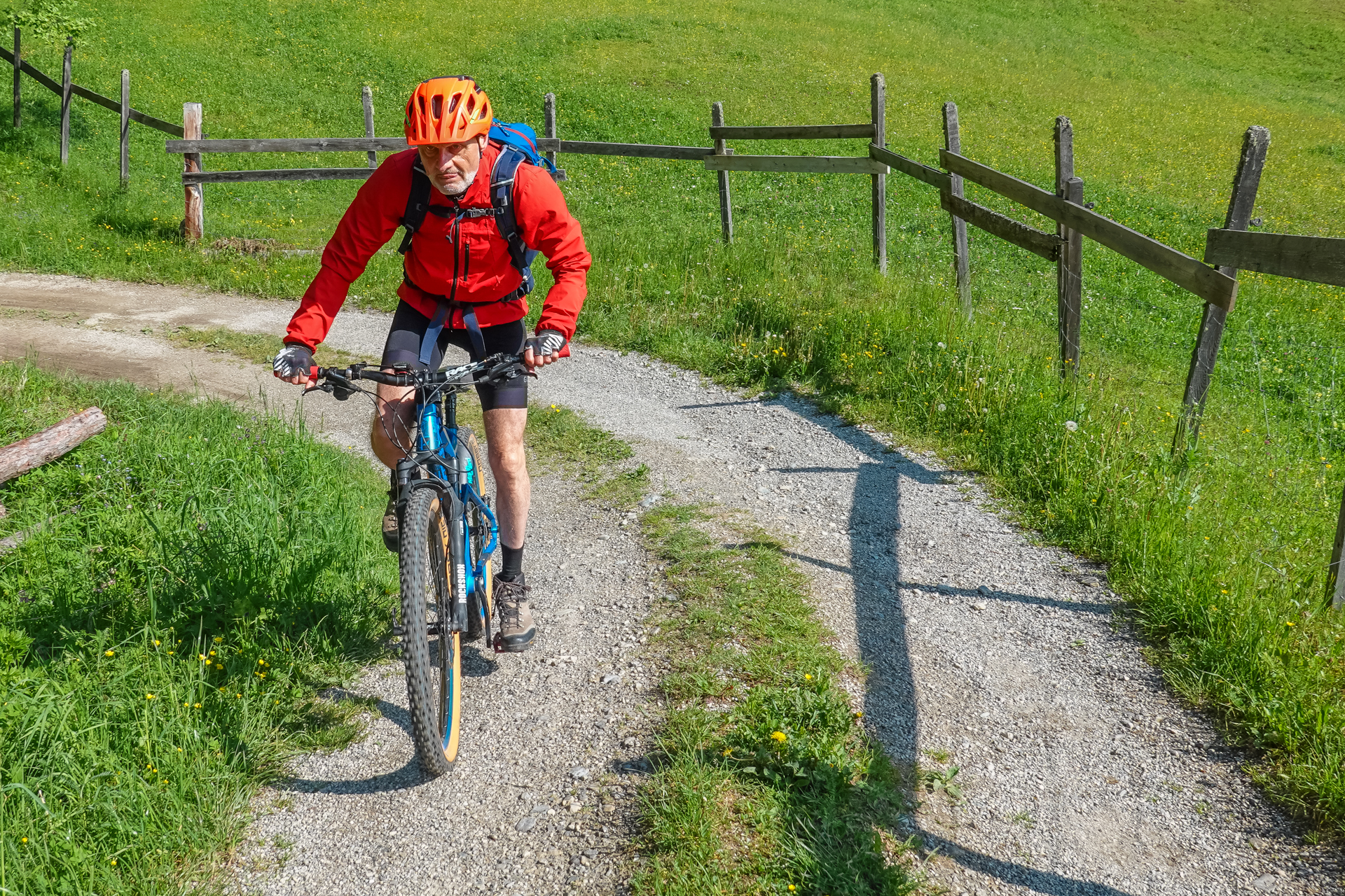 Es startet, wie soll es auch anders sein, bergauf zum Sattel unterm Jochkreuz. 1,5 km und 200 hm weiter sind wir am höchsten Punkt unserer Tour auf 1.610 Meter angelangt. Telfes im Stubaital liegt auf 970 m, bedeutet es geht länger bergab – genau gesagt 11 Kilometer. Geil. Trails, Rodelwege, leichter Schotter wechseln sich ab und leider vergeht die Zeit bergab wie im Fluge – Schwups sind wir im Tal – auf leichtem Almweg fahren wir zum Etappenziel dem „Gröbner Hof“. Das waren heute hart erkämpfte aber nicht unglückliche 1.560 Meter bergauf.