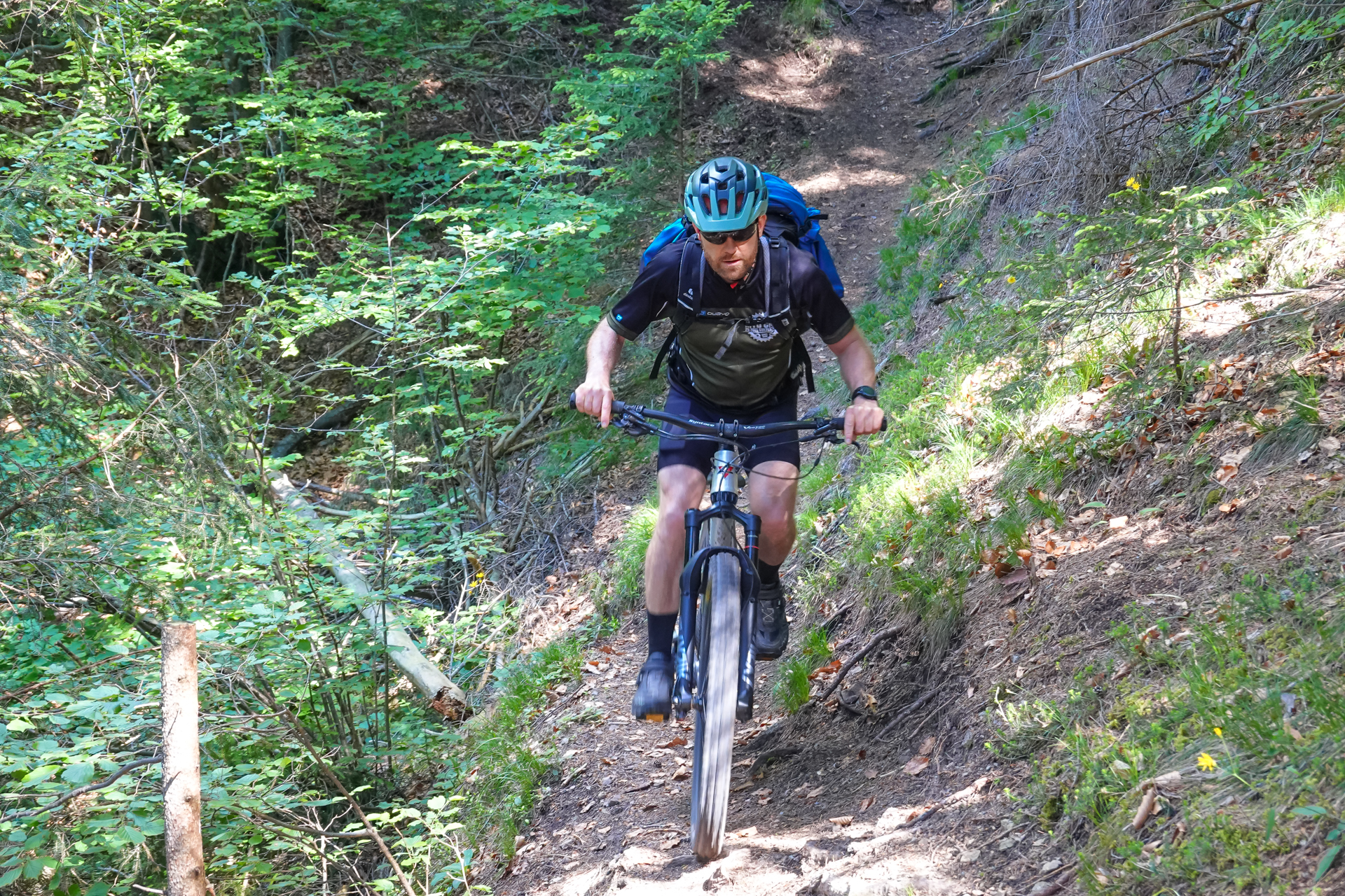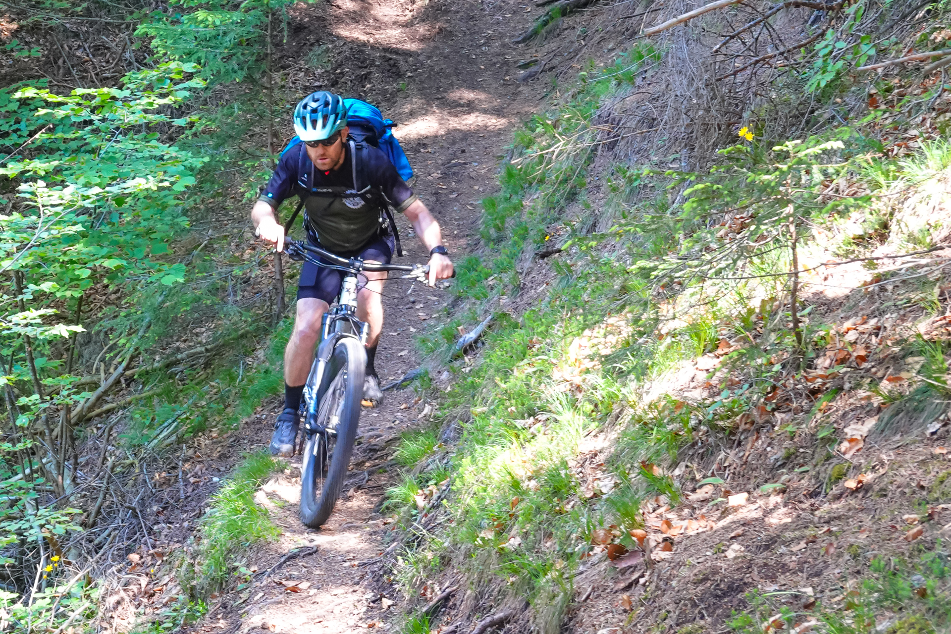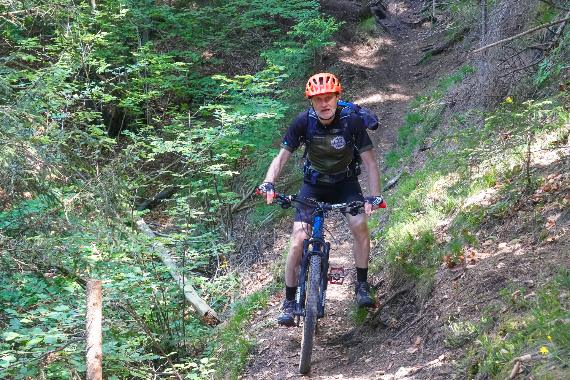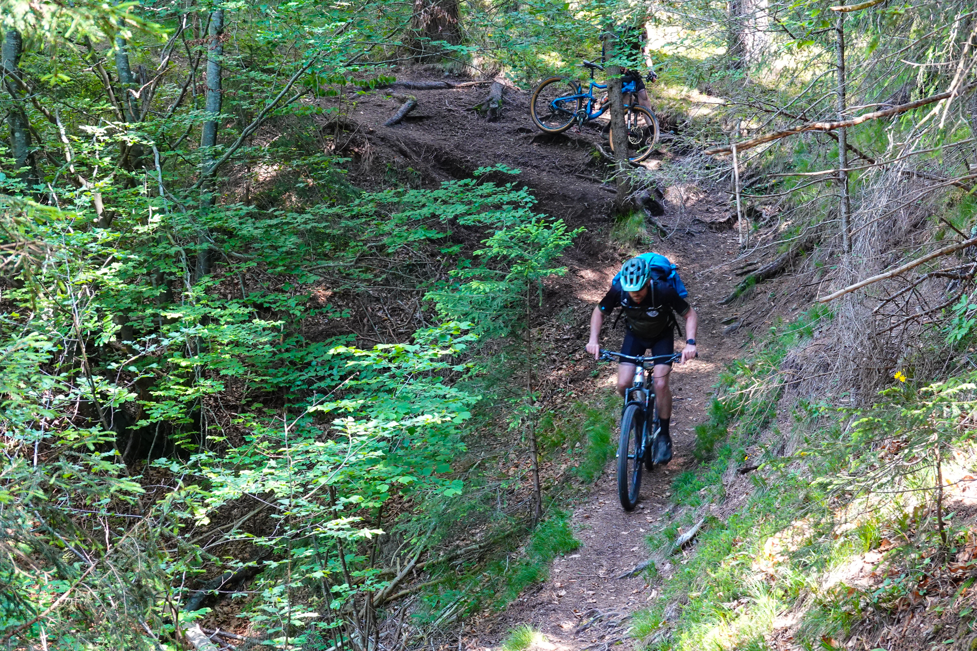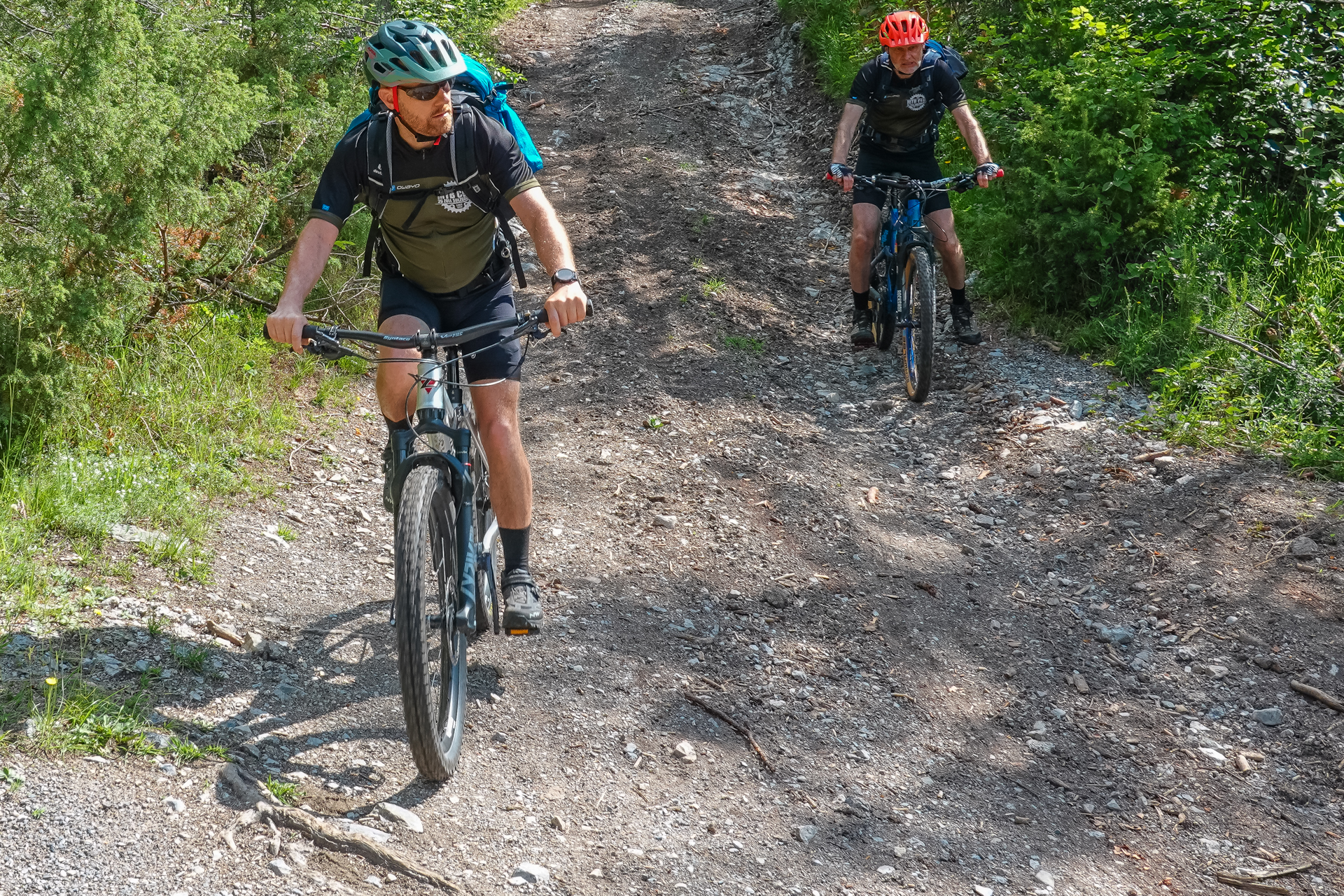 Zunächst umfahren wir den Gschwandkopf, kommen am Ortsausgang von Seefeld raus und ab da beginnt der tolle Pfad hinunter ins Tal. Der Erste Teil ist leicht verblockt, lässt sich aber dennoch immer gut fahren, der zweite Teil ist richtig flowig und ehe wir es merken sind wir schon wieder 700 hm hinunter gerauscht. Uwe & Lars steht es ins Gesicht geschrieben, sie hören gar nicht mehr auf zu grinsen so hat ihnen die Abfahrt gefallen.