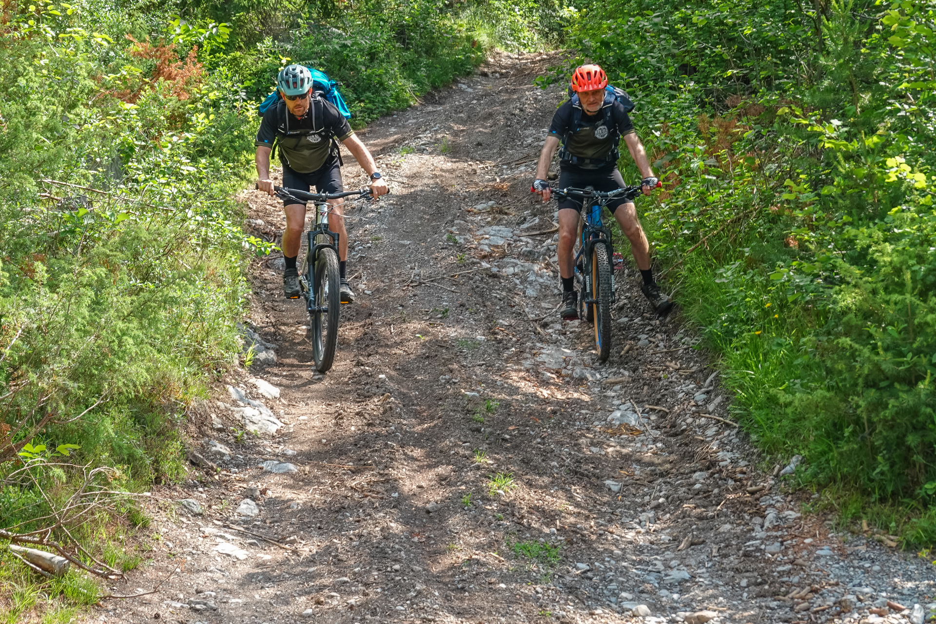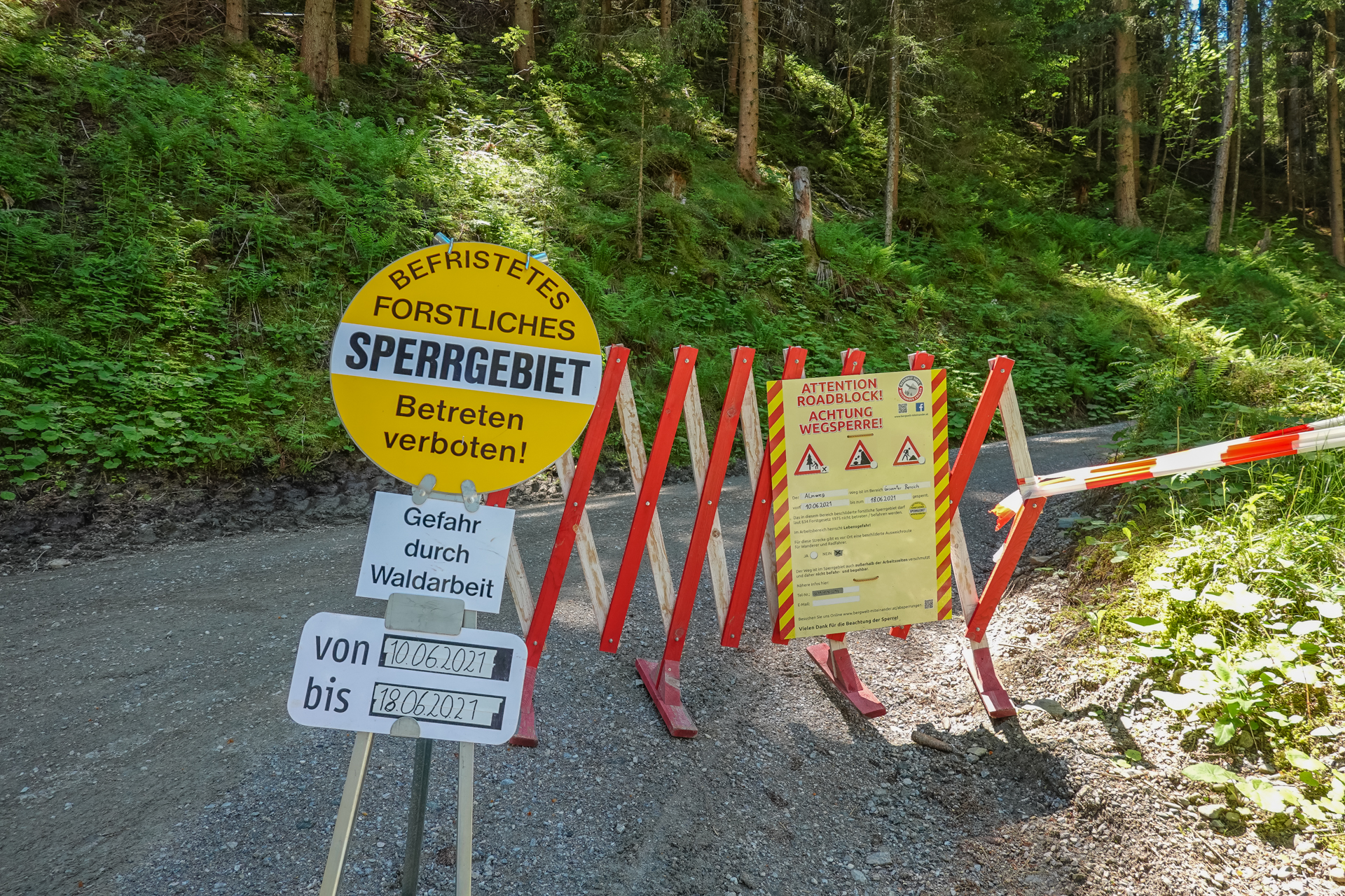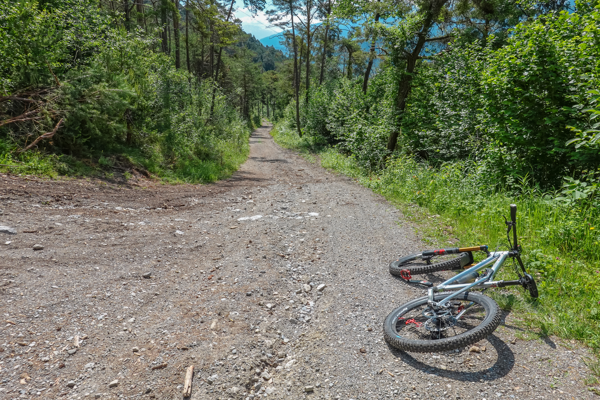 Die Hälfte haben wir geschafft, da stellt sich eine Sperrung in den Weg. Wegen Holzfällarbeiten und umgestürzter Bäume werden wir nicht direkt, sondern auf etwas leichterem, dafür aber längeren Weg hinauf geführt. Somit verpassen wir leider die Götzner Alm. Es ist warm, der Wald gibt zwar Schatten aber der Weg verlang heute viel von uns ab. Wir erreichen durchgewitzt die Gipfelstation der Mutterer Alm. Hier endet auch die Gondel, die von Innsbrucker Seite hinauf führt um Downhiller & Freerider auf dem Bikepark zu beglücken.