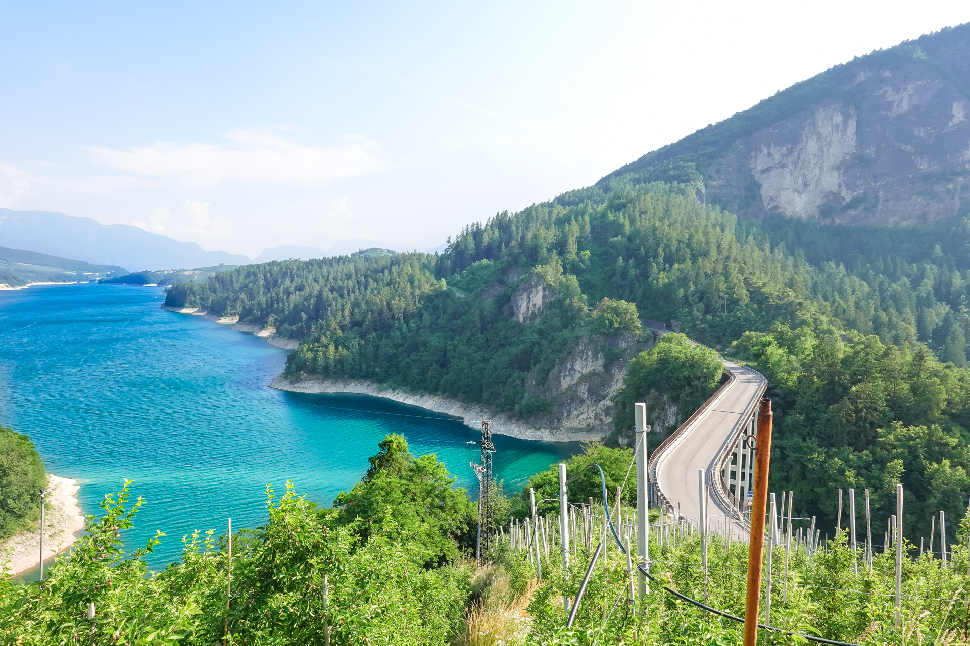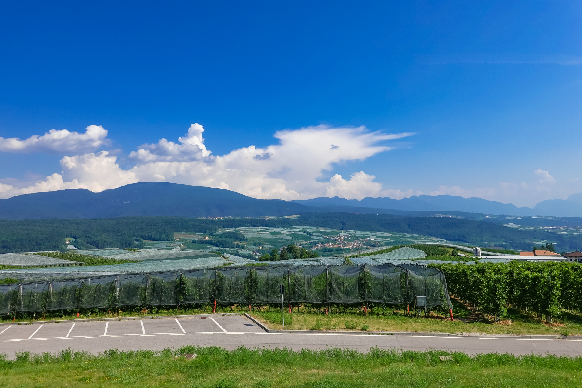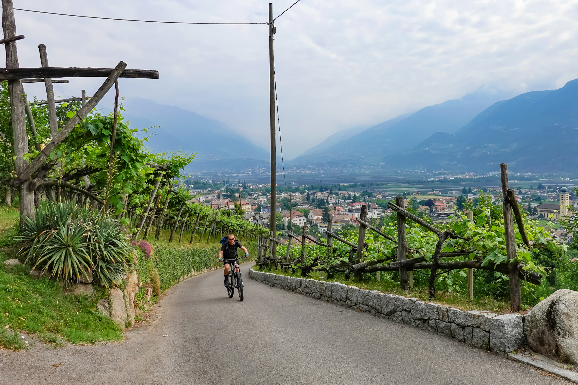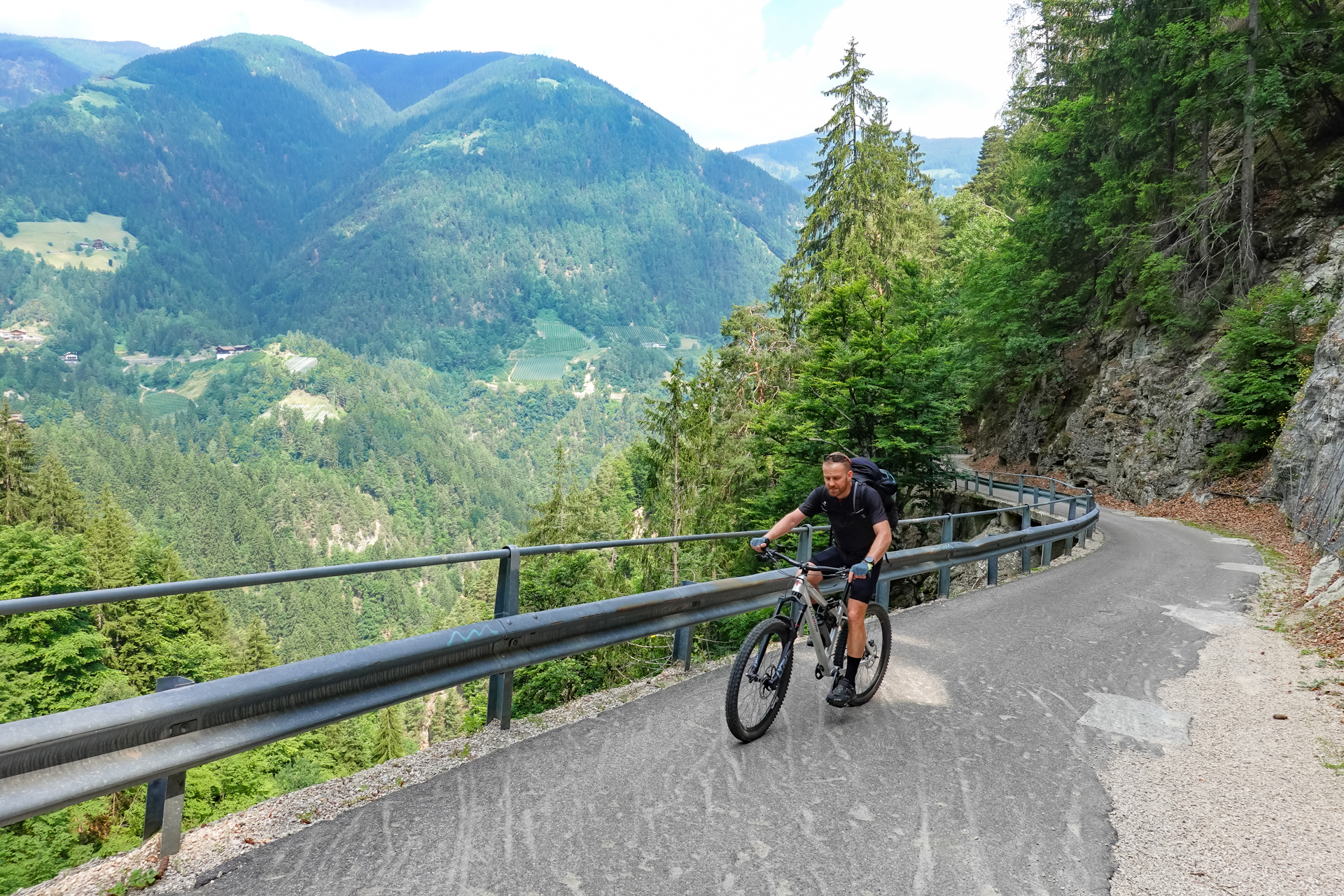Ein obligatorisches Foto vor dem Passschild, dann geht es hinunter nach „Unsere Liebe Frau im Walde“. Und ja, so heißt das Dorf wirklich. Ab hier beginnt der „Rankipino“-Radweg, der uns Verkehrsfrei hinunter ins Tal befördert. Der „Rankipino“ verläuft im Herzen der Magdalener Berge und verbindet den Gampenpass mit der Località Mostizzolo. Die Route verläuft oft auf kleinen Schotterwegen, weist keine technischen Schwierigkeiten auf. Es gibt nur wenige steile Abschnitte. Einige Abschnitt sind völlig eben, da der Weg öfter auf einem alten Bewässerungskanal verläuft. Wir befinden uns oberhalb der kultivierten Anbauflächen des Nonstals und seiner Plantagen. Apfelbäume, soweit das Auge reicht. Der Blick fällt über das Val di Non bis in die imposante Brenta. Es macht einfach nur Spaß, diesen Streckenabschnitt zu fahren. Seit dem Passübergang haben wir auf einer Länge von 26 km nur 150 Meter Höhe aber dafür 1.050 Meter bergab bewältigt. Einfach ein toller Abschnitt.