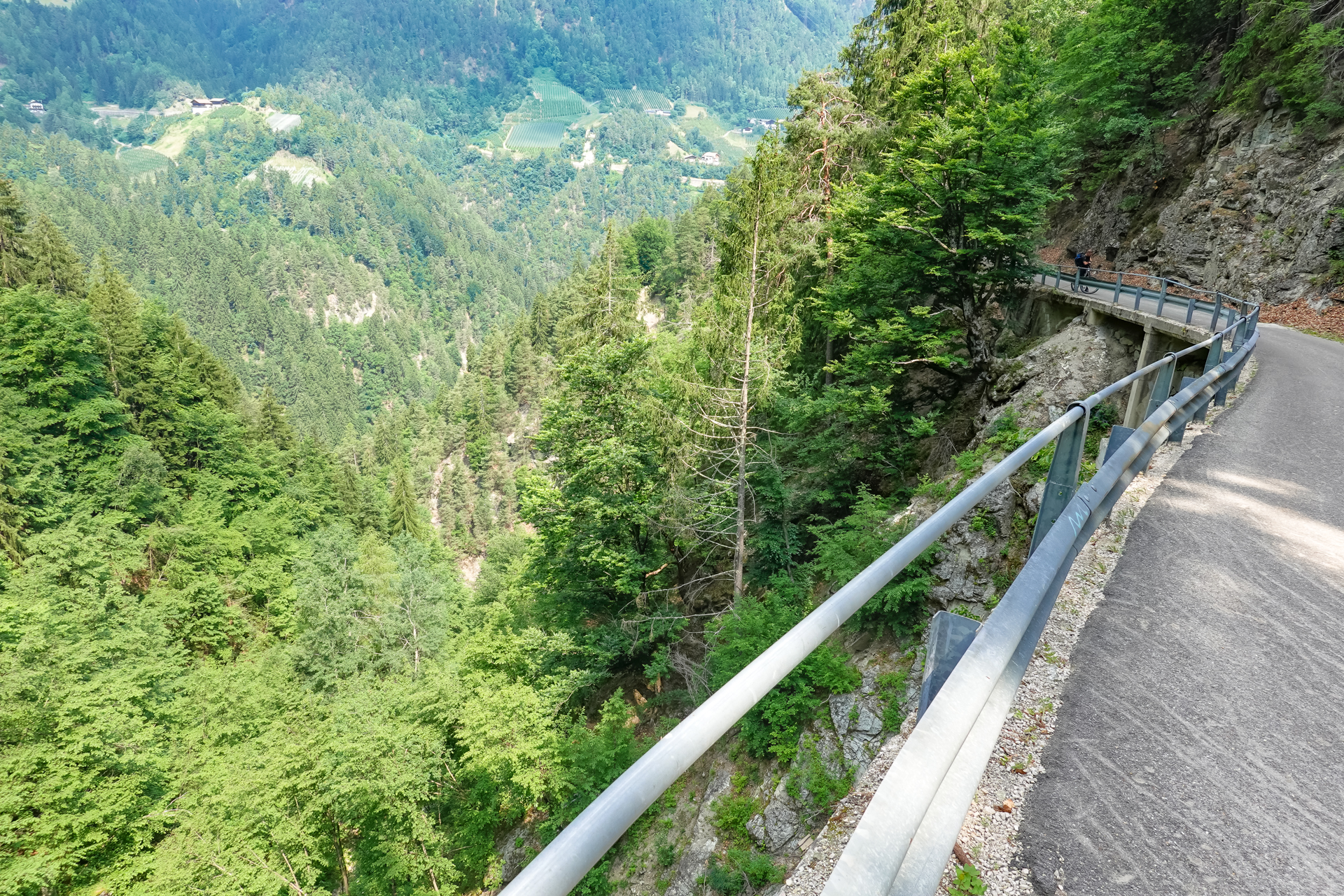 Nach dem Frühstück führt uns der Weg aber zunächst aus Meran hinaus Richtung Lana. Wir sind gerade mal auf 290 Meter. Jetzt wird es steil und anstrengend, denn die Straße hinauf ist wirklich sehr steil. Mein Navi zeigt mir öfter mal die 25% an. Nach 2 km gelangt man nach Weiler Rateis auf 590 m. Hier beruhigt sich das Ganze wieder und es wird angenehmer zu fahren. Wir sind froh, auf einer alten Teerdecke fahren zu dürfen, das macht den Aufstieg etwas angenehmer. Der Blick schweift immer wieder nach rechts hinunter ins Ultental und auf die umliegenden Berge.
