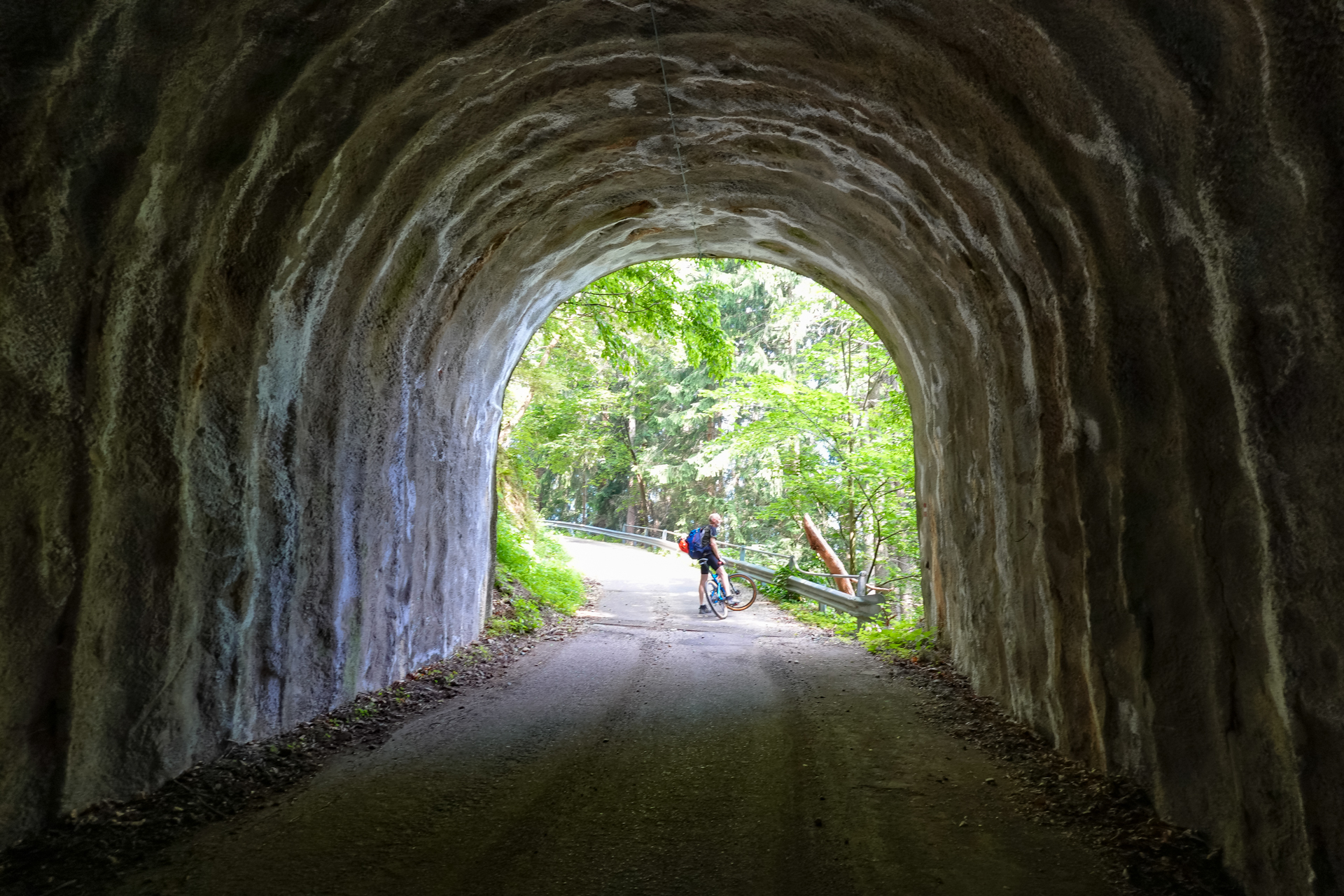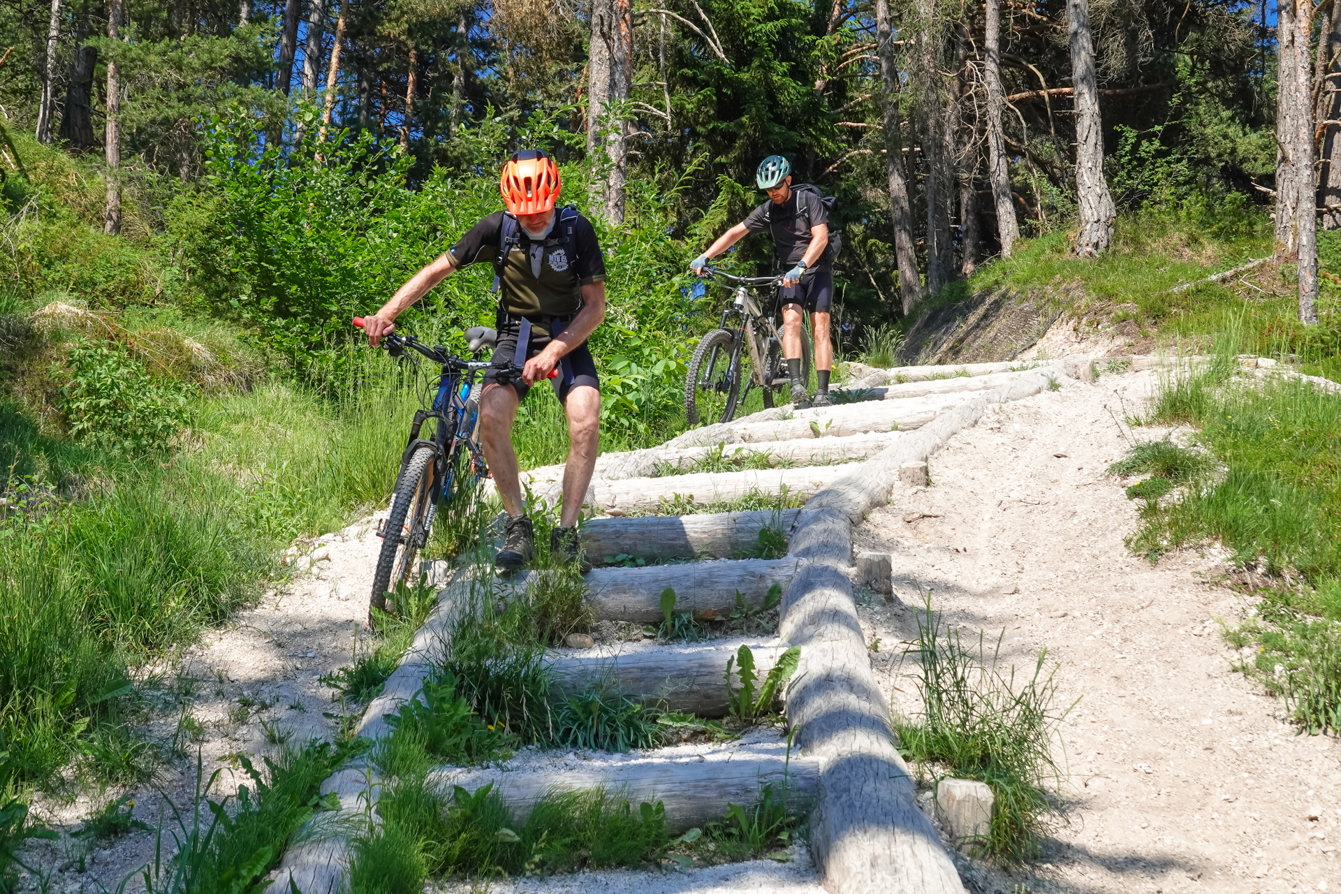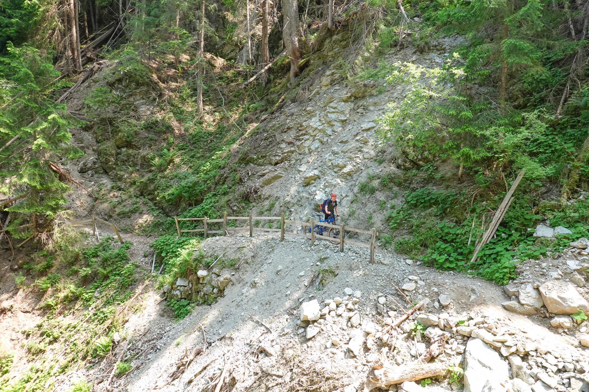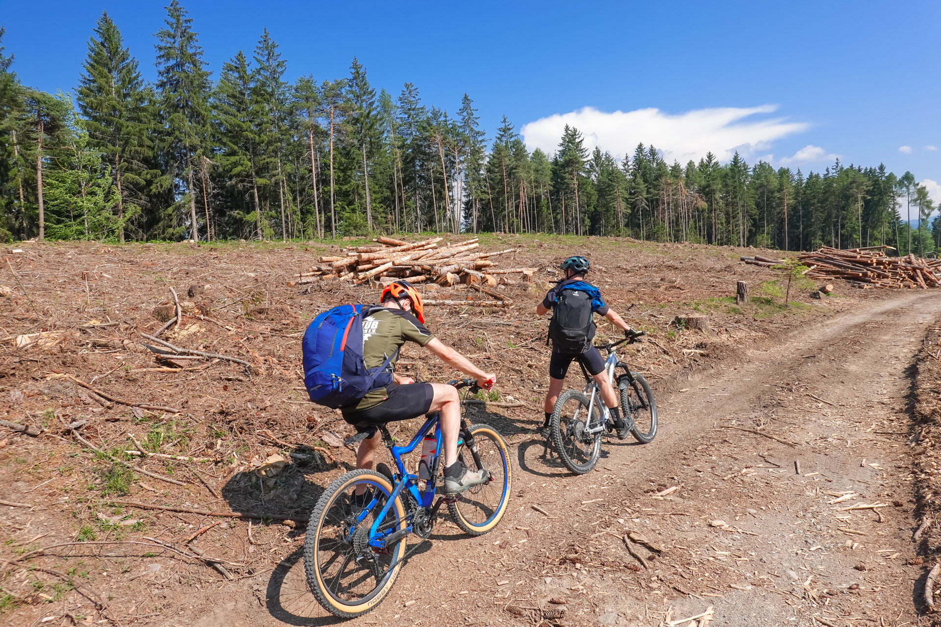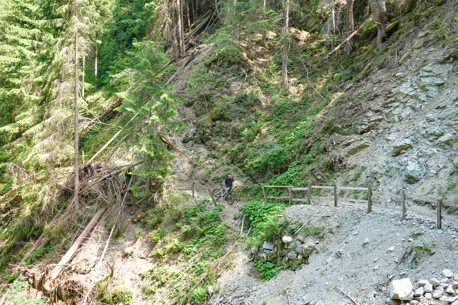 Wir durchqueren ein Tunnel, weitere 2 km geht es geteert bis zum Keilhof immer schön mit Bäumen beschattet. Der Weg wechselt sich dann von Schotter und Waldpfaden ab, teilweise kurze Abschnitte schiebend, dann wieder fahrend, bis wir letztendlich zur Gastwirtschaft Pfrolln auf 1.412 m kommen. Leider waren auch hier einige Bäume im Weg, aber alles in allem konnten wie diese immer umlaufen, oder haben zumindest die Möglichkeiten, die Räder drüber zu heben. Wir wollen noch nicht Einkehren, also weitere 150 Höhenmeter auf Forstwegen im Wald hinauf, bis wir den Sattel auf 1.564 m oberhalb des Platzer Jöchls passieren. Ab hier geht es zunächst bergab nach Platzers, dann mündet der Fortsweg auf die Straße und wir erreichen nach insgesamt 14 km und 1.400 Höhenmeter den Gampenpass. Jetzt ist erst mal Pause mit Kuchen und alkoholfreiem Weizenbier im gleichnamige Gasthaus angesagt.